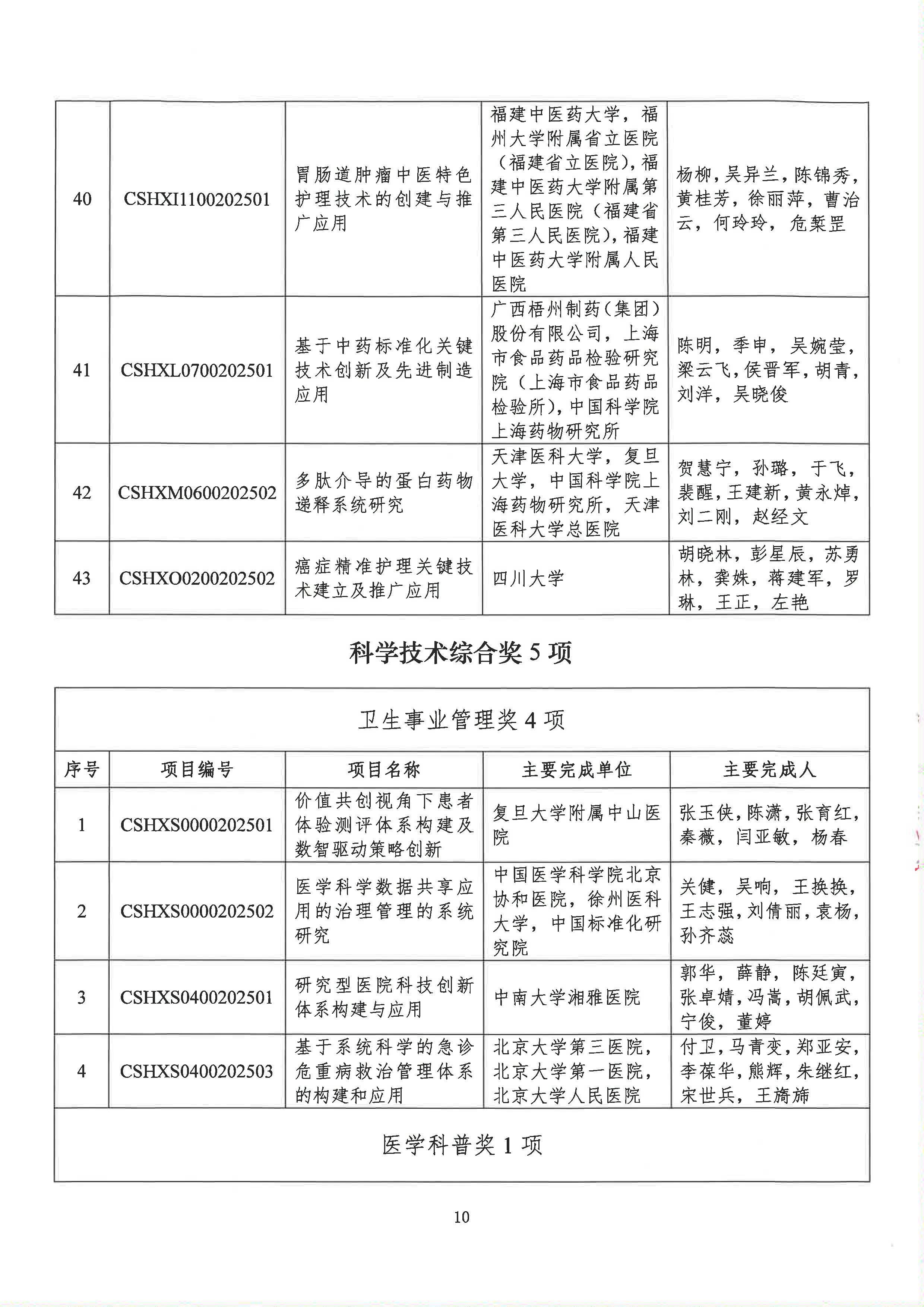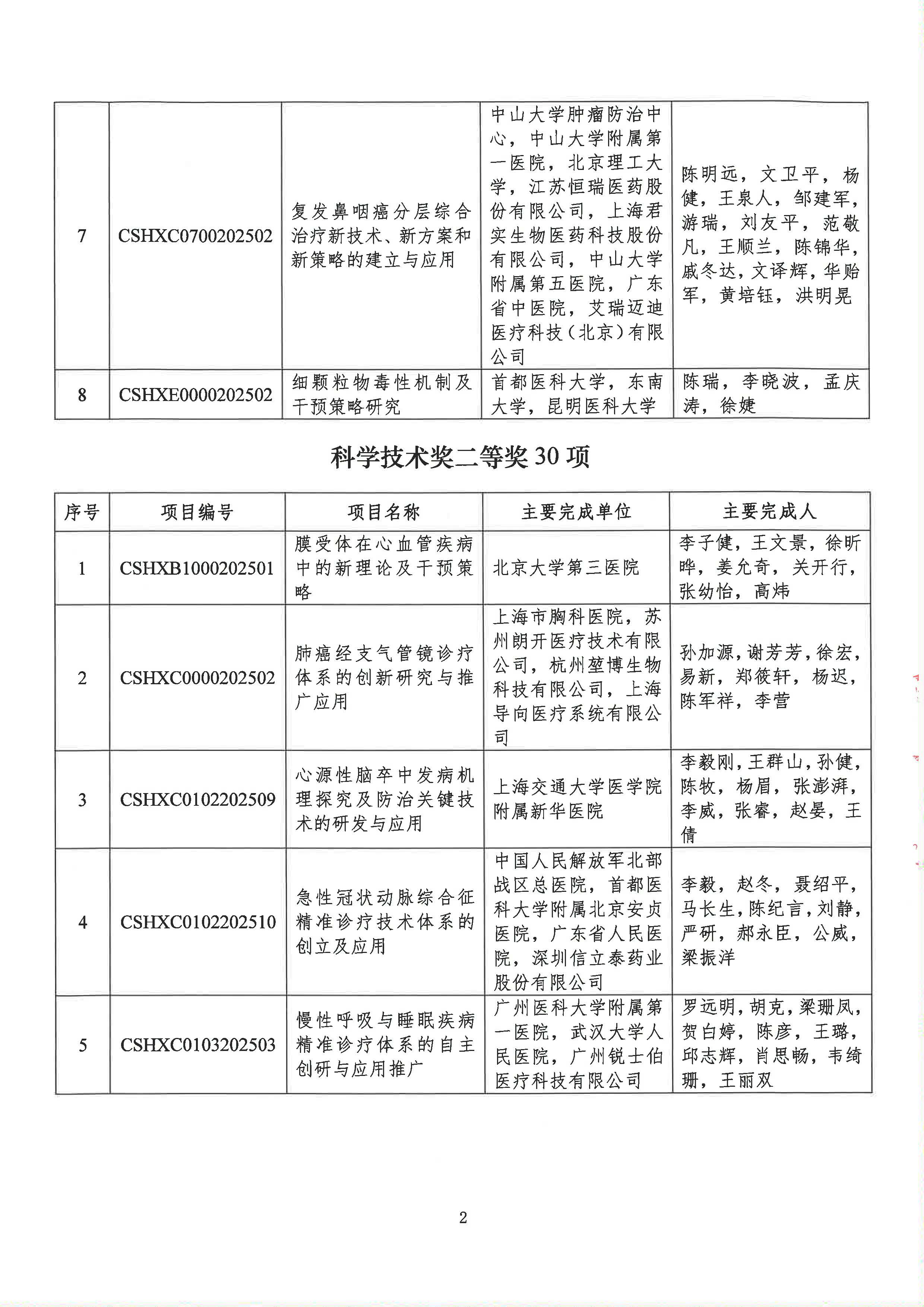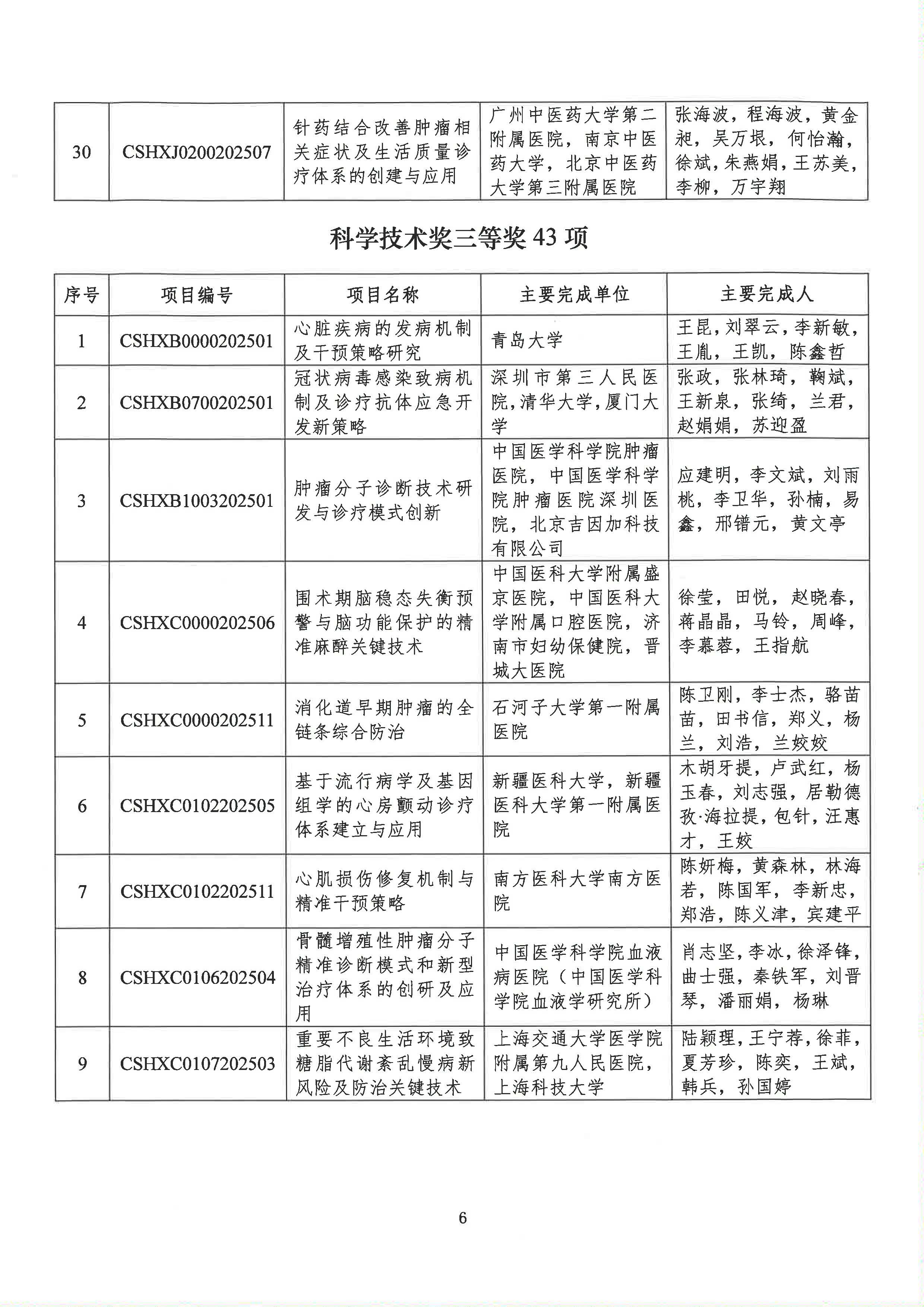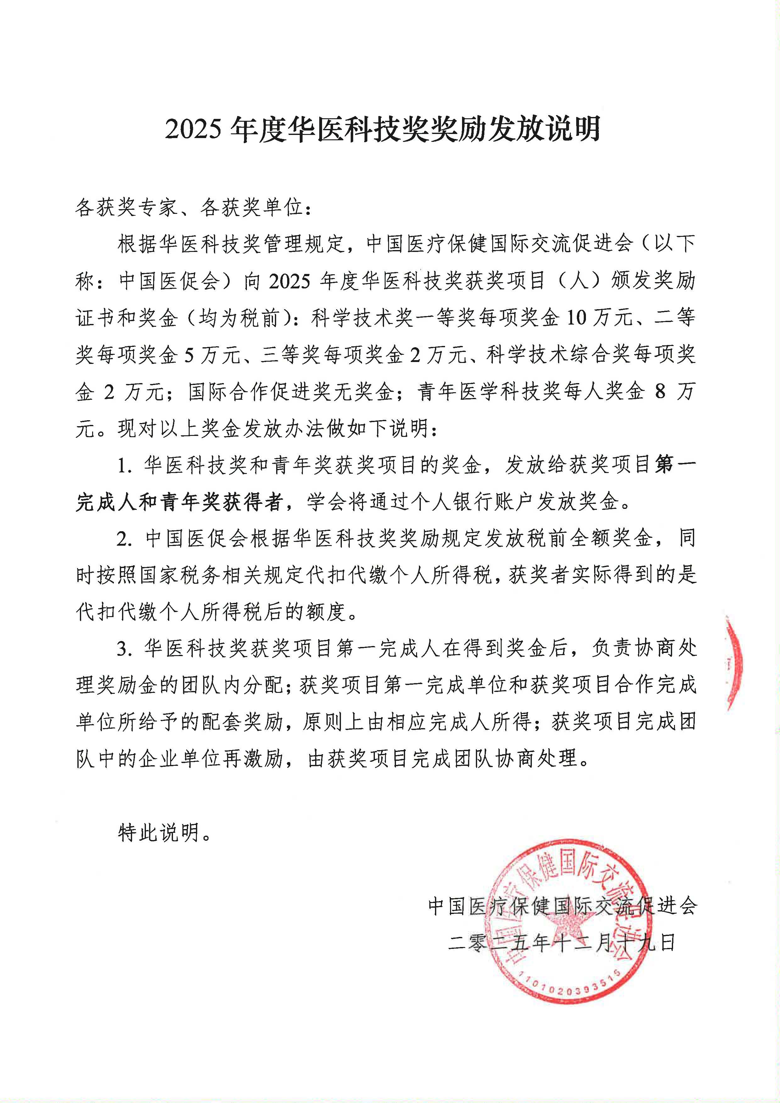 2025年度华医科技奖获奖项目(人)共包括华医科学技术奖一等奖8项、二等奖30项、三等奖43项、华医科学技术综合奖5项、华医国际合作促进奖1位、华医青年医学科技奖20位。