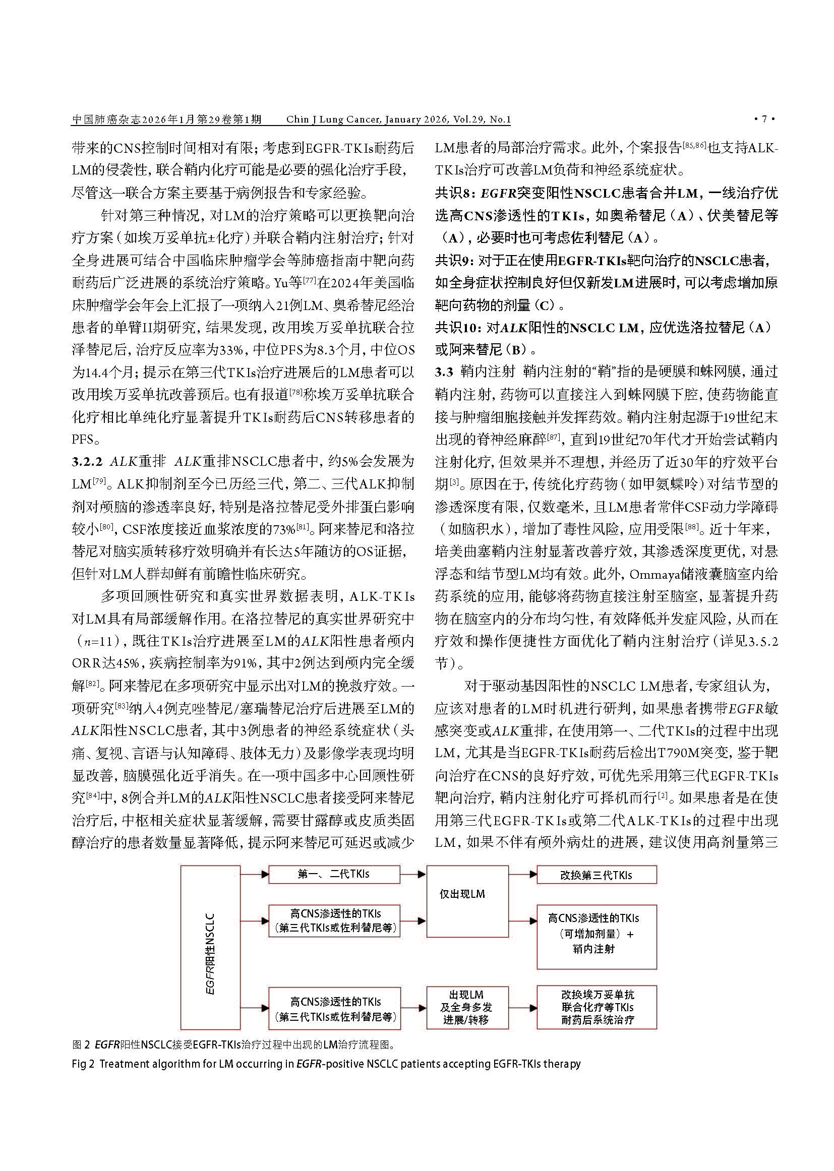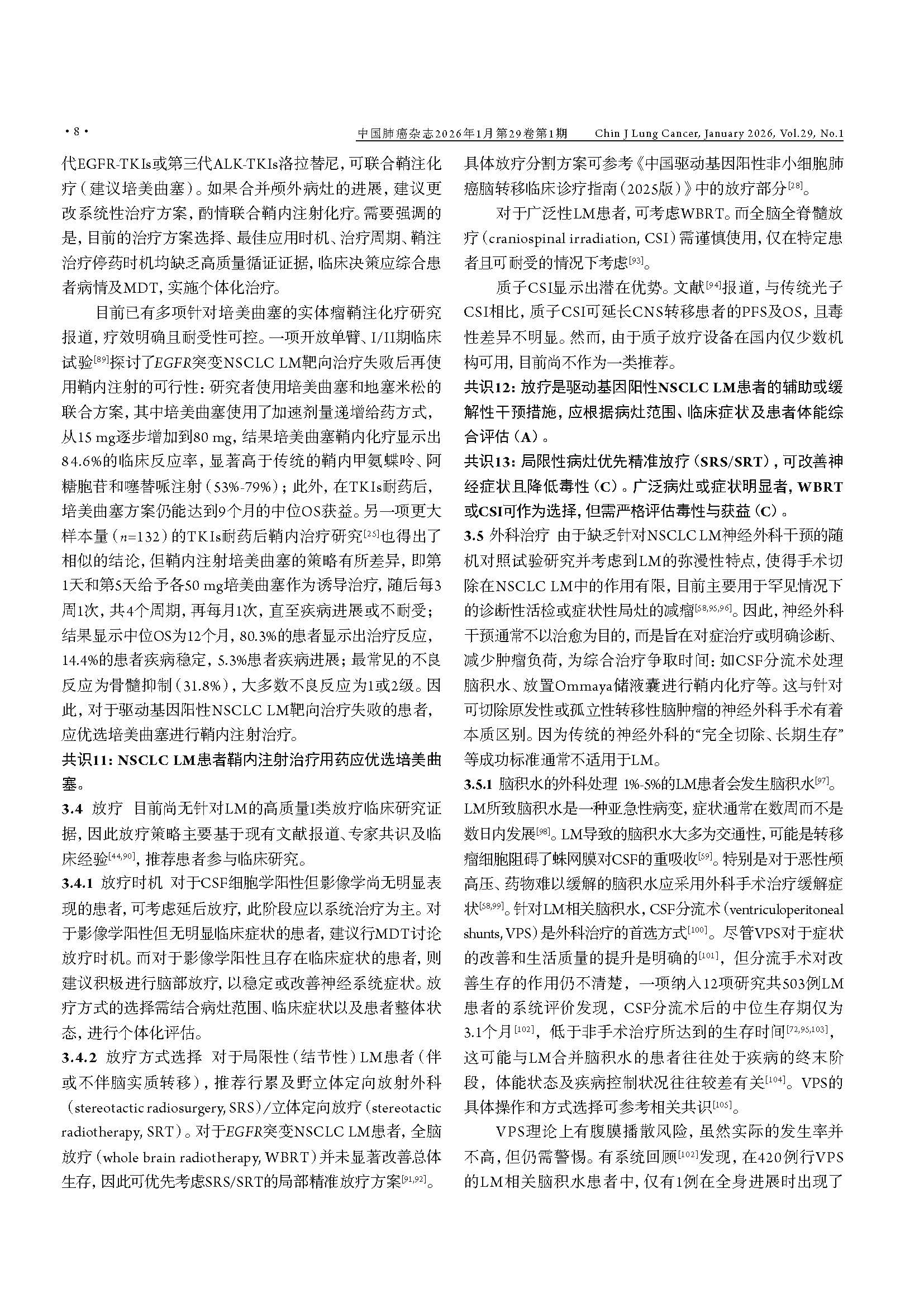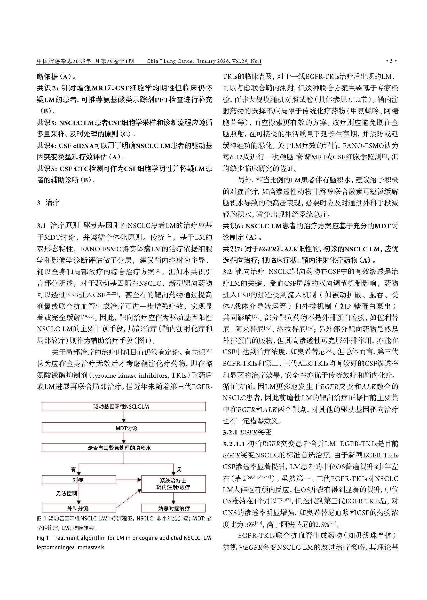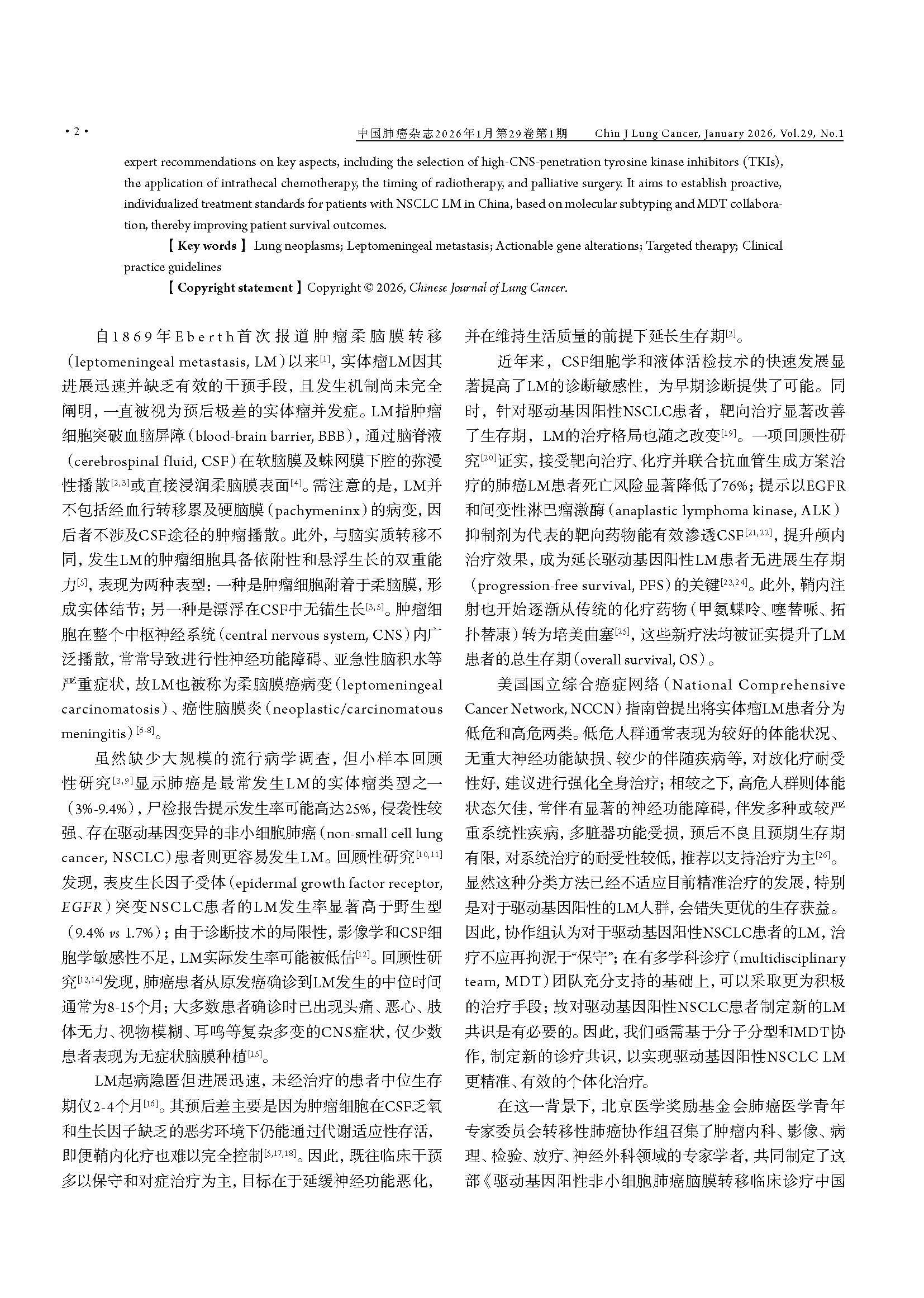 驱动基因阳性非小细胞肺癌脑膜转移临床诊疗中国专家共识(2026版) 引用本文:中国医药教育协会肺癌医学教育专业委员会, 北京医学奖励基金会肺癌医学青年专家委员会转移性肺癌协作组. 驱动基因阳性非小细胞肺癌脑膜转移临床诊疗中国专家共识(2026版). 中国肺癌杂志, 2026, 29(1): 1-14. 【摘要】非小细胞肺癌(non-small cell lung cancer, NSCLC)脑膜转移(leptomeningeal metastasis, LM)的预后极差,然而在驱动基因阳性患者中,高中枢神经系统(central nervous system, CNS)渗透性靶向药物的出现,正显著重塑治疗格局。现有指南多倾向于保守策略,已难以满足精准医学的需求。为应对此挑战,北京医学奖励基金会肺癌医学青年专家委员会转移性肺癌协作组组织肿瘤内科、影像学、病理学、放疗及神经外科等多学科专家,基于近10年的循证医学证据及临床实践经验,制定了《驱动基因阳性非小细胞肺癌脑膜转移临床诊疗中国专家共识(2026版)》。本共识强调,LM诊断应综合临床症状、磁共振成像(magnetic resonance imaging, MRI)及脑脊液(cerebrospinal fluid, CSF)细胞学结果进行判断,并突出CSF分子活检在明确驱动基因状态及疗效评估中的关键作用。在治疗方面,本共识倡导根本性范式转变:由多学科诊疗(multidisciplinary team, MDT)团队主导治疗,以高CNS渗透性靶向治疗作为一线干预措施,局部治疗(如鞘内注射及放疗)则定位为辅助手段;共识针对高CNS渗透性酪氨酸激酶抑制剂(tyrosine kinase inhibitors, TKIs)的选择、鞘内化疗的应用、放疗时机及外科姑息治疗等关键环节,提供了一系列专家推荐,旨在为中国NSCLC LM患者确立基于分子分型和MDT协作的积极个体化治疗规范,从而提升患者生存水平。 【关键词】肺肿瘤;脑膜转移;驱动基因;靶向治疗;临床诊疗指南