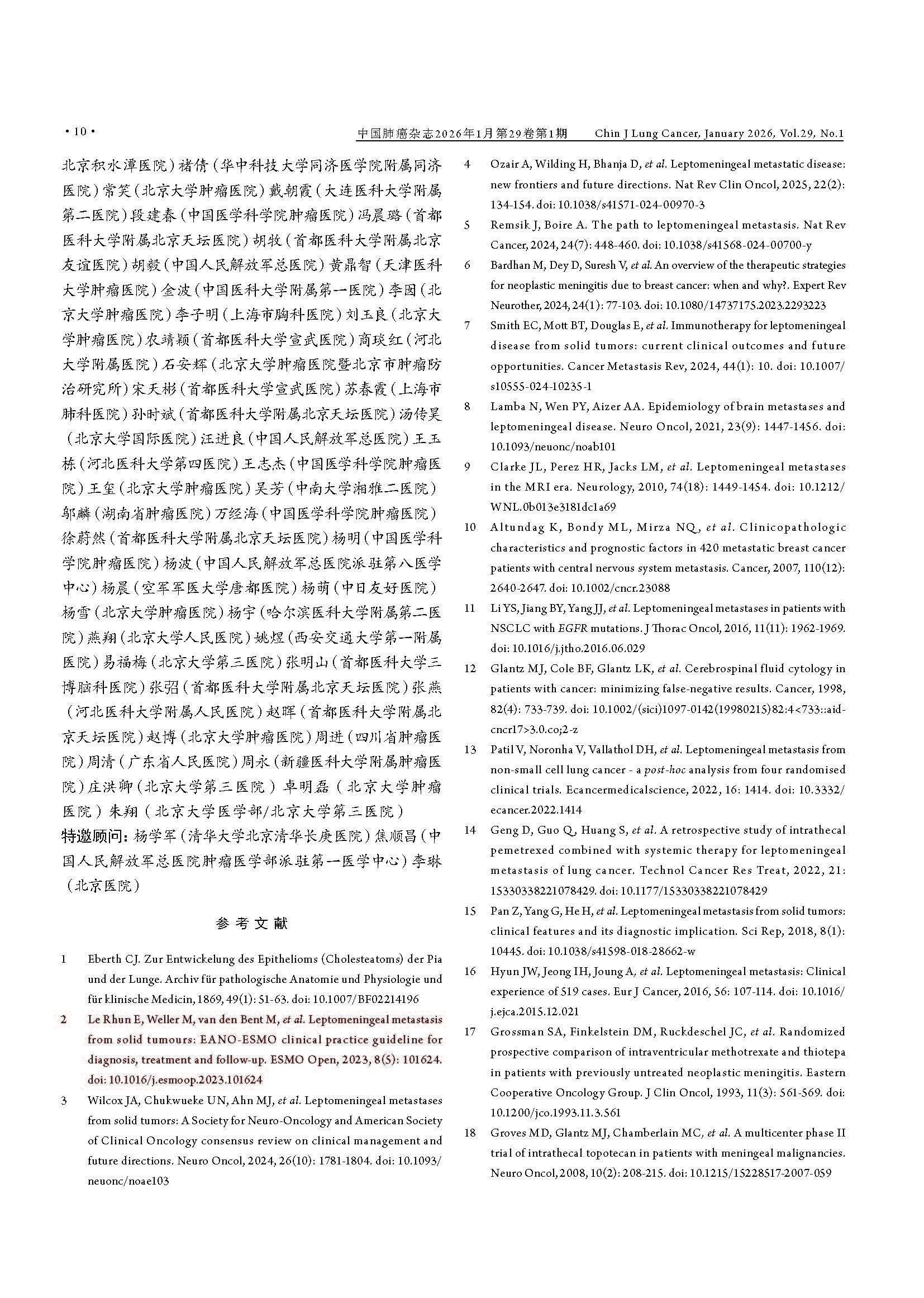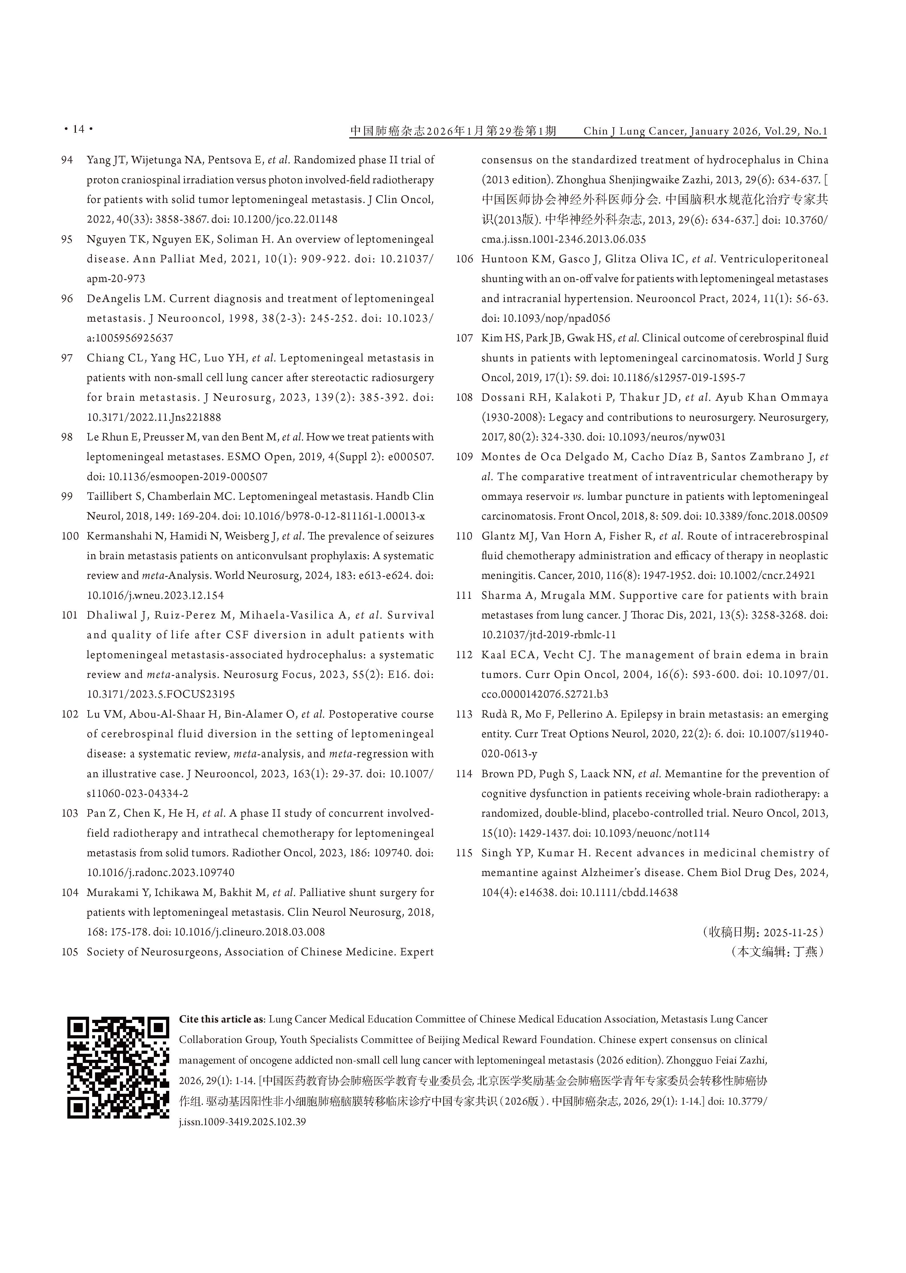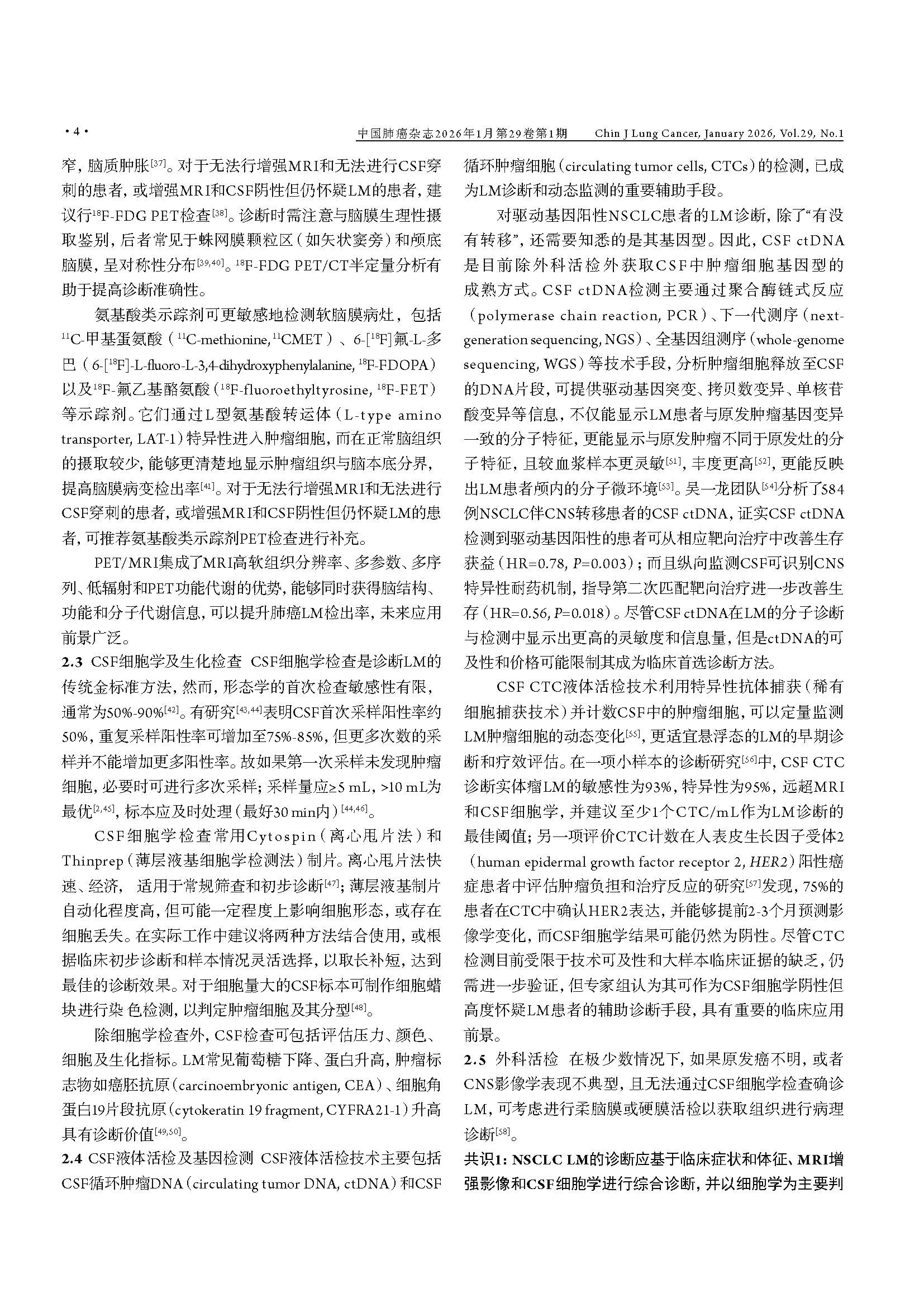 驱动基因阳性非小细胞肺癌脑膜转移临床诊疗中国专家共识(2026版) 引用本文:中国医药教育协会肺癌医学教育专业委员会, 北京医学奖励基金会肺癌医学青年专家委员会转移性肺癌协作组. 驱动基因阳性非小细胞肺癌脑膜转移临床诊疗中国专家共识(2026版). 中国肺癌杂志, 2026, 29(1): 1-14. 【摘要】非小细胞肺癌(non-small cell lung cancer, NSCLC)脑膜转移(leptomeningeal metastasis, LM)的预后极差,然而在驱动基因阳性患者中,高中枢神经系统(central nervous system, CNS)渗透性靶向药物的出现,正显著重塑治疗格局。现有指南多倾向于保守策略,已难以满足精准医学的需求。为应对此挑战,北京医学奖励基金会肺癌医学青年专家委员会转移性肺癌协作组组织肿瘤内科、影像学、病理学、放疗及神经外科等多学科专家,基于近10年的循证医学证据及临床实践经验,制定了《驱动基因阳性非小细胞肺癌脑膜转移临床诊疗中国专家共识(2026版)》。本共识强调,LM诊断应综合临床症状、磁共振成像(magnetic resonance imaging, MRI)及脑脊液(cerebrospinal fluid, CSF)细胞学结果进行判断,并突出CSF分子活检在明确驱动基因状态及疗效评估中的关键作用。在治疗方面,本共识倡导根本性范式转变:由多学科诊疗(multidisciplinary team, MDT)团队主导治疗,以高CNS渗透性靶向治疗作为一线干预措施,局部治疗(如鞘内注射及放疗)则定位为辅助手段;共识针对高CNS渗透性酪氨酸激酶抑制剂(tyrosine kinase inhibitors, TKIs)的选择、鞘内化疗的应用、放疗时机及外科姑息治疗等关键环节,提供了一系列专家推荐,旨在为中国NSCLC LM患者确立基于分子分型和MDT协作的积极个体化治疗规范,从而提升患者生存水平。 【关键词】肺肿瘤;脑膜转移;驱动基因;靶向治疗;临床诊疗指南