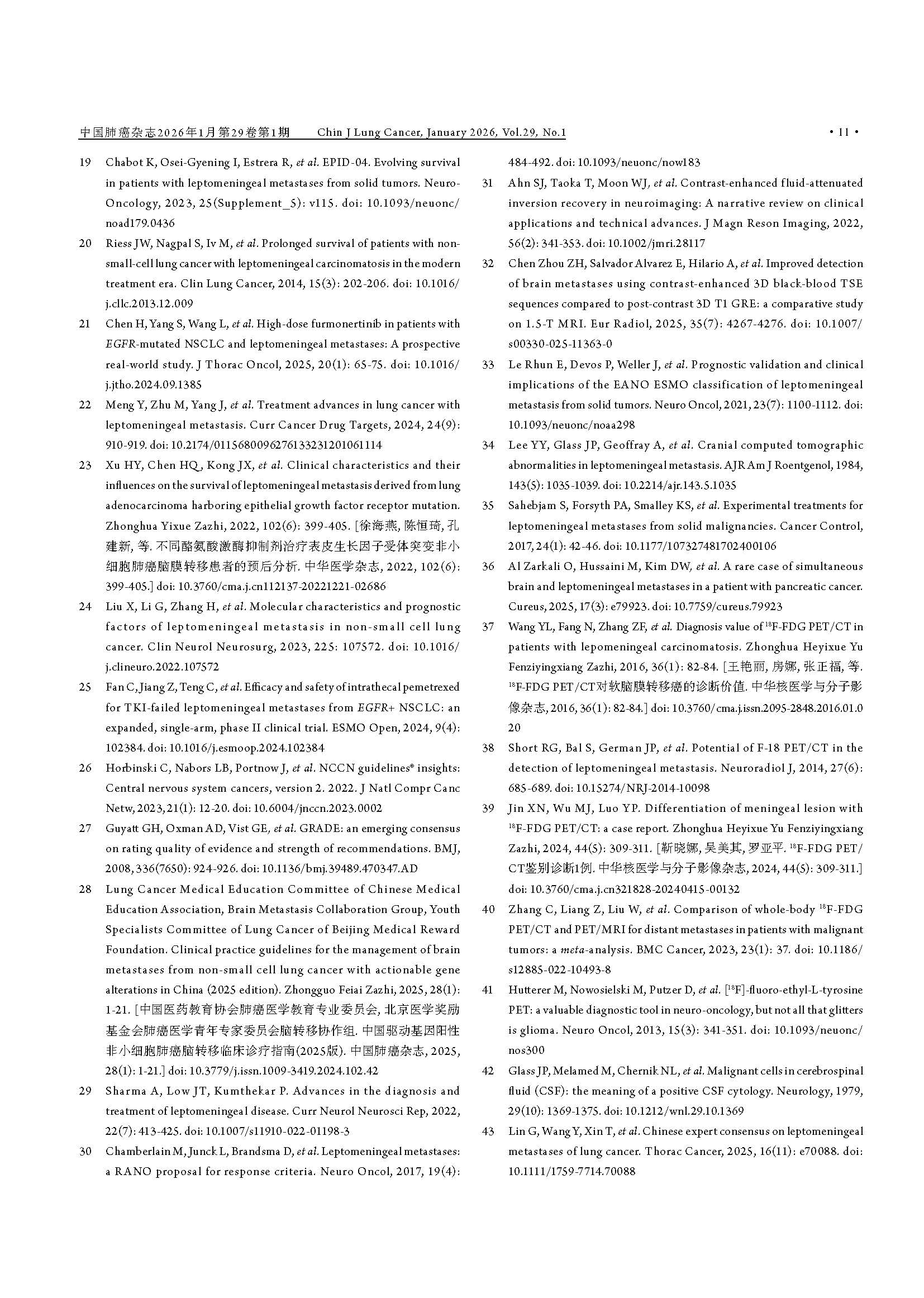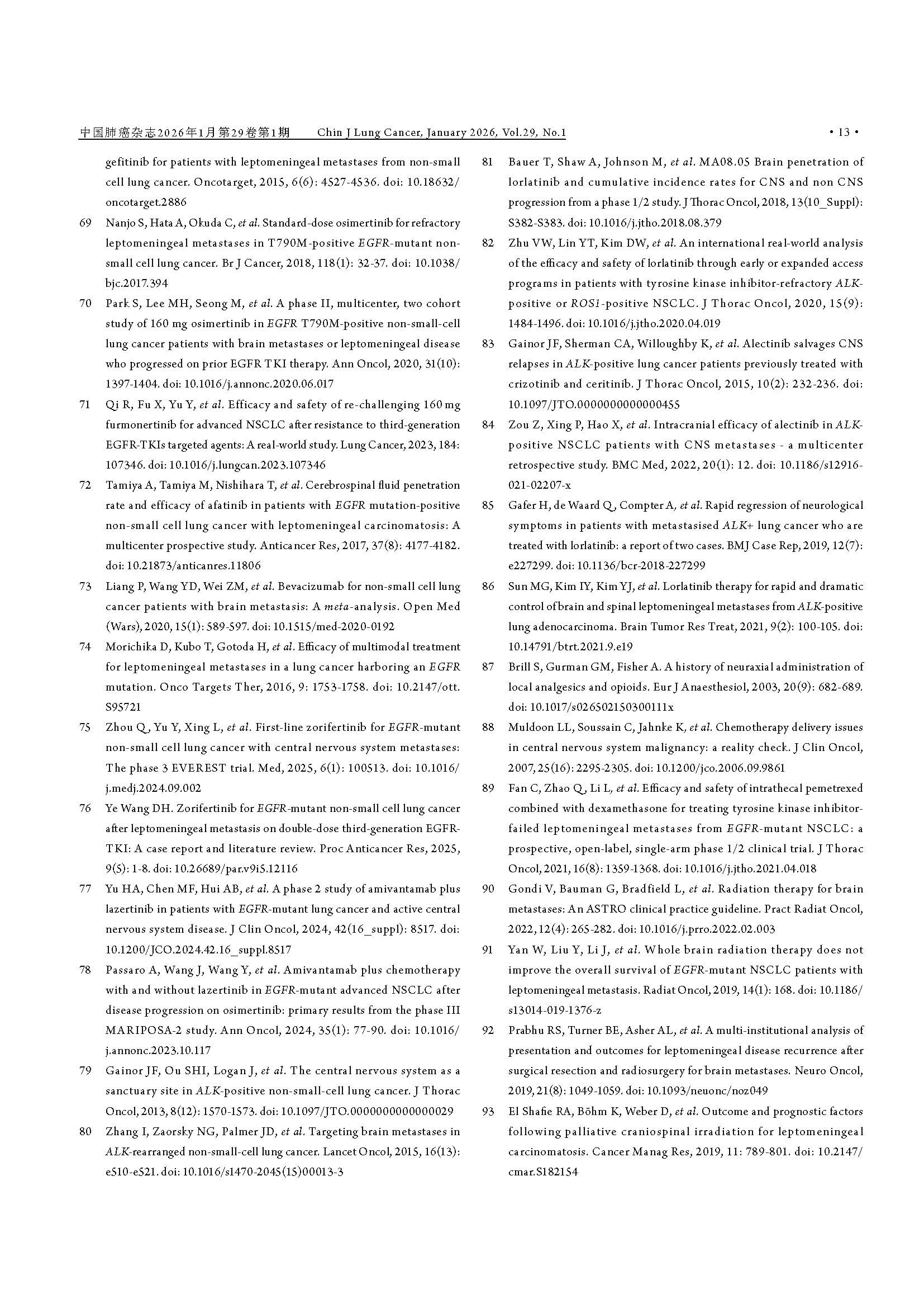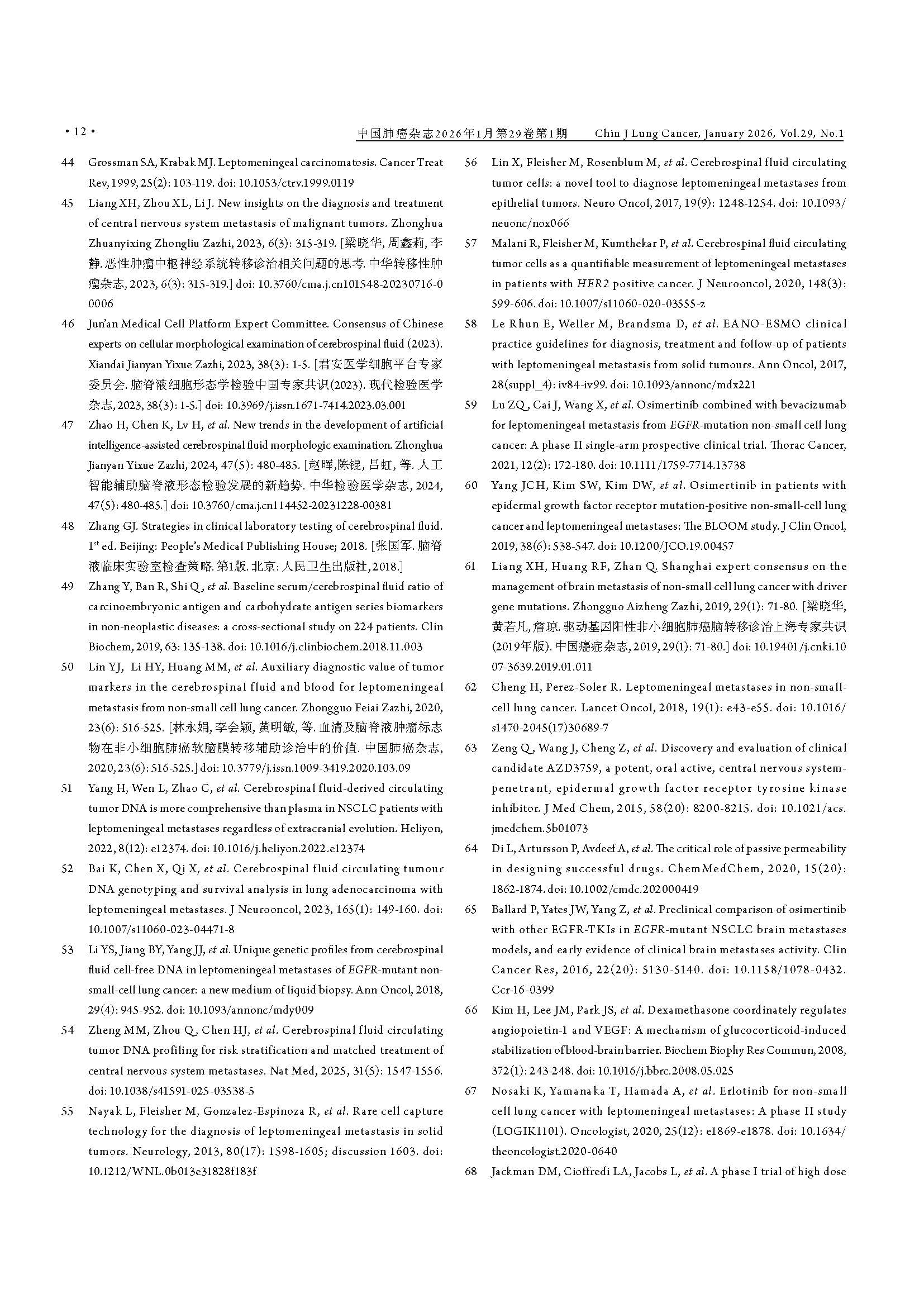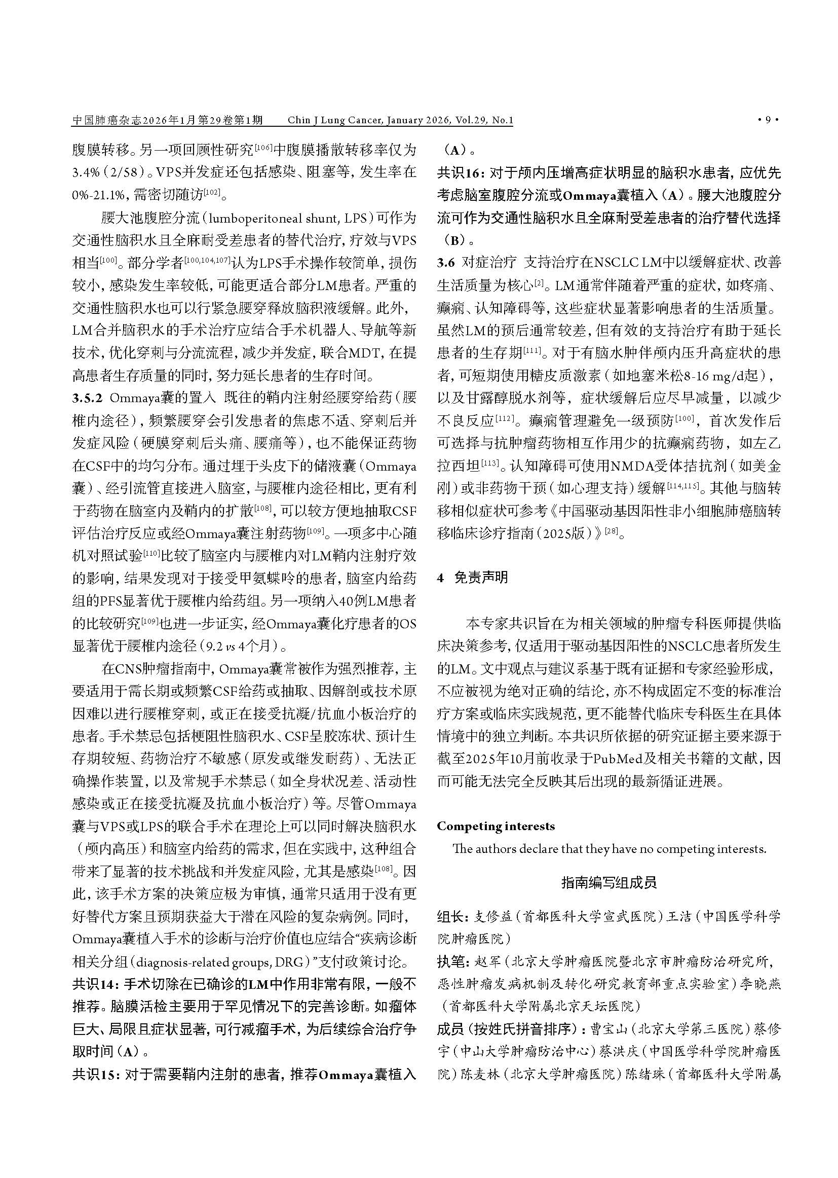 驱动基因阳性非小细胞肺癌脑膜转移临床诊疗中国专家共识(2026版) 引用本文:中国医药教育协会肺癌医学教育专业委员会, 北京医学奖励基金会肺癌医学青年专家委员会转移性肺癌协作组. 驱动基因阳性非小细胞肺癌脑膜转移临床诊疗中国专家共识(2026版). 中国肺癌杂志, 2026, 29(1): 1-14. 【摘要】非小细胞肺癌(non-small cell lung cancer, NSCLC)脑膜转移(leptomeningeal metastasis, LM)的预后极差,然而在驱动基因阳性患者中,高中枢神经系统(central nervous system, CNS)渗透性靶向药物的出现,正显著重塑治疗格局。现有指南多倾向于保守策略,已难以满足精准医学的需求。为应对此挑战,北京医学奖励基金会肺癌医学青年专家委员会转移性肺癌协作组组织肿瘤内科、影像学、病理学、放疗及神经外科等多学科专家,基于近10年的循证医学证据及临床实践经验,制定了《驱动基因阳性非小细胞肺癌脑膜转移临床诊疗中国专家共识(2026版)》。本共识强调,LM诊断应综合临床症状、磁共振成像(magnetic resonance imaging, MRI)及脑脊液(cerebrospinal fluid, CSF)细胞学结果进行判断,并突出CSF分子活检在明确驱动基因状态及疗效评估中的关键作用。在治疗方面,本共识倡导根本性范式转变:由多学科诊疗(multidisciplinary team, MDT)团队主导治疗,以高CNS渗透性靶向治疗作为一线干预措施,局部治疗(如鞘内注射及放疗)则定位为辅助手段;共识针对高CNS渗透性酪氨酸激酶抑制剂(tyrosine kinase inhibitors, TKIs)的选择、鞘内化疗的应用、放疗时机及外科姑息治疗等关键环节,提供了一系列专家推荐,旨在为中国NSCLC LM患者确立基于分子分型和MDT协作的积极个体化治疗规范,从而提升患者生存水平。 【关键词】肺肿瘤;脑膜转移;驱动基因;靶向治疗;临床诊疗指南
