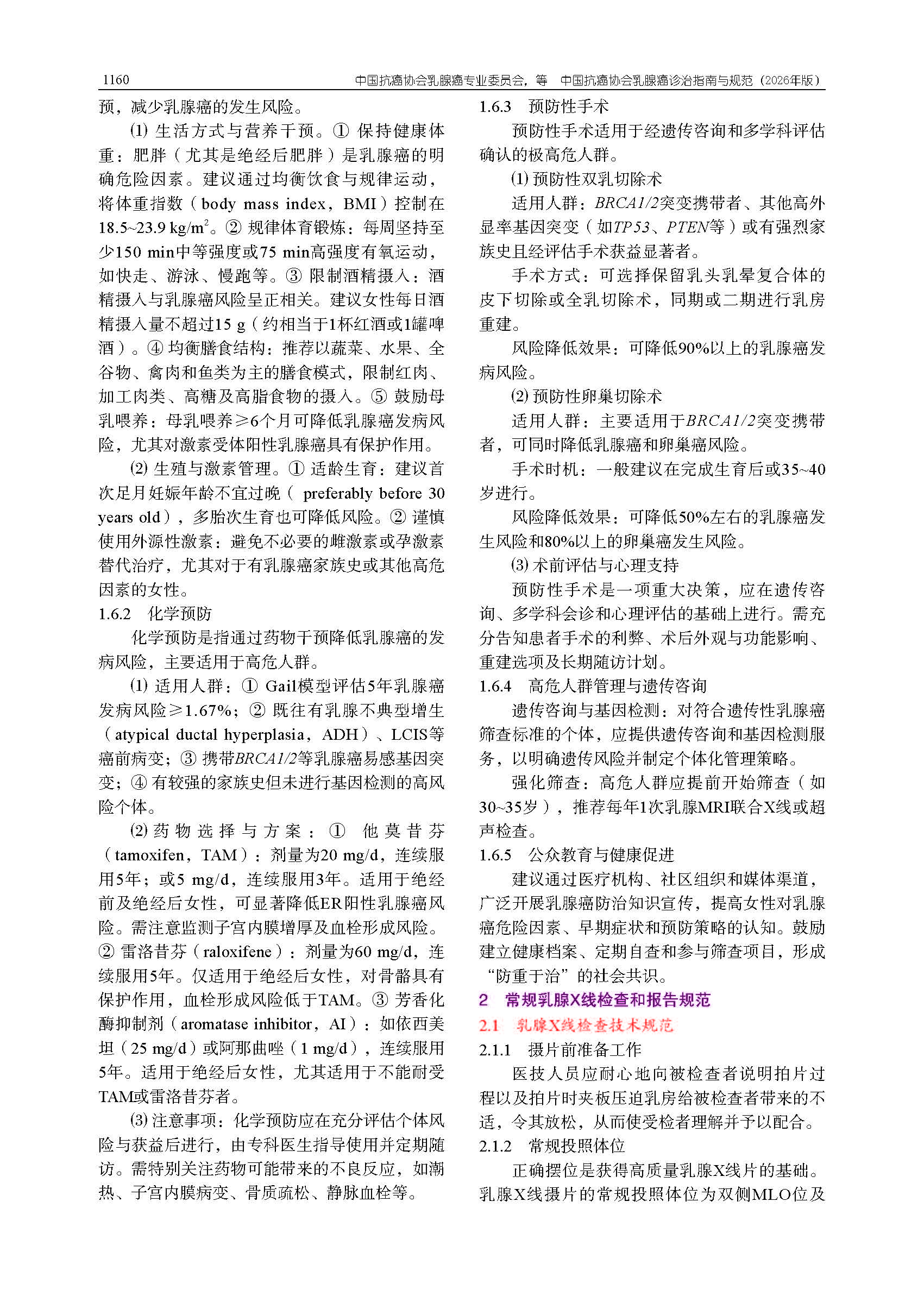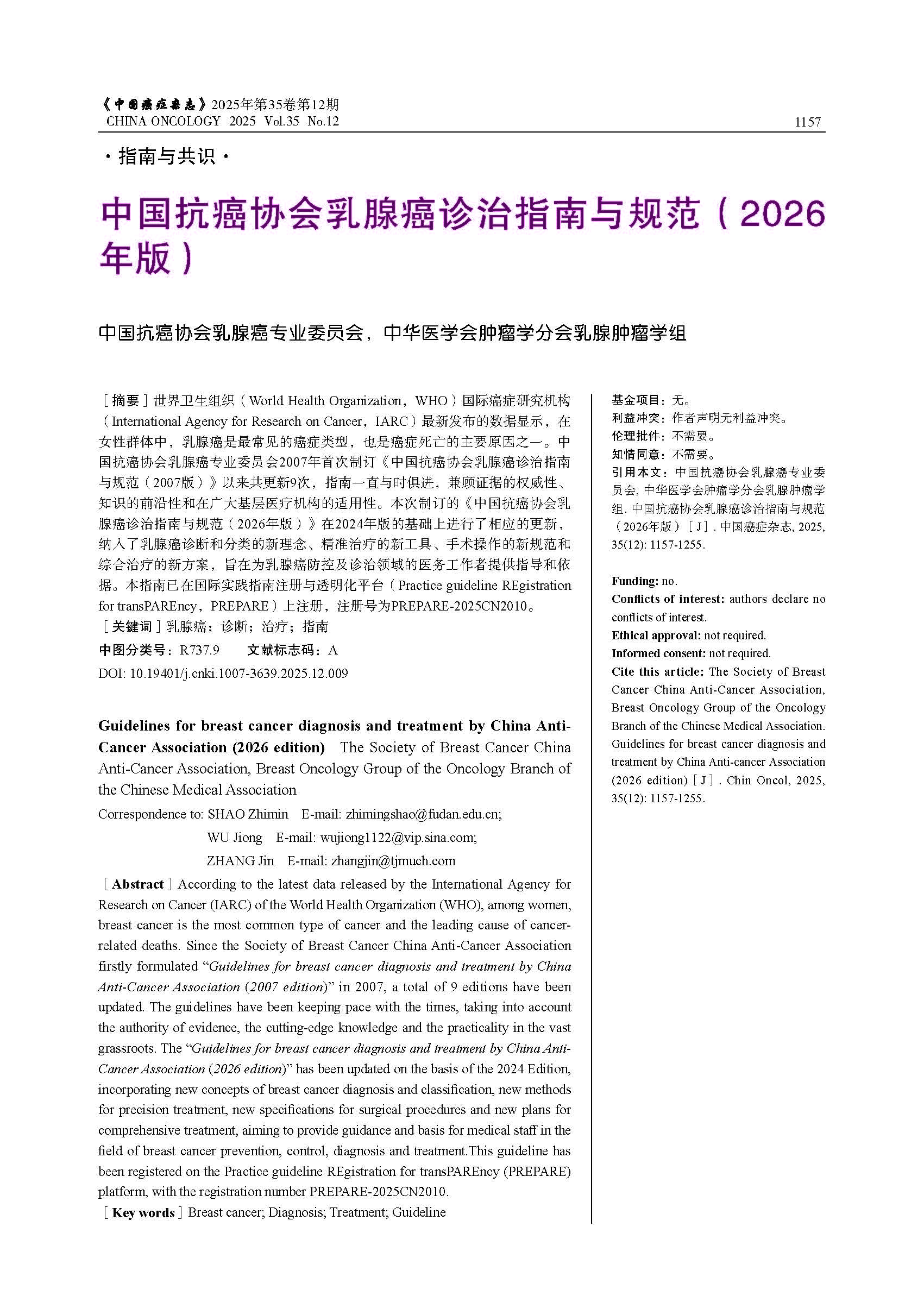 [Abstract] According to the latest data released by the International Agency for Research on Cancer (IARC) of the World Health Organization (WHO), among women, breast cancer is the most common type of cancer and the leading cause of cancer-related deaths. Since the Society of Breast Cancer China Anti-Cancer Association firstly formulated “Guidelines for breast cancer diagnosis and treatment by China Anti-Cancer Association (2007 edition)” in 2007, a total of 9 editions have been updated. The guidelines have been keeping pace with the times, taking into account the authority of evidence, the cutting-edge knowledge and the practicality in the vast grassroots. The “Guidelines for breast cancer diagnosis and treatment by China Anti-Cancer Association (2026 edition)” has been updated on the basis of the 2024 Edition, incorporating new concepts of breast cancer diagnosis and classification, new methods for precision treatment, new specifications for surgical procedures and new plans for comprehensive treatment, aiming to provide guidance and basis for medical staff in the field of breast cancer prevention, control, diagnosis and treatment.This guideline has been registered on the Practice guideline REgistration for transPAREncy (PREPARE) platform, with the registration number PREPARE-2025CN2010.