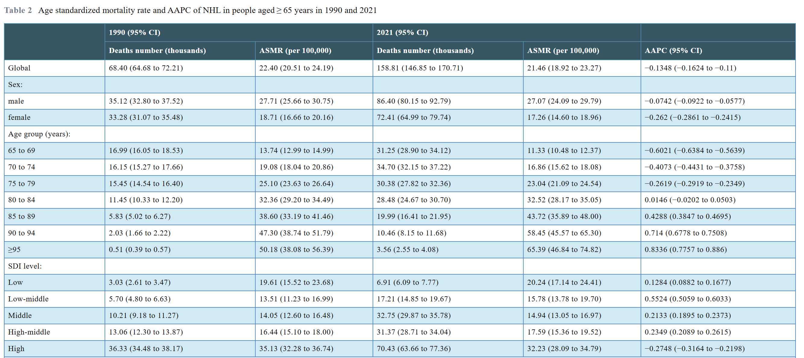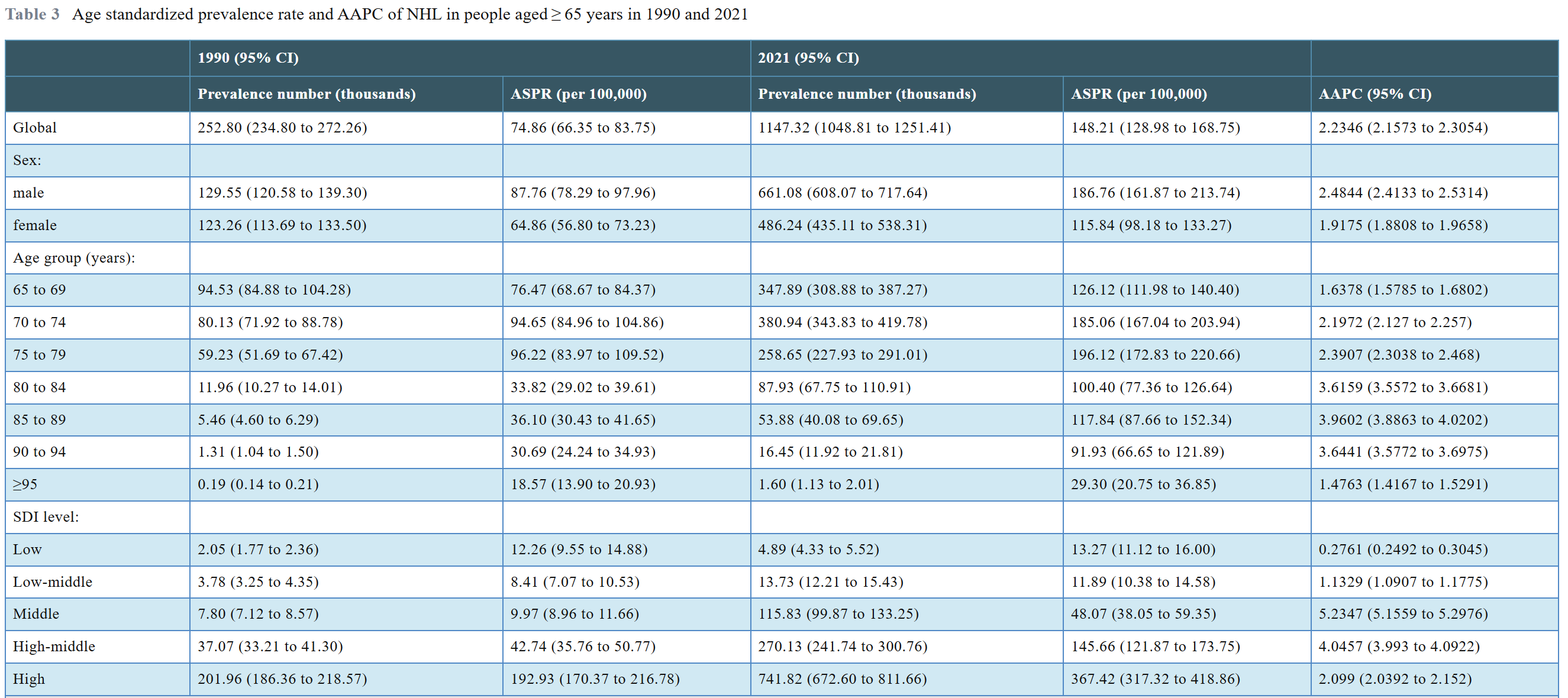 2021年,全球≥65岁人群中,非霍奇金淋巴瘤的患病人数约为1,147,321例,年龄标准化患病率(ASPR)为148.21/10万。全球≥65岁人群中报告的NHL新发病例为306,296例,死亡病例为158,813例,年龄标准化发病率(ASIR)和年龄标准化死亡率(ASMR)分别为59.20/10万和21.46/10万。伤残调整生命年(DALY)约为2,775,447人年,年龄标准化DALY率(ASDR)为364.69/10万人年。