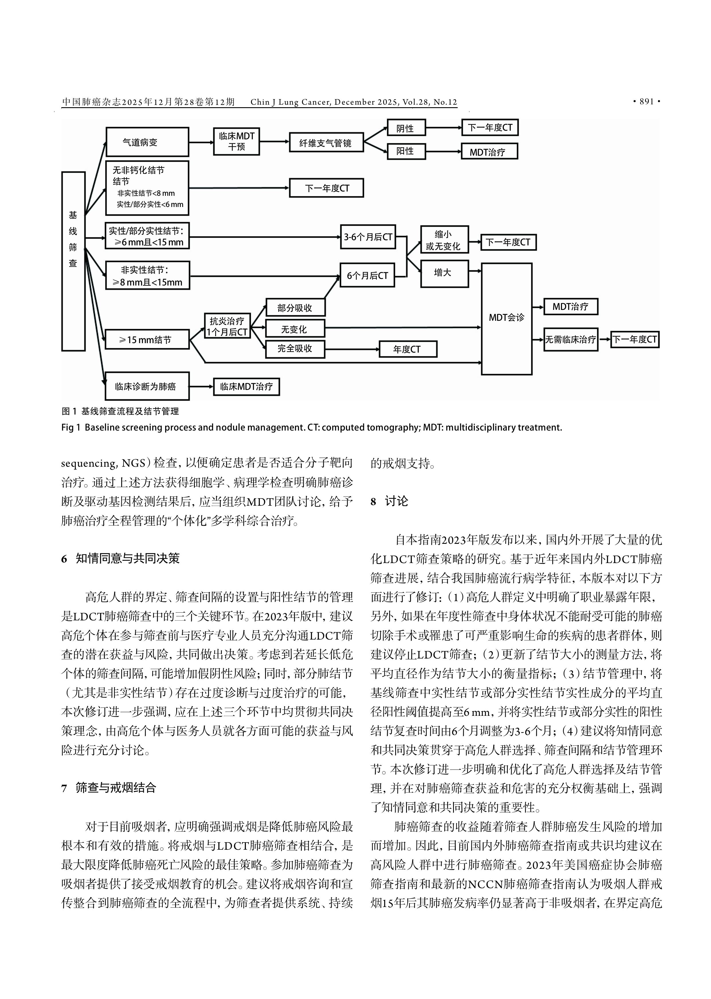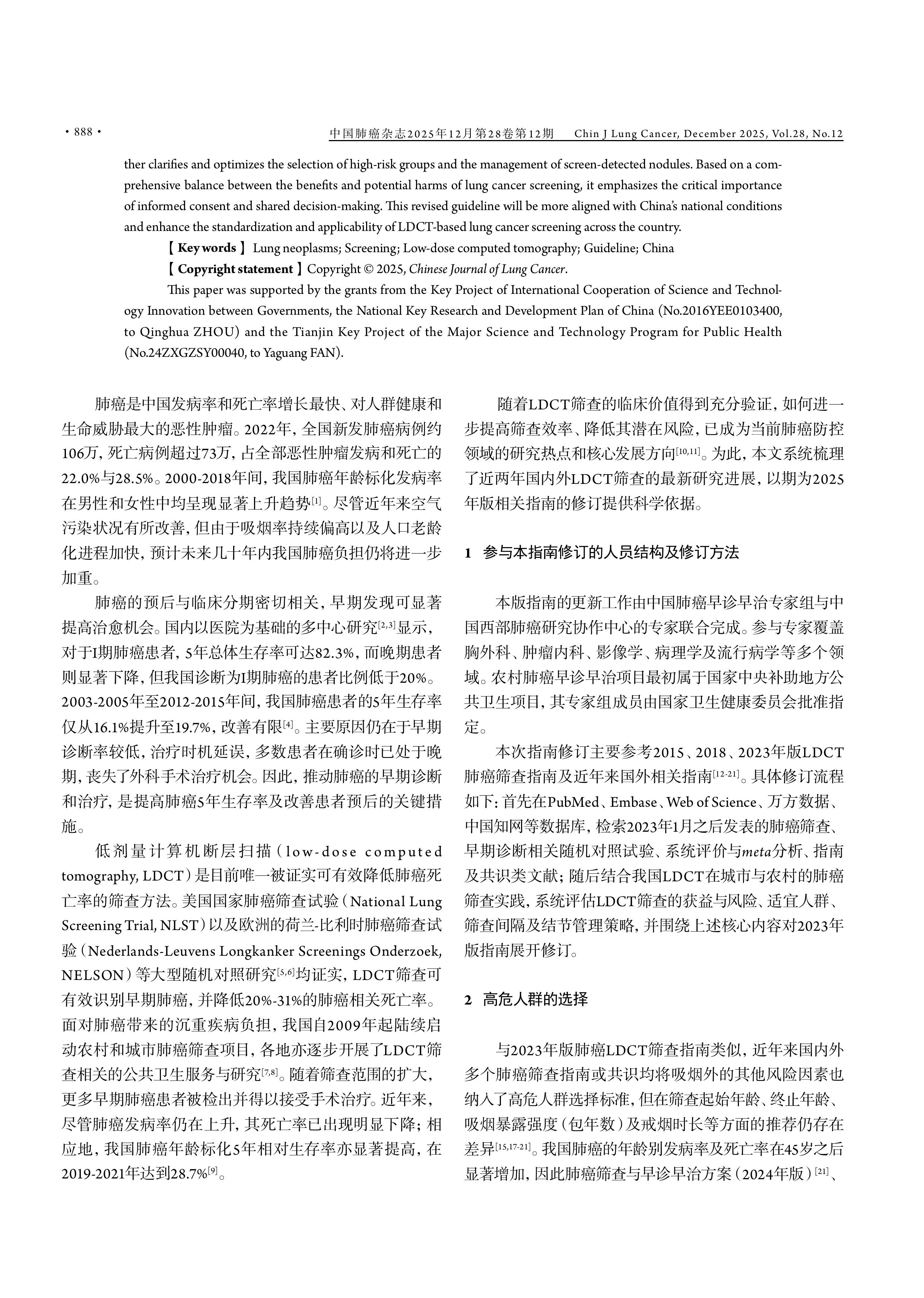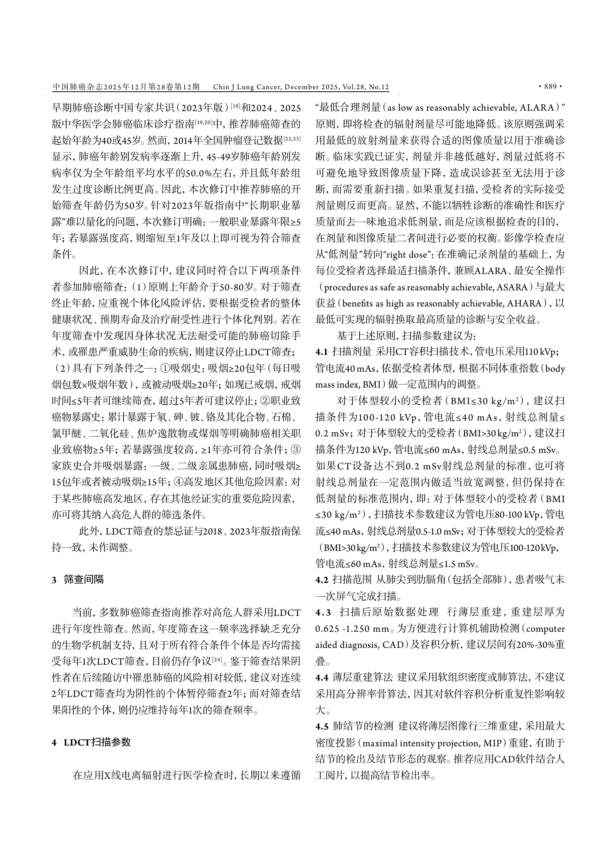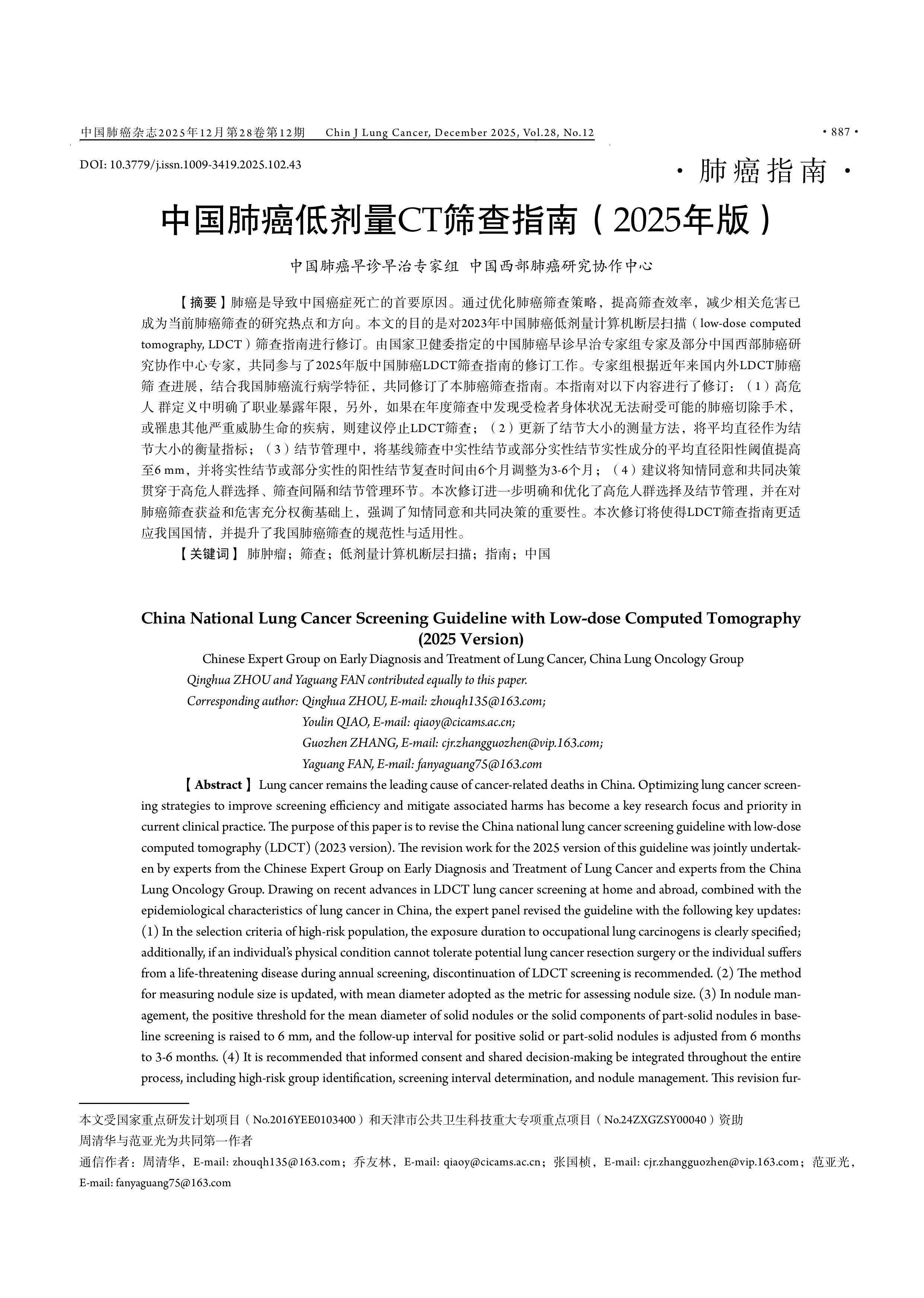 【摘要】肺癌是导致中国癌症死亡的首要原因。通过优化肺癌筛查策略,提高筛查效率,减少相关危害已成为当前肺癌筛查的研究热点和方向。本文的目的是对2023年中国肺癌低剂量计算机断层扫描(low-dose computed tomography, LDCT)筛查指南进行修订。由国家卫健委指定的中国肺癌早诊早治专家组专家及部分中国西部肺癌研究协作中心专家,共同参与了2025年版中国肺癌LDCT筛查指南的修订工作。专家组根据近年来国内外LDCT肺癌筛查进展,结合我国肺癌流行病学特征,共同修订了本肺癌筛查指南。本指南对以下内容进行了修订:(1)高危人群定义中明确了职业暴露年限,另外,如果在年度筛查中发现受检者身体状况无法耐受可能的肺癌切除手术,或罹患其他严重威胁生命的疾病,则建议停止LDCT筛查;(2)更新了结节大小的测量方法,将平均直径作为结节大小的衡量指标;(3)结节管理中,将基线筛查中实性结节或部分实性结节实性成分的平均直径阳性阈值提高至6 mm,并将实性结节或部分实性的阳性结节复查时间由6个月调整为3-6个月;(4)建议将知情同意和共同决策贯穿于高危人群选择、筛查间隔和结节管理环节。本次修订进一步明确和优化了高危人群选择及结节管理,并在对肺癌筛查获益和危害充分权衡基础上,强调了知情同意和共同决策的重要性。本次修订将使得LDCT筛查指南更适应我国国情,并提升了我国肺癌筛查的规范性与适用性。