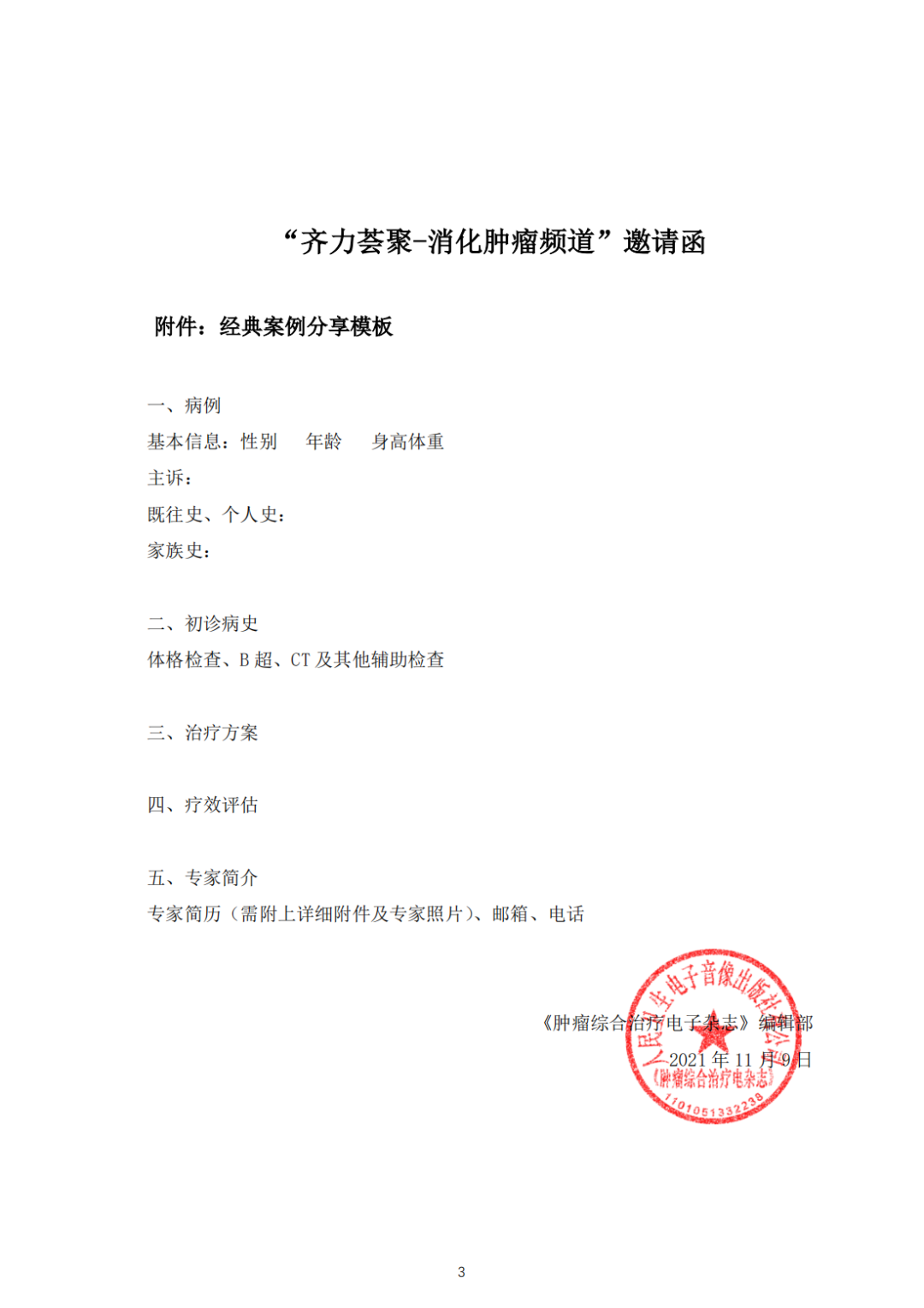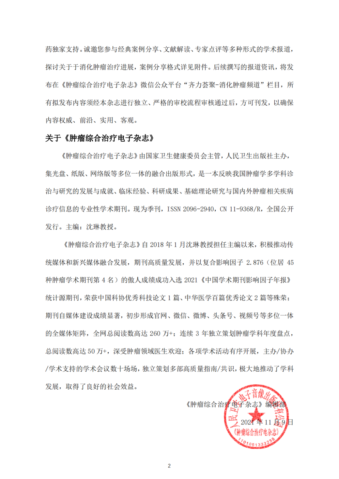 “齐力荟聚-消化肿瘤频道”由《肿瘤综合治疗电子杂志》编辑部主办,齐鲁制药独家支持。诚邀您参与经典案例分享、文献解读、专家点评等多种形式的学术报道,探讨关于消化肿瘤治疗进展,案例分享格式详见附件。后续撰写的报道资讯,将发布在《肿瘤综合治疗电子杂志》微信公众平台“齐力荟聚-消化肿瘤频道”栏目。所有拟发布内容须经本杂志进行独立、严格的审校流程审核通过后,方可刊发,以确保内容权威、前沿、实用、客观。