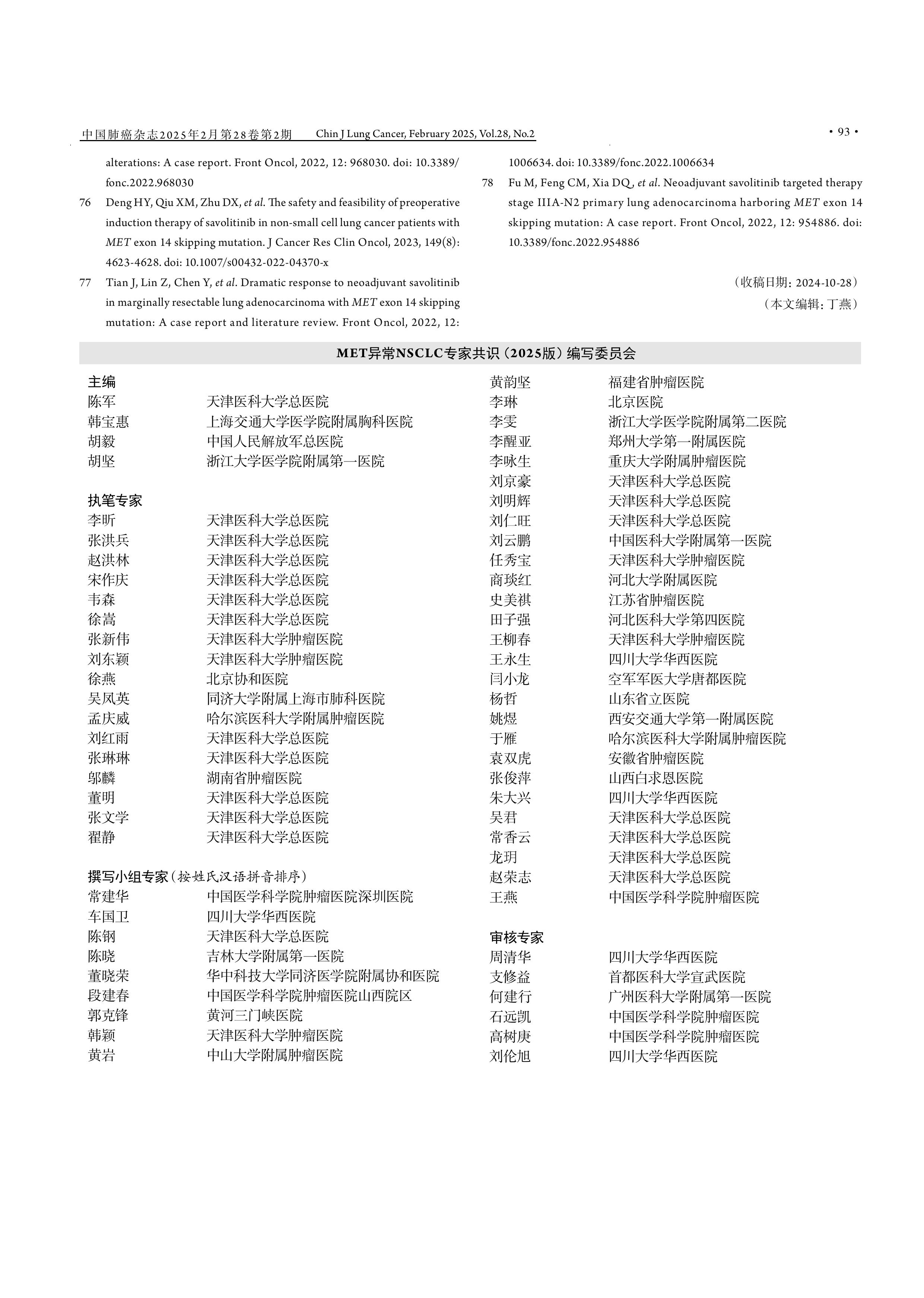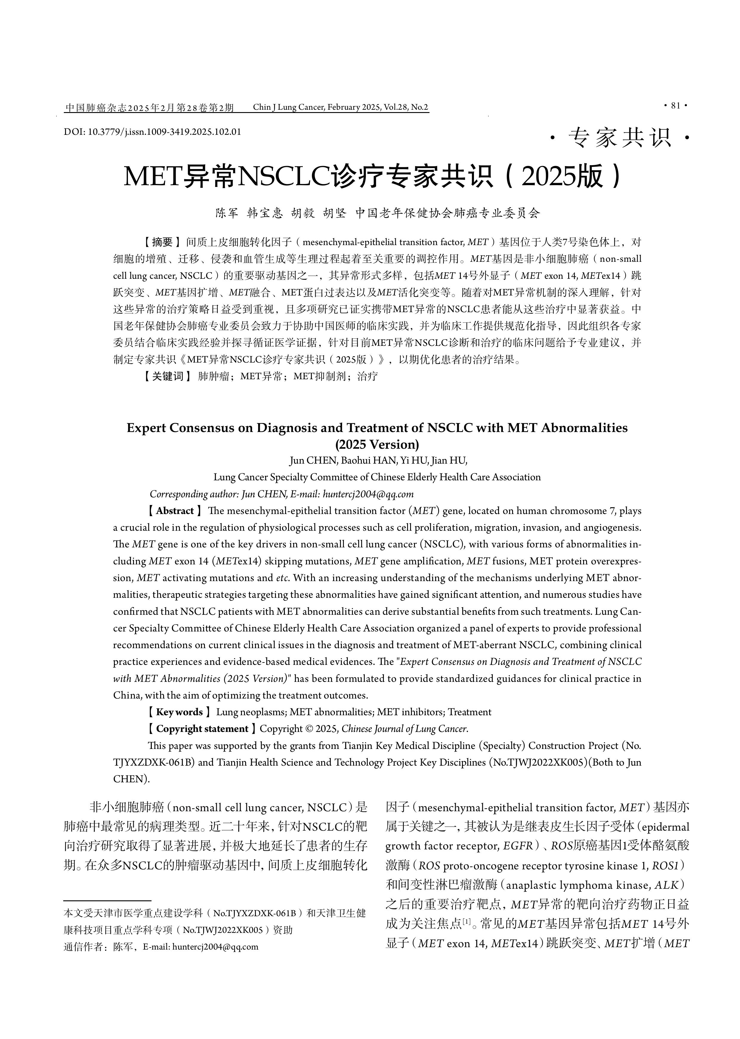 日前,中国老年保健协会肺癌专业委员会组织各专家委员结合临床实践经验并探寻循证医学证据,针对目前MET异常NSCLC诊断和治疗的临床问题给予专业建议,制定了《MET异常NSCLC诊疗专家共识(2025版)》,全文发表在《中国肺癌杂志》2025年第2期。