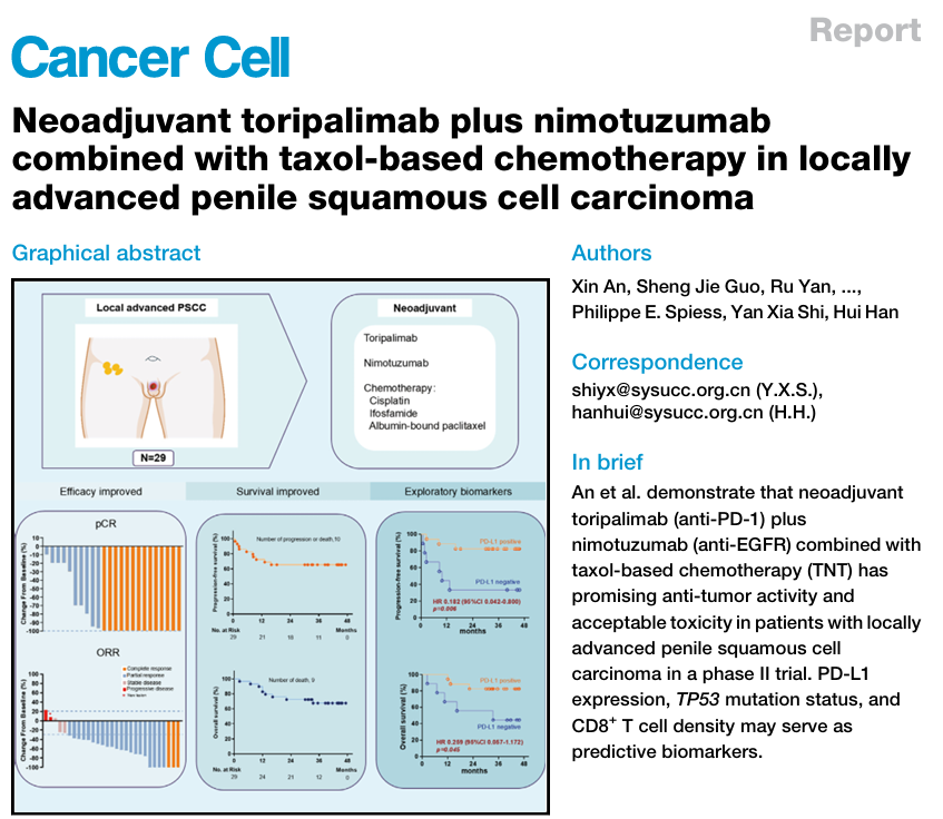 2025年4月10日,肿瘤学顶级期刊、CELL旗下子刊Cancer Cell在线发表了由中山大学肿瘤防治中心泌尿外科韩辉、郭胜杰和内科史艳侠、安欣牵头的一项全国多家医院参与的前瞻性II期临床试验结果(点击文末阅读原文查看)。在前期回顾性研究的基础上,该研究首次前瞻性报道免疫检查点抑制剂(特瑞普利单抗)联合表皮生长因子单克隆抗体药物(尼妥珠单抗)及紫杉醇为基础的化疗(TNT方案)新辅助治疗高危局部晚期阴茎癌(cT4/cN3M0)的临床疗效及安全性。研究结果显示,TNT方案的疗效远高于传统化疗方案,能够大幅提高患者治愈率和生存期,有望改写晚期阴茎癌诊疗的指南并成为新的治疗方案。