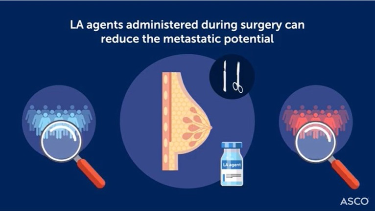 本周100s加餐有点特别。 这周虽然有很多重磅研究,比如DESTINY-Breast02、KEYNOTE-966等,但让我们眼前一亮的的其实是发表在ASCO会刊JCO上的一篇“小”研究。 图片来源:ASCO 研究说的是对早期乳腺癌患者,术前在肿瘤周围使用利多卡因局麻,对抑制肿瘤扩散的影响。 让我们吃惊的是,这么小的一个举措,居然可以调节肿瘤微环境,降低肿瘤扩散的风险,并提高了生存率,尽管幅度有限,但也有统计学差异。 ASCO做了一段视频,我们听译配上了中文字幕,以飨读者,时长3分钟,2倍速的话,100秒也看完了。 本期100s就到这里了,我是李静,感谢您的收听,我们下期见。 source : 1.Effect of Peritumoral Infiltration of Local Anesthetic Before Surgery on Survival in Early #BreastCancer, by Badwe et al 2.https://ascopubs.org/doi/abs/10.1200/JCO.22.01966?journalCode=jco
