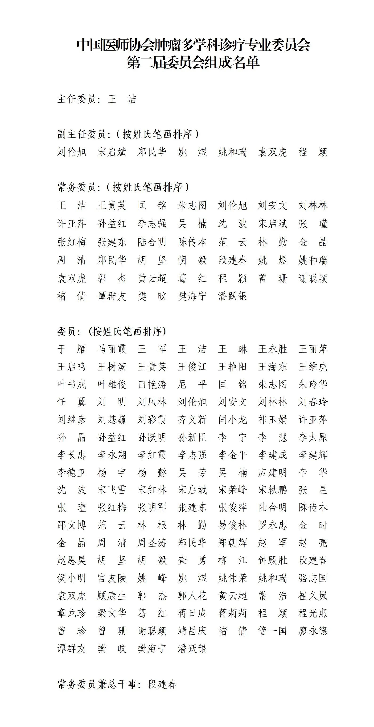 国家癌症中心/中国医学科学院肿瘤医院王洁教授连任主任委员,四川大学华西医院刘伦旭教授、武汉大学人民医院宋启斌教授、上海交通大学医学院附属瑞金医院郑民华教授、西安交通大学第一附属医院姚煜教授、中山大学孙逸仙纪念医院姚和瑞教授、中国科学技术大学附属第一医院袁双虎教授、吉林省肿瘤医院程颖教授任副主任委员。