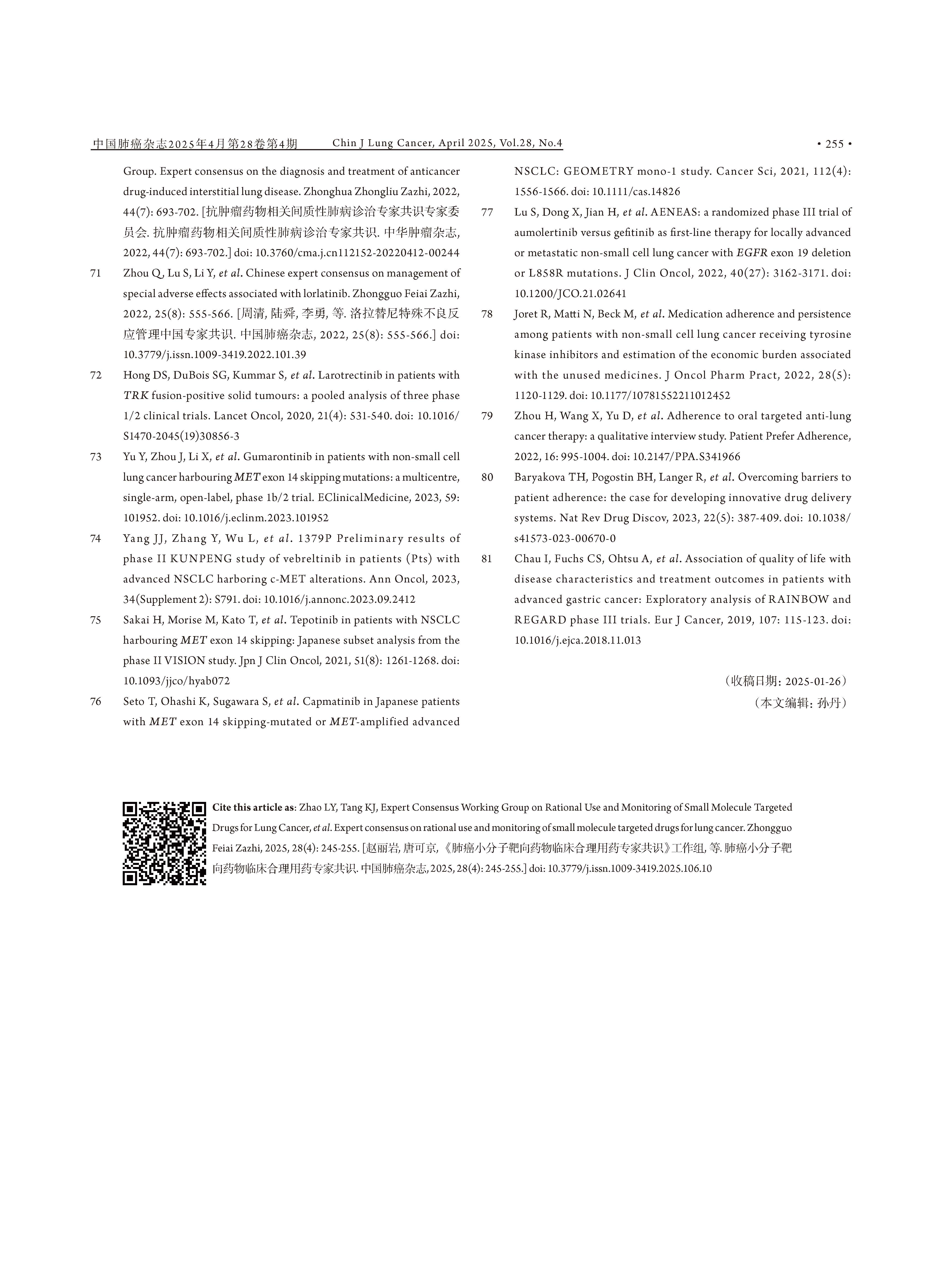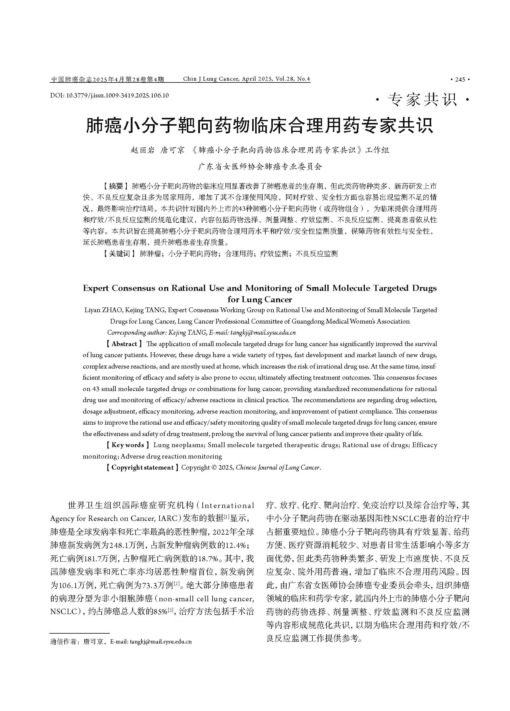 引用本文:赵丽岩, 唐可京, 《肺癌小分子靶向药物临床合理用药专家共识》工作组, 等. 肺癌小分子靶向药物临床合理用药专家共识[J]. 中国肺癌杂志, 2025, 28(4): 245-255.