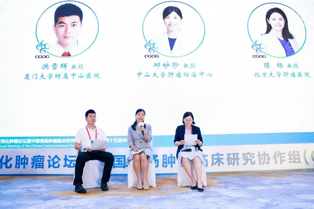 围绕上述专家教授的主题汇报,厦门大学附属中山医院洪雪辉教授、中山大学肿瘤防治中心邱妙珍教授和北京大学肿瘤医院陈杨教授展开热烈的讨论。几位教授针对开展胃肠道肿瘤患者术后给予肠外营养支持评估患者复发和预后的前瞻性临床研究必要性、以及在对免疫治疗不敏感瘤种中探索表观遗传药物联合免疫、抗血管等药物的可能性,还有未来应用人工智能技术开发小分子化合物等发表自己的观点和看法。