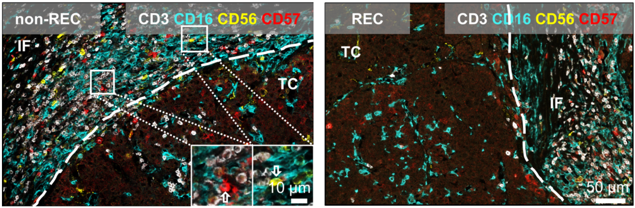肿瘤微环境的空间异质性表现为不同肿瘤区域呈现差异化的免疫细胞组成。自然杀伤细胞(NK细胞)作为先天免疫系统的关键效应细胞,已有临床数据提示肿瘤内NK细胞浸润程度升高与患者生存预后显著相关。然而,当前临床评估体系主要依赖肿瘤特征的常规组织病理学分层方法,尚未整合免疫细胞在肿瘤微环境中的空间分布参数及其对预后的潜在影响。研究团队发现CD57+NK细胞亚群在肿瘤微环境中的空间定位具有特殊的预后意义:肿瘤侵袭前缘区域CD57+NK细胞密度增高的患者表现出显著降低的复发风险。