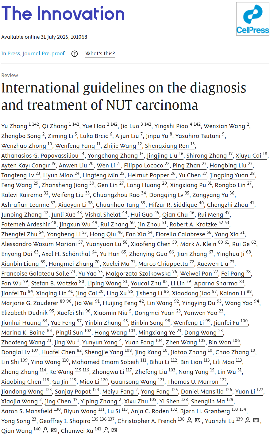 NUT癌作为一种罕见肿瘤,即使是很多医务人员对其都感到陌生,更别说正确诊疗这一疾病。但全球巨大的人口基数导致即使是罕见疾病也有数以万计的患者迫切需要正确的诊断与治疗。2021年国际NUT癌注册中心(NMC Registry)首次以“Report of the First International Symposium on NUT Carcinoma”报告总结NUT癌,这算是国际上最早的NUT癌临床诊疗共识雏形,四年后我们通过中国NUT癌研究协作组(Chinese Alliance of Research for NUT carcinoma, ChARN),联合国际肺癌研究协会(International Association for the Study of Lung Cancer,IASLC)罕见肿瘤专委会和国际NUT癌注册中心(NMC Registry)召集了领域内全球17个国家,141个单位,174位来自亚洲,欧洲,非洲,北美洲,南美洲,大洋洲的专家通过搜集总结现有文献证据,充分讨论形成意见,共同编撰了首部NUT癌临床诊疗国际指南V1.0,希望能帮助大家深入了解及正确诊断这一疾病,为其寻找有效的治疗方案而共同努力。以下对指南中的要点进行简要介绍。