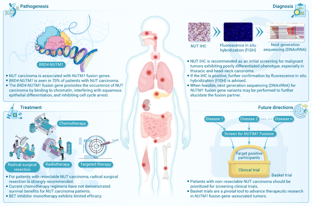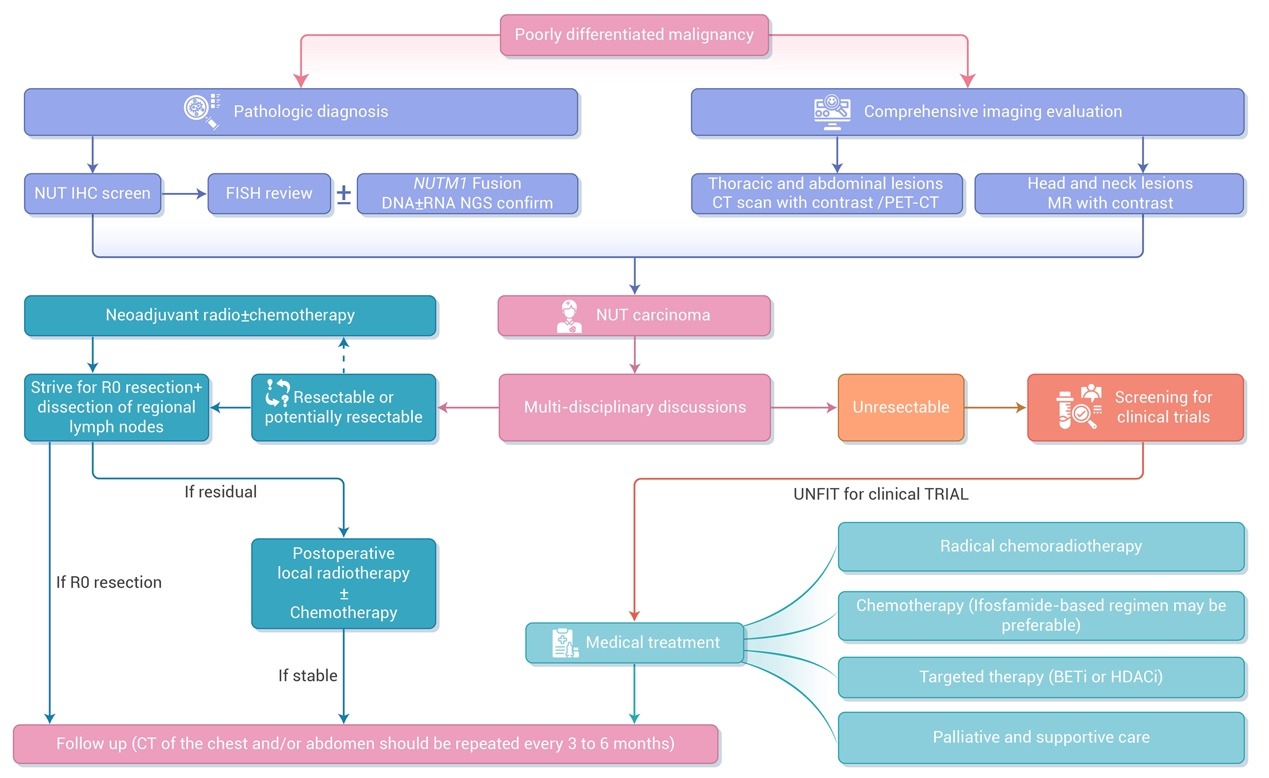 根据上述NUT诊疗的相关内容,我们制定了如下诊疗流程图供大家参考(图1)。NUT癌诊疗未来研究方向应集中在提高诊断效率、明确治疗策略和扩大技术平台等方面,以实现全面精准诊断和精准治疗。在提高诊断效率方面,NUT癌诊断依赖于病理检查,由于其罕见性和组织学异质性通常会导致误诊或诊断不足。因此,提高病理学家和临床医生的认识至关重要。除了IHC和FISH检测外,基于RNA的深度还可以验证病理诊断并发现新的融合伴侣;随诊全基因组测序和转录组测序的综合方法变得越来越普遍,这可能有助于更彻底地了解NUT癌的分子特征,有助于开发针对性的新型药物,切实提高NUT癌患者的疗效。
