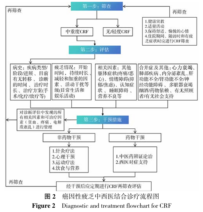 CRF的中西医结合评估与筛查流程见图1,CRF的中西医结合临床诊疗流程见图2。本指南参考的证据等级和推荐强度详见表2。