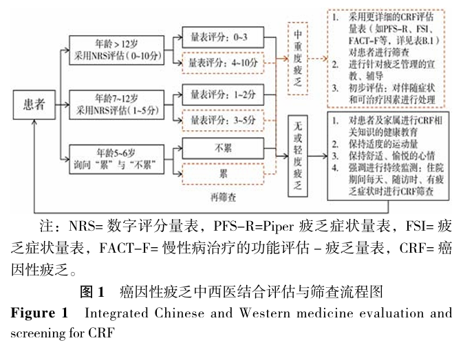【推荐意见】(1)初次就诊时,应使用适合患者年龄的评估工具进行疲乏筛查;治疗期间及治疗结束后,需定期评估,必要时可随时进行评估。(2)筛查CRF时,应选用简单有效的工具。(3)对于中重度CRF患者,需进行全面评估,以明确是否存在合并症及可治疗因素。