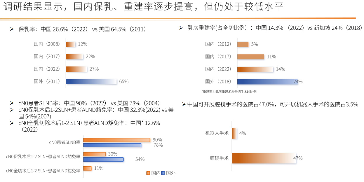 2018年报告(覆盖2017年数据):调研范围扩大至110家机构。保乳率提升至22%(2017年),乳房重建率达11%(2017年)1-4,表明规范化诊疗理念正在逐步渗透。