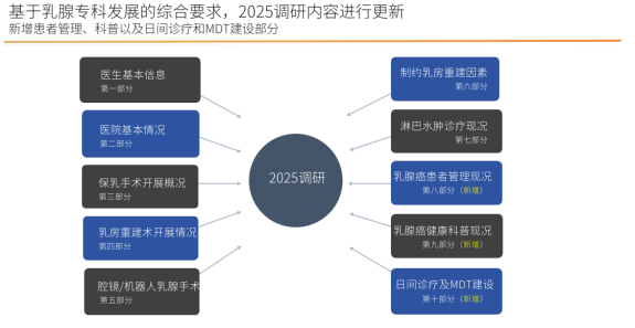 近期,由中国抗癌协会整合乳腺癌委员会发起的健康中国2030乳腺专科调研(2025版)(以下简称“2025版调研”)盛大启动,本次调研在原有的框架上进行了拓展,新增患者管理、健康科普、日间诊疗及多学科诊疗(MDT)建设等模块,旨在更全面地反映乳腺专科领域的动态发展,进一步推动诊疗规范化落地、助力专科高质量发展。