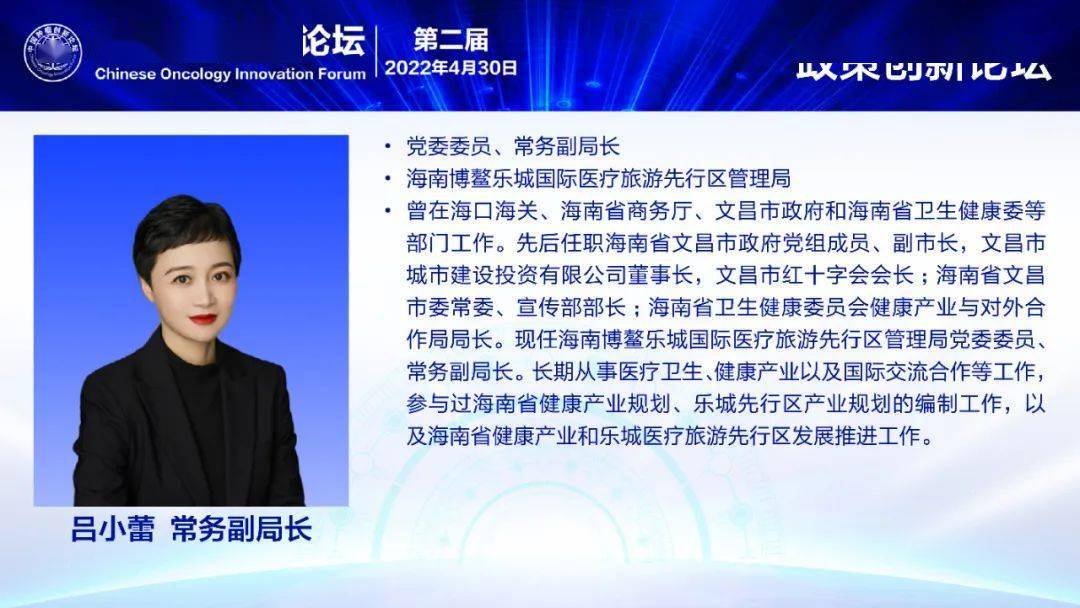 吕小蕾常务副局长作了“从新一代ADC创新药物成功准入看博鳌乐城先行先试创新政策和机遇”的报告,她提到,博鳌肿瘤创新研究院自成立一年多以来,一直在支持乐城的发展,和乐城一起为了人民群众的健康不断地去做一些改革创新的探索,越来越多的创新药品进入到乐城先行区,帮助了非常多的患者。她简要介绍了博鳌乐城先行先试创新政策和机遇,分享了乐城先行区先行先试的政策,指出目前乐城的发展驶入“快车道”,从患者角度、医疗机构、医生的需求出发,不断优化简化审批流程,其中调整为批量审批,将“一人、一品、一批”调整为“一品、一院、一批”,即调整为批量审批,并下放审批权限,非首次特许药械审批,调剂药品等都下放给乐城医药监管局,带药离园审批制改为备案制,乐城的医疗服务能力和水平进一步提升,国际创新药械临床使用和研发筑基垒台,并介绍到乐城先行区一直重视肿瘤领域技术突破,全球药械企业鼎力支持,临床真实世界数据应用试点不断突破,陆续在乐城先行区多家医院同步“上市”多款国外获批的新药品,确保国际领先的创新药品在中国同步使用,为中国患者提供更多的治疗方式和更好的治疗效果。相信博鳌肿瘤创新研究院在马飞理事长的带领下,一定会本着为肿瘤科技工作者服务,为创新驱动发展服务,为增进群众健康福祉,共建共享健康的初心,为中国肿瘤创新事业贡献力量。
