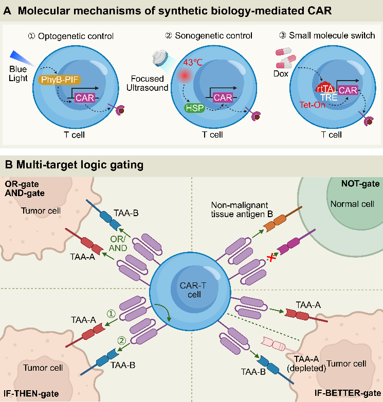 合成生物学:光遗传学(蓝光开关)、聚焦超声(深部激活)、小分子调控系统(如Dox诱导)为CAR-T提供了时空可控性。