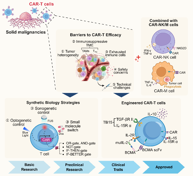 这篇综述探讨了CAR-T疗法在实体瘤中的五大难题,全面而系统地剖析了跨学科技术赋能的新格局。随着合成生物学、人工智能等前沿手段的深度融合,使CAR-T细胞正从单一的免疫工具演变为“可编程的活药物”,有望在未来为实体瘤免疫细胞治疗开辟新纪元。