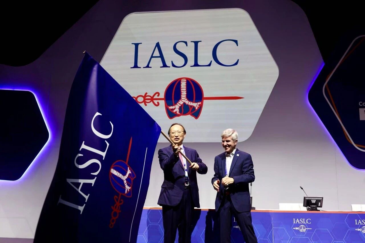 随后,Paul Van Schil教授将象征IASLC学术使命与引领责任的旗帜,郑重交予同济大学附属东方医院的周彩存教授。这一交接不仅是IASLC学术传承的关键节点,更标志着协会正式开启由中国专家领衔、携手全球同仁共促胸部肿瘤诊疗事业进步的全新篇章。