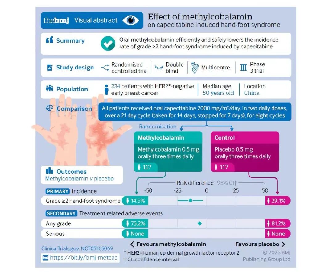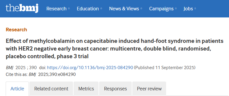 2025年9月11日,中山大学孙逸仙纪念医院乳腺肿瘤中心龚畅教授团队联合全国共7家单位,在国际顶尖医学期刊《英国医学杂志》(BMJ)上发表了一项题为“Effect of methylcobalamin on capecitabine induced hand-foot syndrome in patients with HER2 negative early breast cancer: multicentre, double blind, randomised, placebo controlled, phase 3 trial”的重要临床研究成果。该项多中心、随机、双盲、安慰剂对照的III期临床研究证实,口服甲钴胺可显著降低HER2阴性早期乳腺癌患者在卡培他滨辅助强化治疗中2/3级手足综合征的发生率,且未观察到特殊不良反应,为该类患者提供了一种有效且安全的HFS预防新方案。
