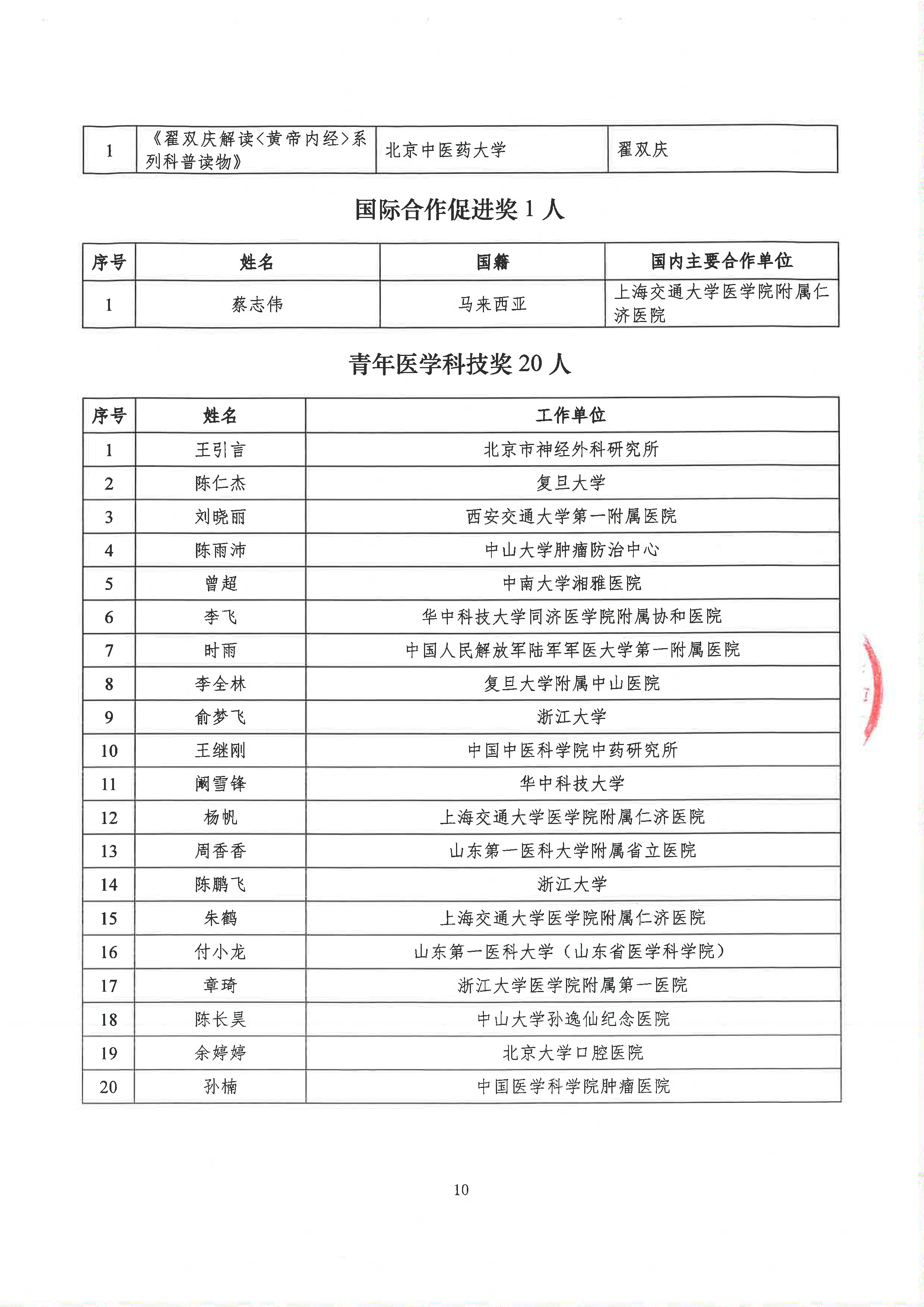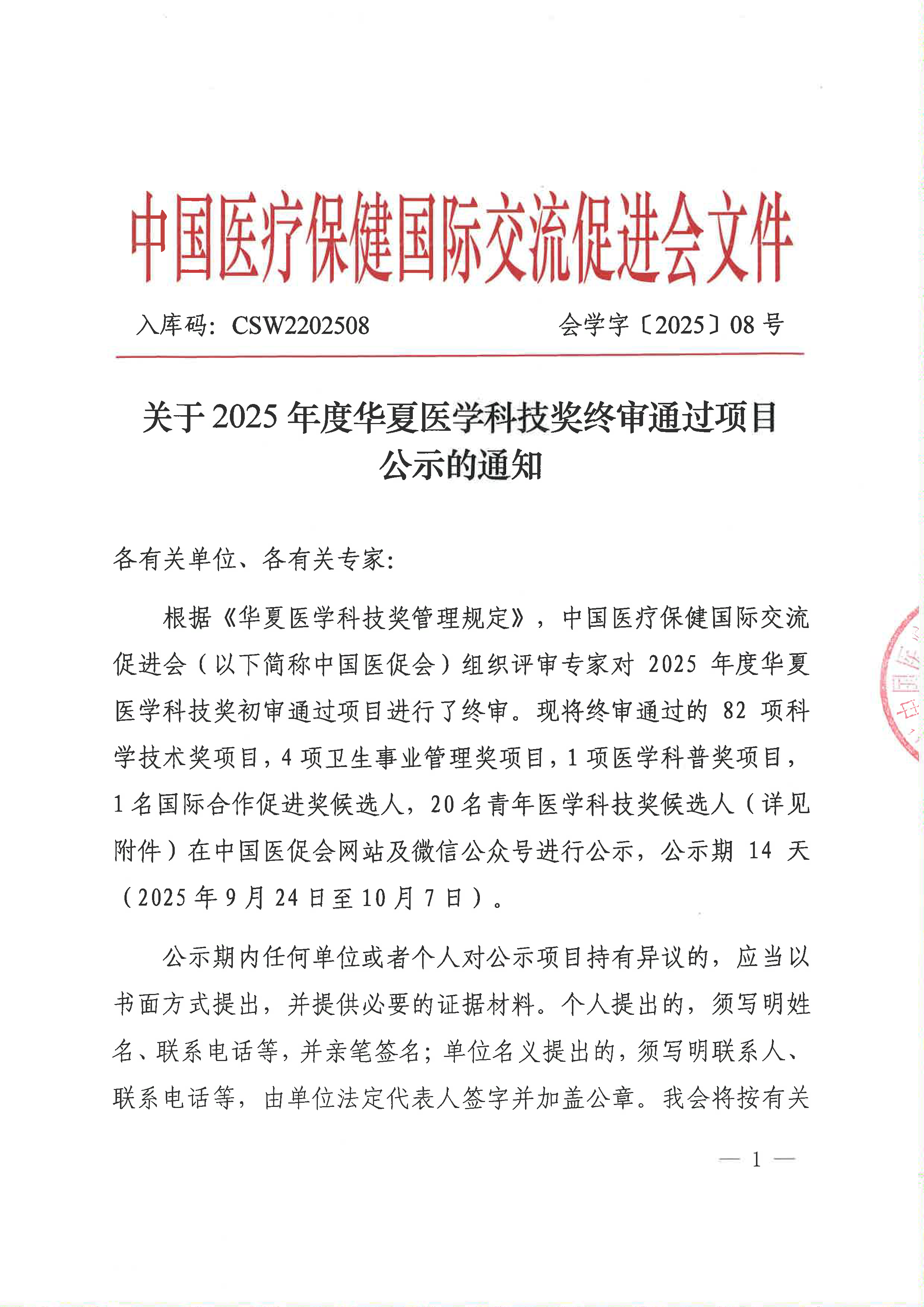 根据《华夏医学科技奖管理规定》,中国医疗保健国际交流促进会(以下简称中国医促会)组织评审专家对2025年度华夏医学科技奖初审通过项目进行了终审。现将终审通过的82项科学技术奖项目,4项卫生事业管理奖项目,1项医学科普奖项目,1名国际合作促进奖候选人,20名青年医学科技奖候选人(详见附件)在中国医促会网站及微信公众号进行公示,公示期14天(2025年9月24日至10月7日)。