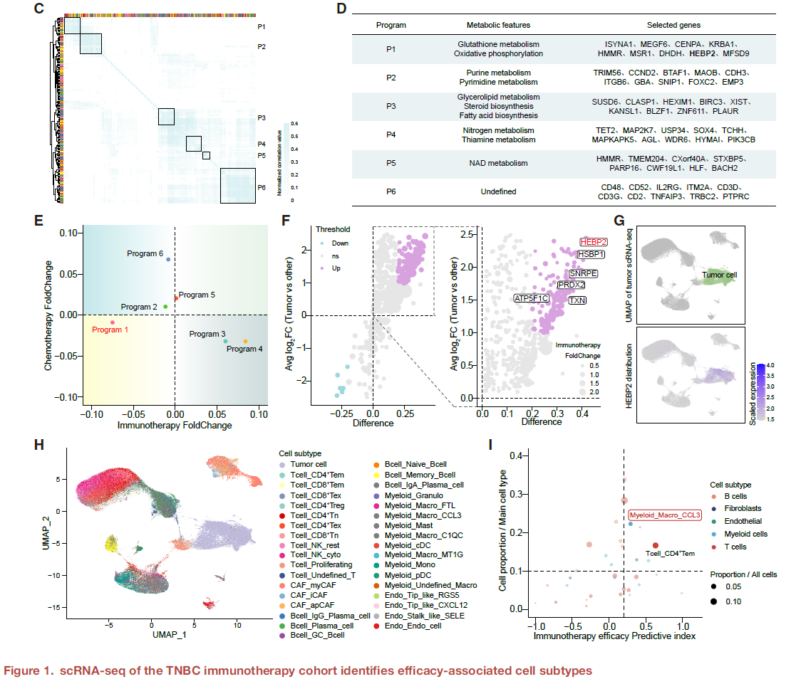 研究首先通过cNMF分析scRNA-seq数据,在肿瘤细胞中识别出6个核心代谢编程(P1-P6),其中P1与免疫治疗疗效最差显著相关,且富集于“谷胱甘肽代谢”通路。P1的特征基因中,HEBP2表达最高,且特异性富集于肿瘤细胞中。另一方面,研究发现CCL3+巨噬细胞(占髓系细胞的 12.9%)与免疫治疗疗效、“免疫热”TME正相关。