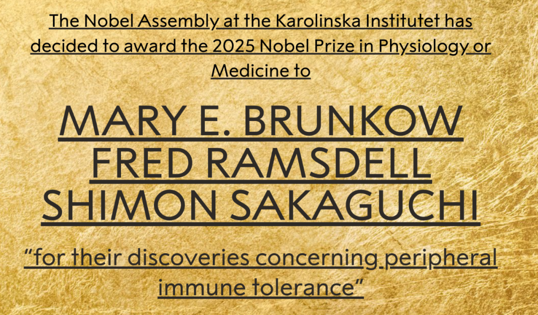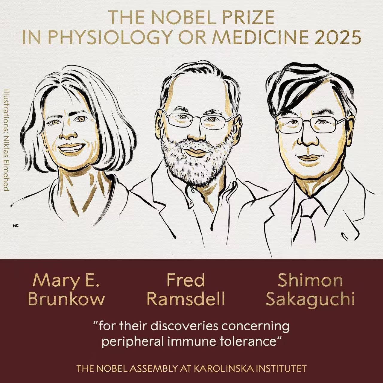 北京时间10月6日,瑞典卡罗琳医学院宣布,将2025年诺贝尔生理学或医学奖授予科学家玛丽·E·布伦科(Mary E. Brunkow)、弗雷德·拉姆斯德尔(Fred Ramsdell)和坂口志文(Shimon Sakaguchi),以表彰他们在外周免疫耐受方面的发现