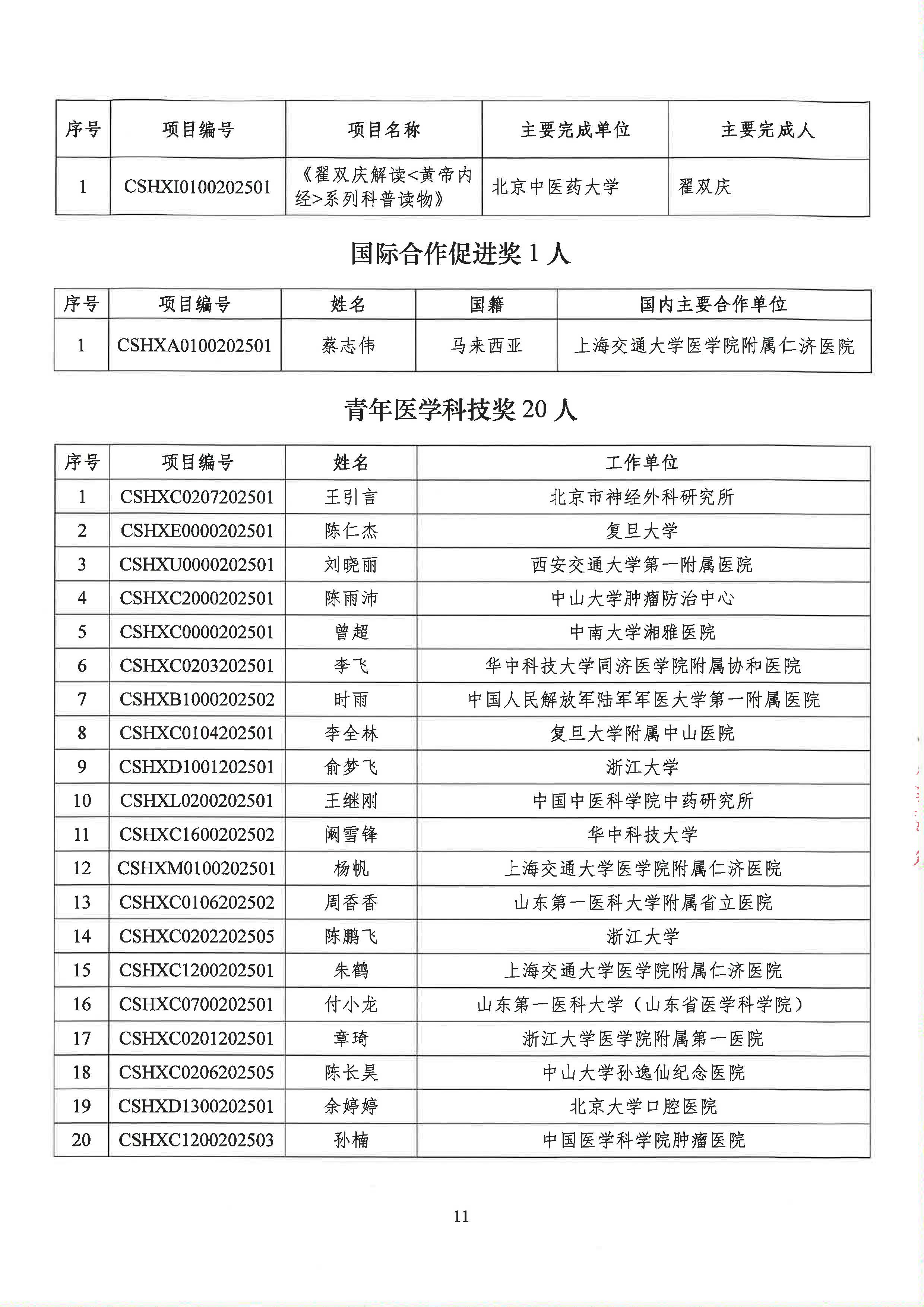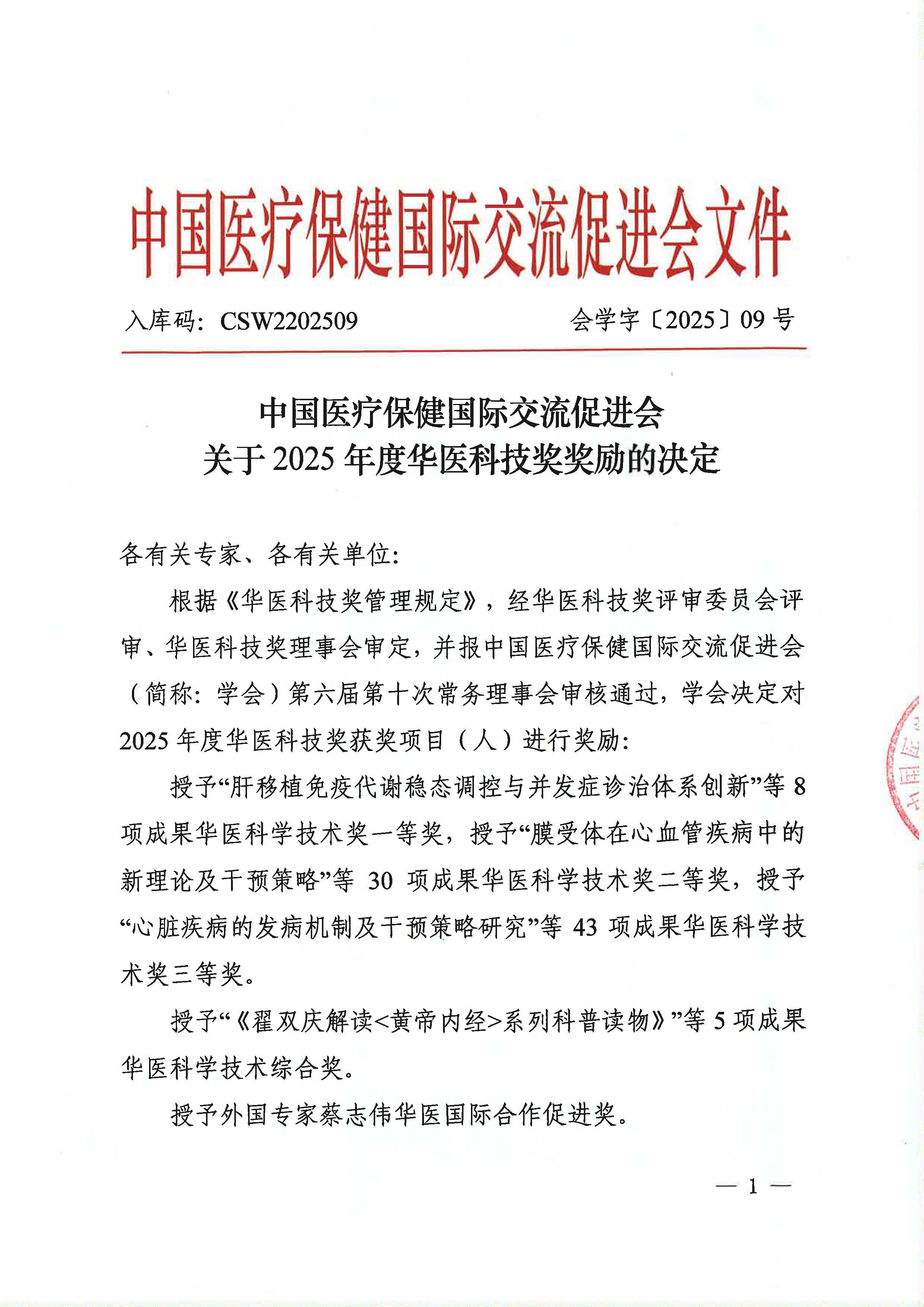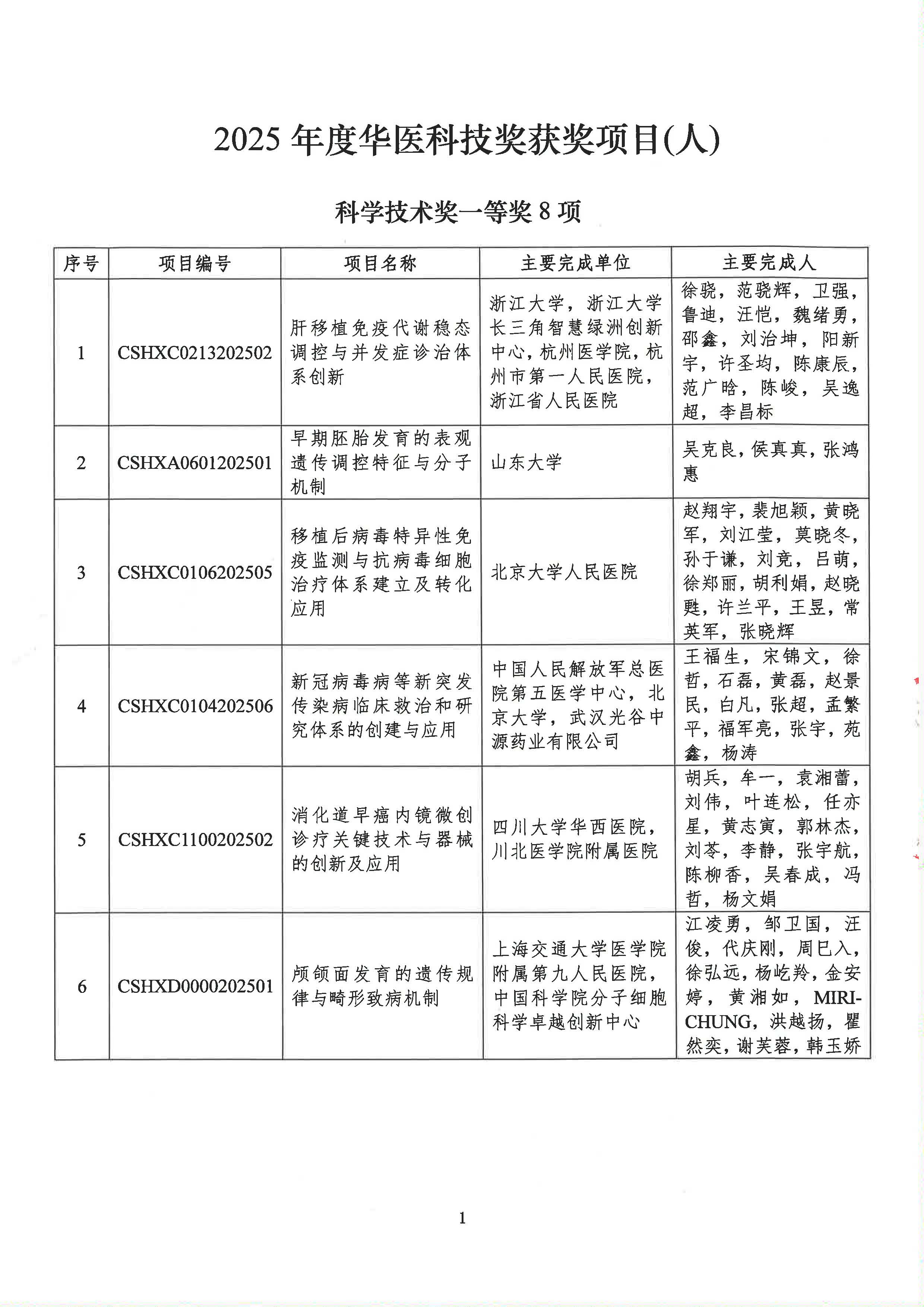 2025年度华医科技奖获奖项目(人)共包括华医科学技术奖一等奖8项、二等奖30项、三等奖43项、华医科学技术综合奖5项、华医国际合作促进奖1位、华医青年医学科技奖20位。