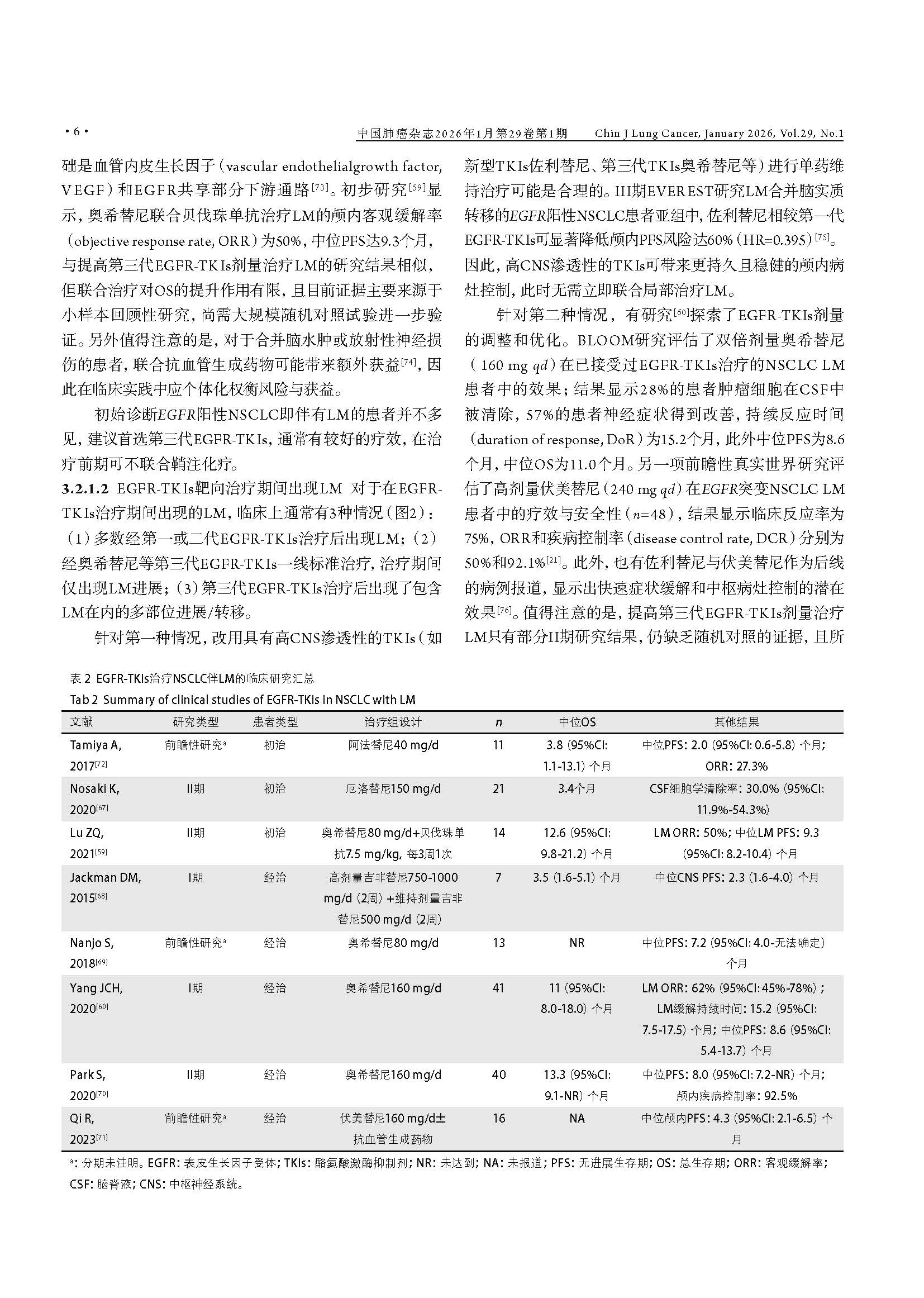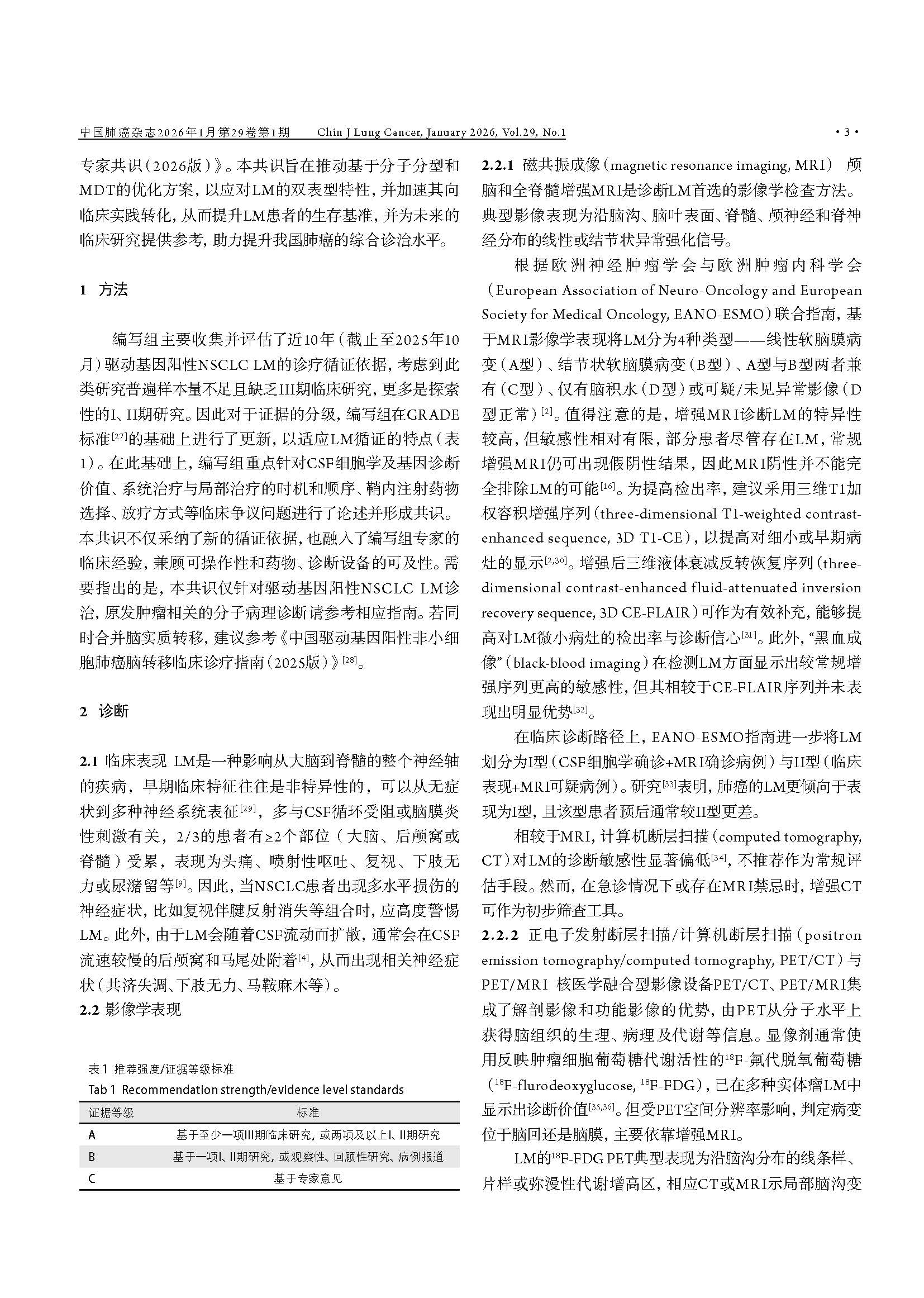 驱动基因阳性非小细胞肺癌脑膜转移临床诊疗中国专家共识(2026版) 引用本文:中国医药教育协会肺癌医学教育专业委员会, 北京医学奖励基金会肺癌医学青年专家委员会转移性肺癌协作组. 驱动基因阳性非小细胞肺癌脑膜转移临床诊疗中国专家共识(2026版). 中国肺癌杂志, 2026, 29(1): 1-14. 【摘要】非小细胞肺癌(non-small cell lung cancer, NSCLC)脑膜转移(leptomeningeal metastasis, LM)的预后极差,然而在驱动基因阳性患者中,高中枢神经系统(central nervous system, CNS)渗透性靶向药物的出现,正显著重塑治疗格局。现有指南多倾向于保守策略,已难以满足精准医学的需求。为应对此挑战,北京医学奖励基金会肺癌医学青年专家委员会转移性肺癌协作组组织肿瘤内科、影像学、病理学、放疗及神经外科等多学科专家,基于近10年的循证医学证据及临床实践经验,制定了《驱动基因阳性非小细胞肺癌脑膜转移临床诊疗中国专家共识(2026版)》。本共识强调,LM诊断应综合临床症状、磁共振成像(magnetic resonance imaging, MRI)及脑脊液(cerebrospinal fluid, CSF)细胞学结果进行判断,并突出CSF分子活检在明确驱动基因状态及疗效评估中的关键作用。在治疗方面,本共识倡导根本性范式转变:由多学科诊疗(multidisciplinary team, MDT)团队主导治疗,以高CNS渗透性靶向治疗作为一线干预措施,局部治疗(如鞘内注射及放疗)则定位为辅助手段;共识针对高CNS渗透性酪氨酸激酶抑制剂(tyrosine kinase inhibitors, TKIs)的选择、鞘内化疗的应用、放疗时机及外科姑息治疗等关键环节,提供了一系列专家推荐,旨在为中国NSCLC LM患者确立基于分子分型和MDT协作的积极个体化治疗规范,从而提升患者生存水平。 【关键词】肺肿瘤;脑膜转移;驱动基因;靶向治疗;临床诊疗指南