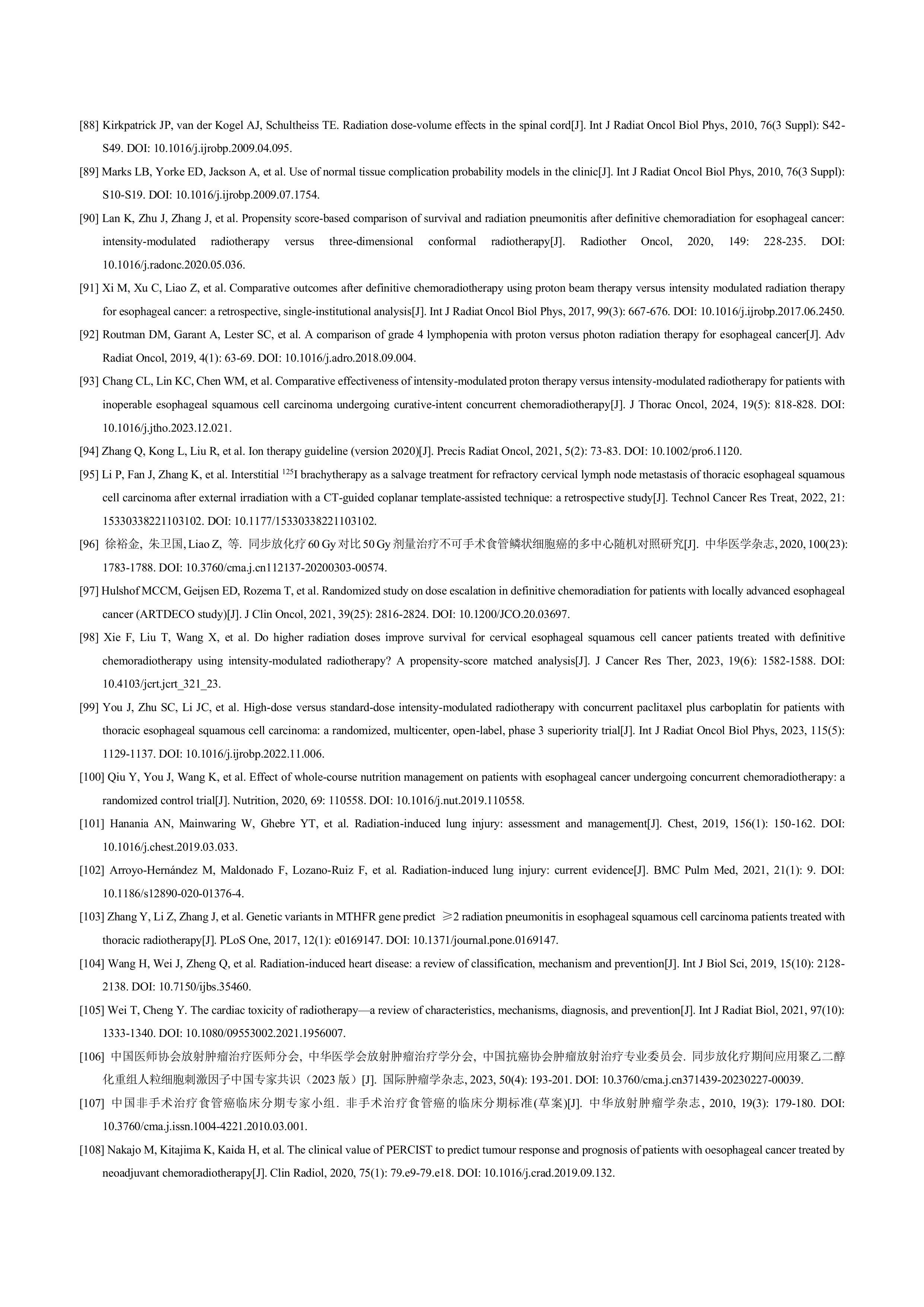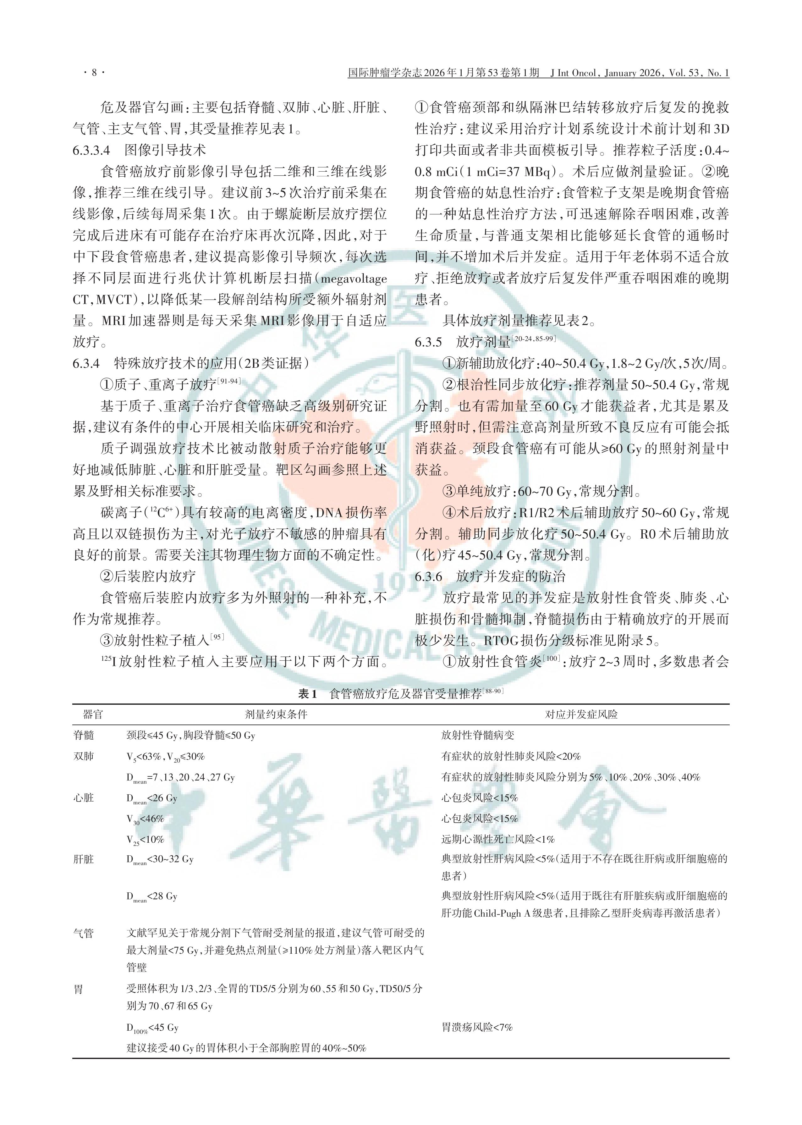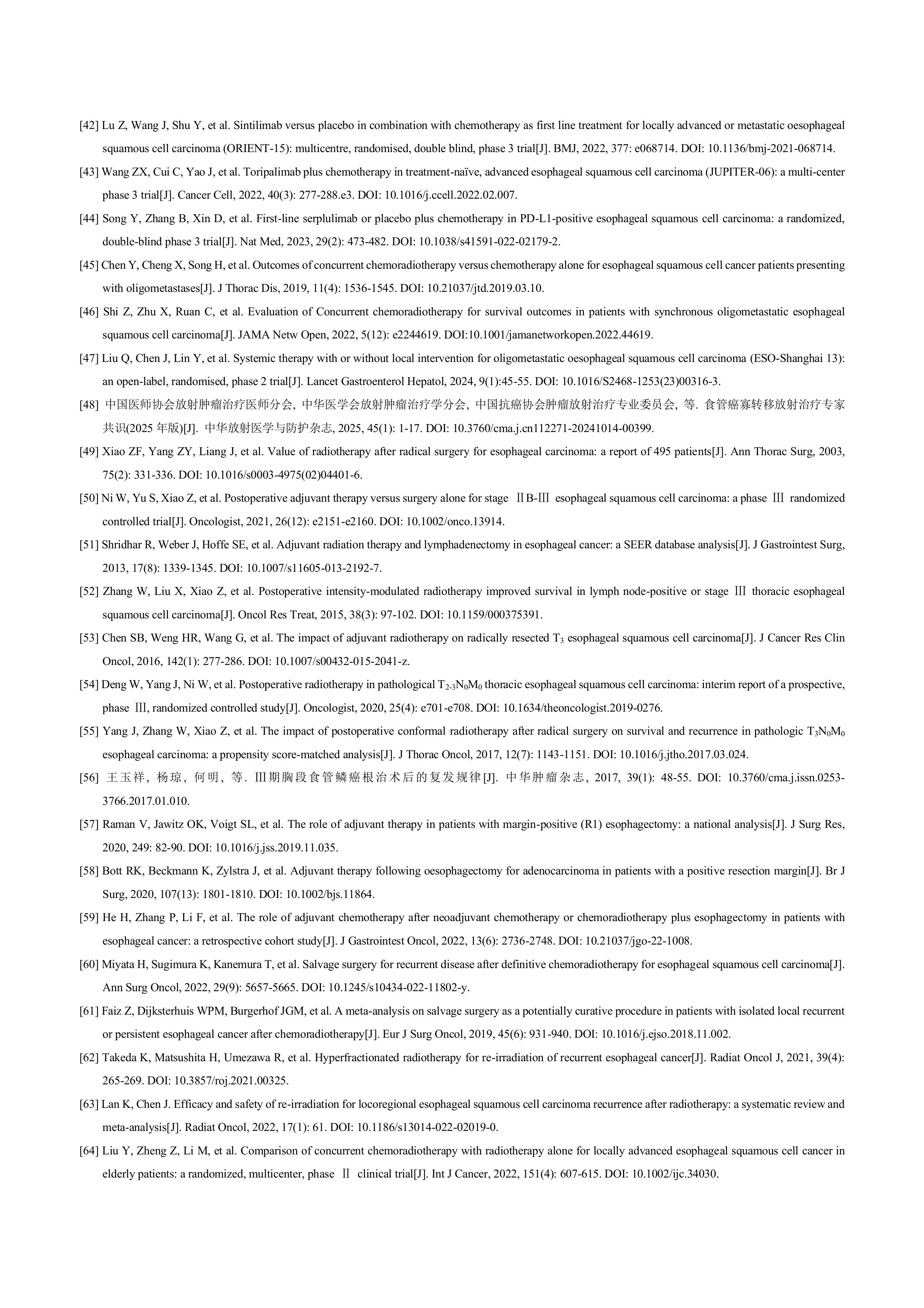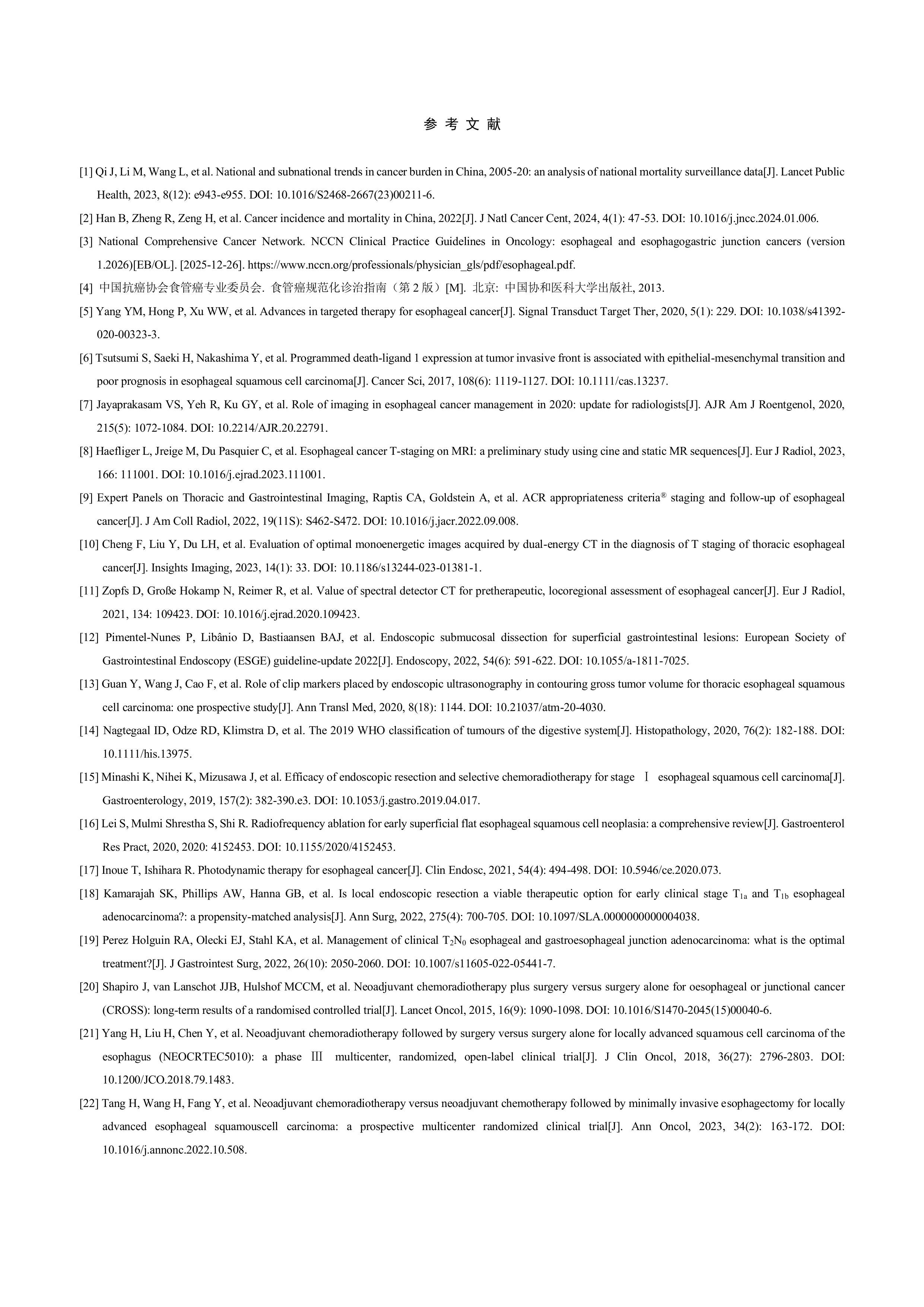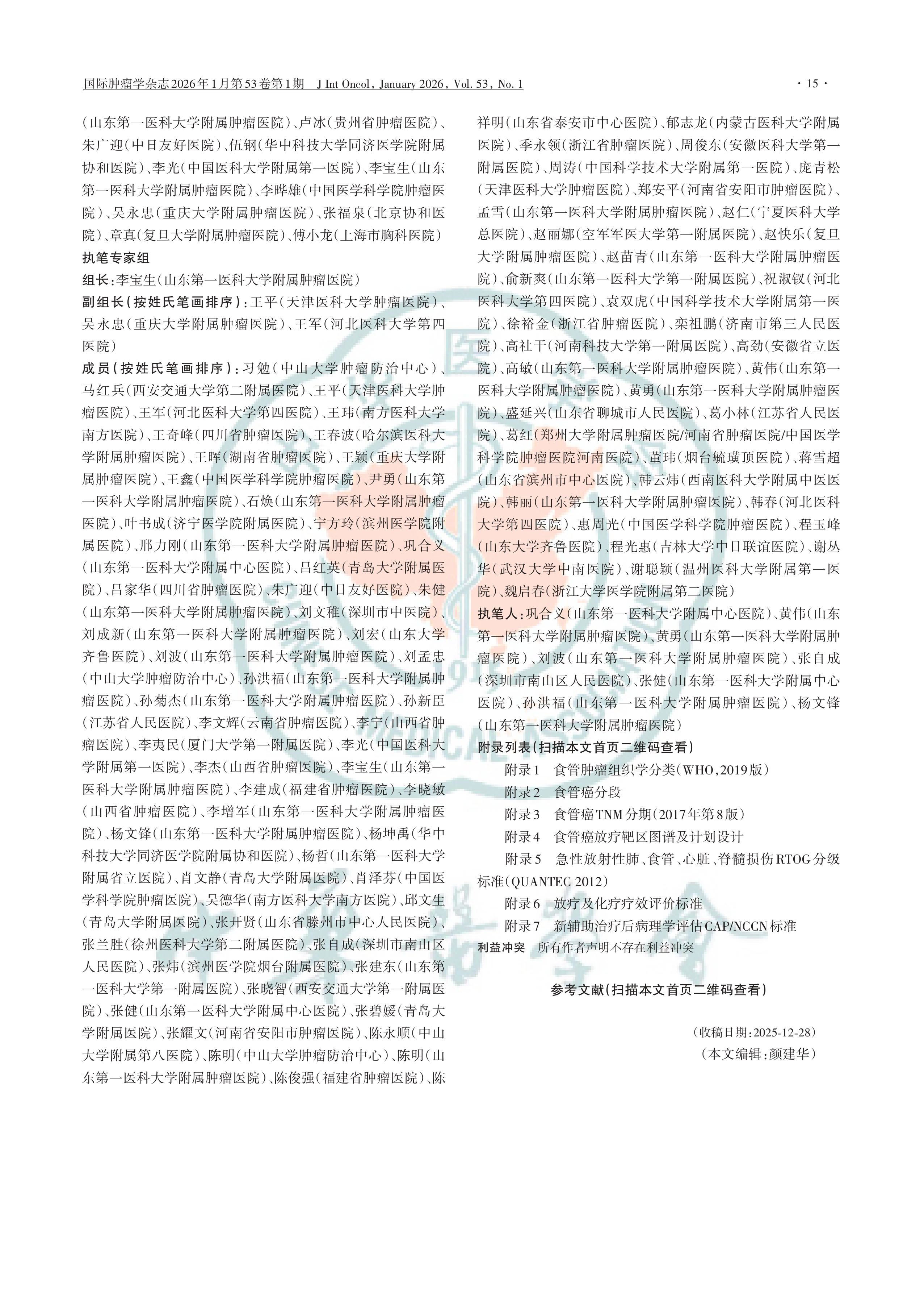 引用本文:中华医学会放射肿瘤治疗学分会, 中国医师协会放射肿瘤治疗医师分会, 中国抗癌协会肿瘤放射治疗专业委员会. 中国食管癌放射治疗指南(2025年版)[J]. 国际肿瘤学杂志, 2026, 53(1): 1-15. 专家组名单 顾问专家组(按姓氏笔画排序): 于金明 山东第一医科大学附属肿瘤医院 马 骏 中山大学肿瘤防治中心 王俊杰 北京大学第三医院 王绿化 中国医学科学院肿瘤医院深圳医院 郭小毛 复旦大学肿瘤医院 审定委员会 组长: 李晔雄 中国医学科学院肿瘤医院 成员(按姓氏笔画排序): 王 平 天津医科大学肿瘤医院 尹 勇 山东第一医科大学附属肿瘤医院 卢 冰 贵州省肿瘤医院 朱广迎 中日友好医院 伍 钢 华中科技大学同济医学院附属协和医院 李 光 中国医科大学附属第一医院 李宝生 山东第一医科大学附属肿瘤医院 李晔雄 中国医学科学院肿瘤医院 吴永忠 重庆大学附属肿瘤医院 张福泉 北京协和医院 章 真 复旦大学附属肿瘤医院 傅小龙 上海市胸科医院 执笔专家组 组长: 李宝生 山东第一医科大学附属肿瘤医院 副组长(按姓氏笔画排序): 王 平 天津医科大学肿瘤医院 吴永忠 重庆大学附属肿瘤医院 王 军 河北医科大学第四医院 成员(按姓氏笔画排序): 习 勉 中山大学肿瘤防治中心 马红兵 西安交通大学第二附属医院 王 平 天津医科大学肿瘤医院 王 军 河北医科大学第四医院 王 玮 南方医科大学南方医院 王奇峰 四川省肿瘤医院 王春波 哈尔滨医科大学附属肿瘤医院 王 晖 湖南省肿瘤医院 王 颖 重庆大学附属肿瘤医院 王 鑫 中国医学科学院肿瘤医院 尹 勇 山东第一医科大学附属肿瘤医院 石 焕 山东第一医科大学附属肿瘤医院 叶书成 济宁医学院附属医院 宁方玲 滨州医学院附属医院 邢力刚 山东第一医科大学附属肿瘤医院 巩合义 山东第一医科大学附属中心医院 吕红英 青岛大学附属医院 吕家华 四川省肿瘤医院 朱广迎 中日友好医院 朱 健 山东第一医科大学附属肿瘤医院 刘文稚 深圳市中医院 刘成新 山东第一医科大学附属肿瘤医院 刘 宏 山东大学齐鲁医院 刘 波 山东第一医科大学附属肿瘤医院 刘孟忠 中山大学肿瘤防治中心 孙洪福 山东第一医科大学附属肿瘤医院 孙菊杰 山东第一医科大学附属肿瘤医院 孙新臣 江苏省人民医院 李文辉 云南省肿瘤医院 李 宁 山西省肿瘤医院 李夷民 厦门大学第一附属医院 李 光 中国医科大学附属第一医院 李 杰 山西省肿瘤医院 李宝生 山东第一医科大学附属肿瘤医院 李建成 福建省肿瘤医院 李晓敏 山西省肿瘤医院 李增军 山东第一医科大学附属肿瘤医院 杨文锋 山东第一医科大学附属肿瘤医院 杨坤禹 华中科技大学同济医学院附属协和医院 杨 哲 山东第一医科大学附属省立医院 肖文静 青岛大学附属医院 肖泽芬 中国医学科学院肿瘤医院 吴德华 南方医科大学南方医院 邱文生 青岛大学附属医院 张开贤 山东省滕州市中心人民医院 张兰胜 徐州医科大学第二附属医院 张自成 深圳市南山区人民医院 张 炜 滨州医学院烟台附属医院 张建东 山东第一医科大学第一附属医院 张晓智 西安交通大学第一附属医院 张 健 山东第一医科大学附属中心医院 张碧媛 青岛大学附属医院 张耀文 河南省安阳市肿瘤医院 陈永顺 中山大学附属第八医院 陈 明 中山大学肿瘤防治中心 陈 明 山东第一医科大学附属肿瘤医院 陈俊强 福建省肿瘤医院 陈祥明 山东省泰安市中心医院 郁志龙 内蒙古医科大学附属医院 季永领 浙江省肿瘤医院 周俊东 安徽医科大学第一附属医院 周 涛 中国科学技术大学附属第一医院 庞青松 天津医科大学肿瘤医院 郑安平 河南省安阳市肿瘤医院 孟 雪 山东第一医科大学附属肿瘤医院 赵 仁 宁夏医科大学总医院 赵丽娜 空军军医大学第一附属医院 赵快乐 复旦大学附属肿瘤医院 赵苗青 山东第一医科大学附属肿瘤医院 俞新爽 山东第一医科大学第一附属医院 祝淑钗 河北医科大学第四医院 袁双虎 中国科学技术大学附属第一医院 徐裕金 浙江省肿瘤医院 栾祖鹏 济南市第三人民医院 高社干 河南科技大学第一附属医院 高 劲 安徽省立医院 高 敏 山东第一医科大学附属肿瘤医院 黄 伟 山东第一医科大学附属肿瘤医院 黄 勇 山东第一医科大学附属肿瘤医院 盛延兴 山东省聊城市人民医院 葛小林 江苏省人民医院 葛 红 郑州大学附属肿瘤医院/河南省肿瘤医院/中国医学科学院肿瘤医院河南医院 董 玮 烟台毓璜顶医院 蒋雪超 山东省滨州市中心医院 韩云炜 西南医科大学附属中医医院 韩 丽 山东第一医科大学附属肿瘤医院 韩 春 河北医科大学第四医院 惠周光 中国医学科学院肿瘤医院 程玉峰 山东大学齐鲁医院 程光惠 吉林大学中日联谊医院 谢丛华 武汉大学中南医院 谢聪颖 温州医科大学附属第一医院 魏启春 浙江大学医学院附属第二医院 执笔人 巩合义 山东第一医科大学附属中心医院 黄 伟 山东第一医科大学附属肿瘤医院 黄 勇 山东第一医科大学附属肿瘤医院 刘 波 山东第一医科大学附属肿瘤医院 张自成 深圳市南山区人民医院 张 健 山东第一医科大学附属中心医院 孙洪福 山东第一医科大学附属肿瘤医院 杨文锋 山东第一医科大学附属肿瘤医院 识别二维码下载原文 指南全文浏览 来源:国际肿瘤学杂志