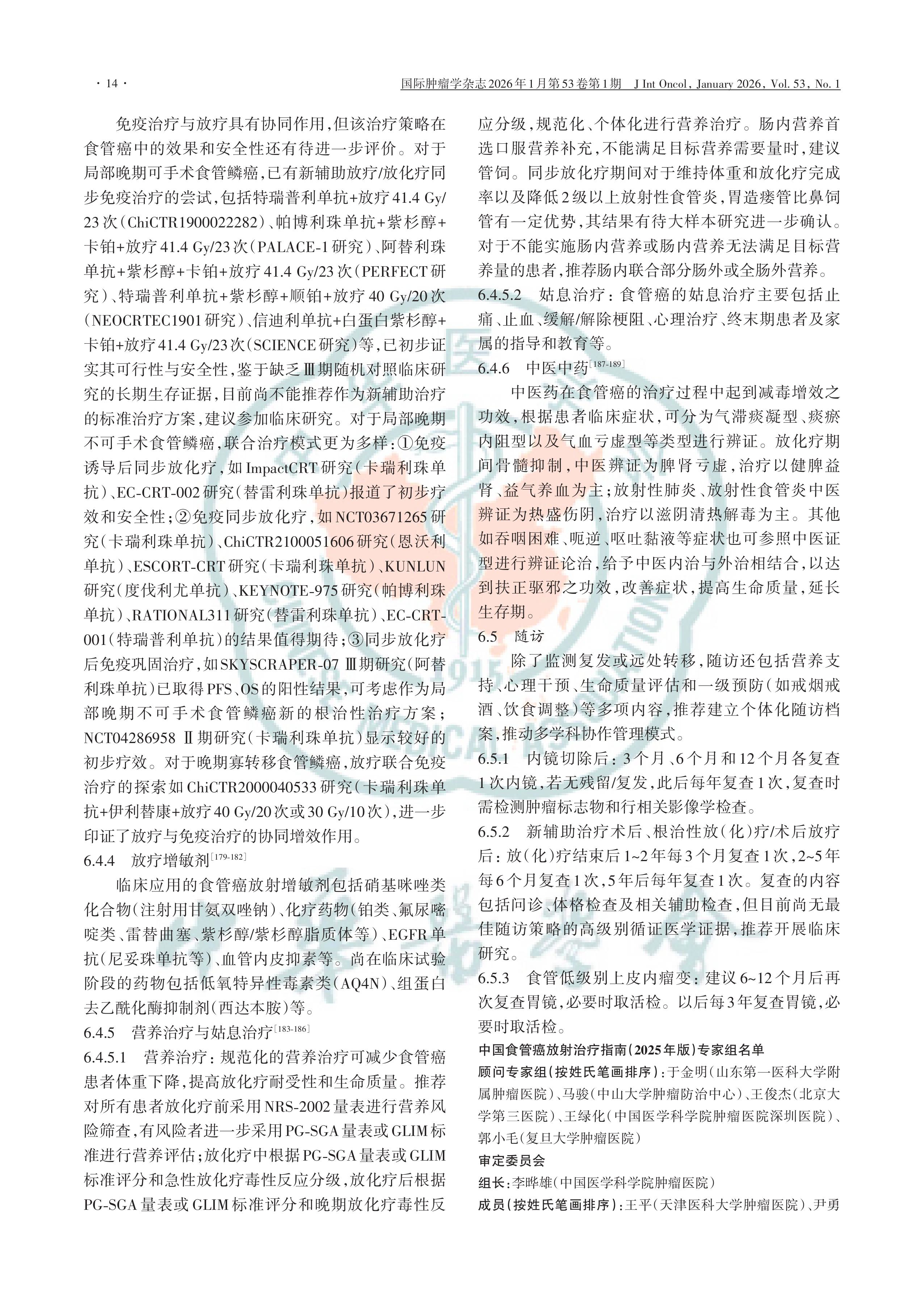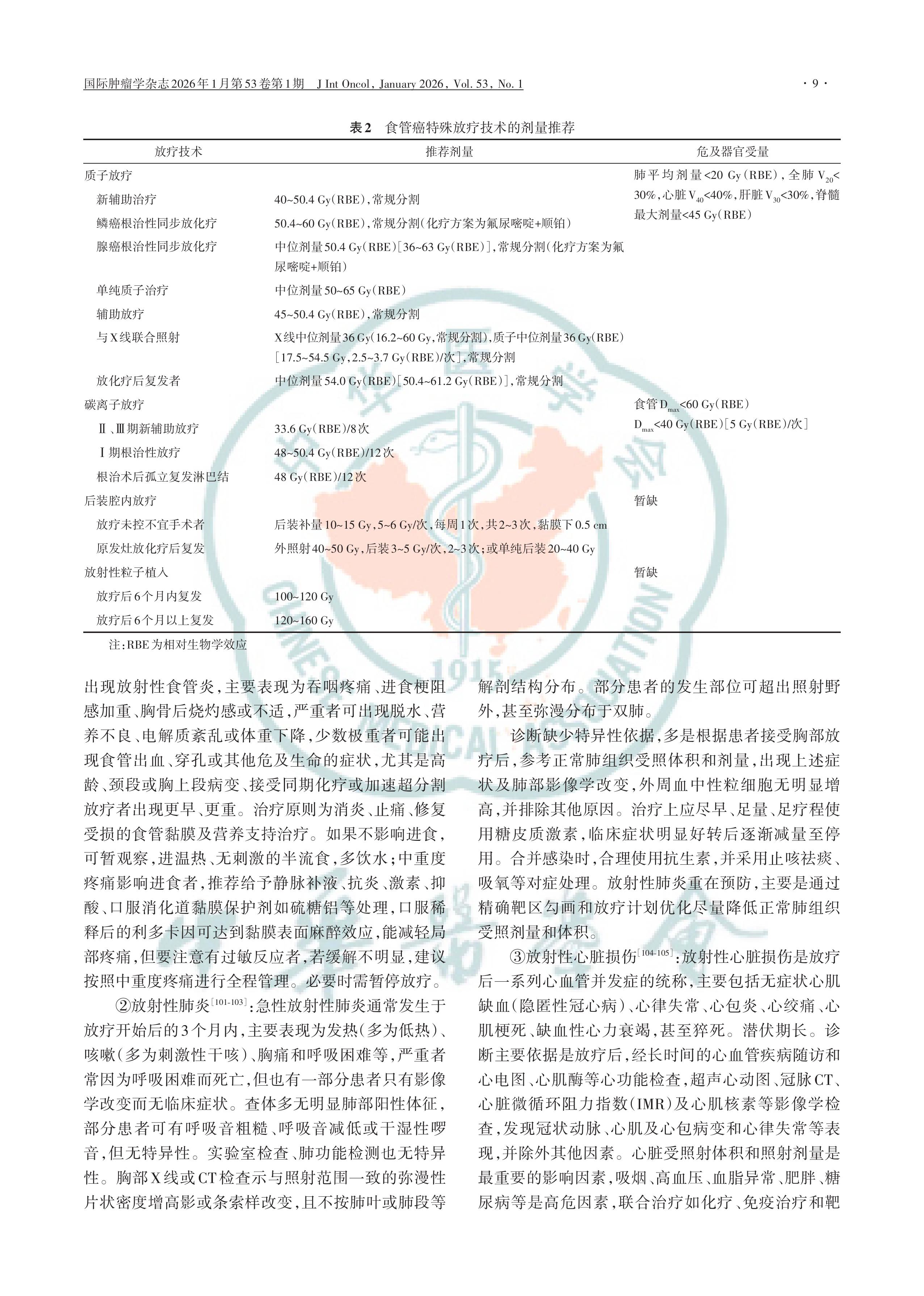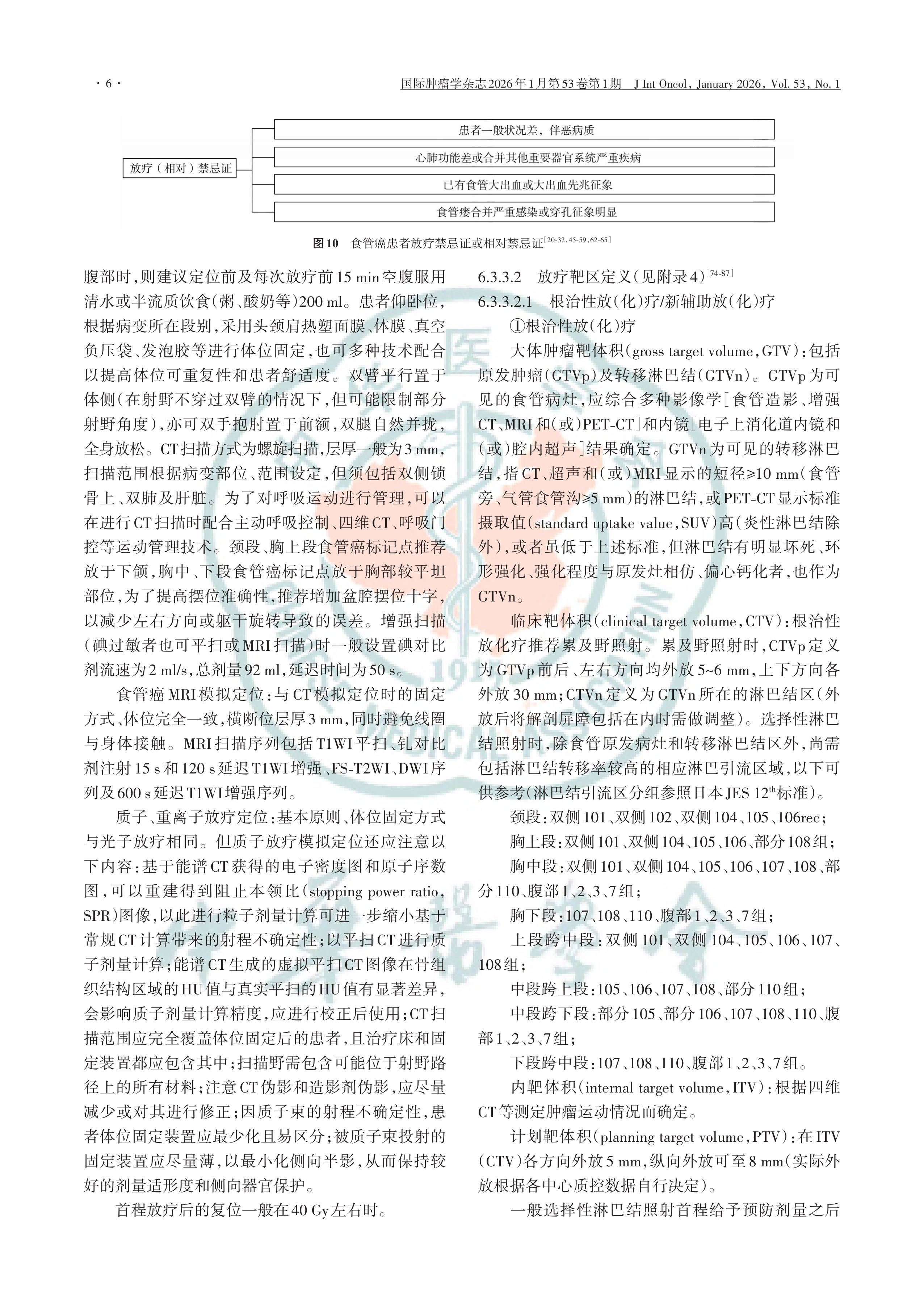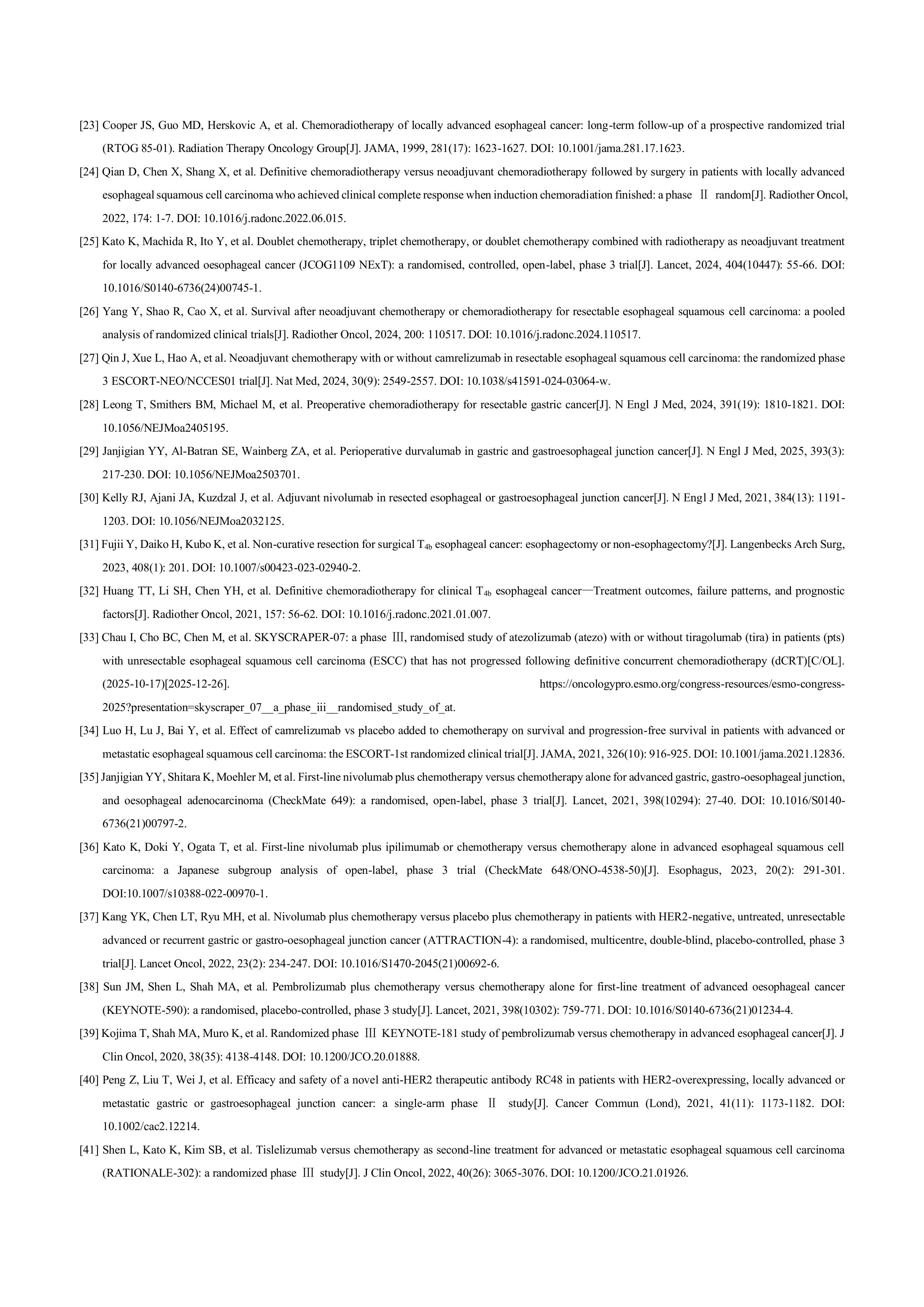 引用本文:中华医学会放射肿瘤治疗学分会, 中国医师协会放射肿瘤治疗医师分会, 中国抗癌协会肿瘤放射治疗专业委员会. 中国食管癌放射治疗指南(2025年版)[J]. 国际肿瘤学杂志, 2026, 53(1): 1-15. 专家组名单 顾问专家组(按姓氏笔画排序): 于金明 山东第一医科大学附属肿瘤医院 马 骏 中山大学肿瘤防治中心 王俊杰 北京大学第三医院 王绿化 中国医学科学院肿瘤医院深圳医院 郭小毛 复旦大学肿瘤医院 审定委员会 组长: 李晔雄 中国医学科学院肿瘤医院 成员(按姓氏笔画排序): 王 平 天津医科大学肿瘤医院 尹 勇 山东第一医科大学附属肿瘤医院 卢 冰 贵州省肿瘤医院 朱广迎 中日友好医院 伍 钢 华中科技大学同济医学院附属协和医院 李 光 中国医科大学附属第一医院 李宝生 山东第一医科大学附属肿瘤医院 李晔雄 中国医学科学院肿瘤医院 吴永忠 重庆大学附属肿瘤医院 张福泉 北京协和医院 章 真 复旦大学附属肿瘤医院 傅小龙 上海市胸科医院 执笔专家组 组长: 李宝生 山东第一医科大学附属肿瘤医院 副组长(按姓氏笔画排序): 王 平 天津医科大学肿瘤医院 吴永忠 重庆大学附属肿瘤医院 王 军 河北医科大学第四医院 成员(按姓氏笔画排序): 习 勉 中山大学肿瘤防治中心 马红兵 西安交通大学第二附属医院 王 平 天津医科大学肿瘤医院 王 军 河北医科大学第四医院 王 玮 南方医科大学南方医院 王奇峰 四川省肿瘤医院 王春波 哈尔滨医科大学附属肿瘤医院 王 晖 湖南省肿瘤医院 王 颖 重庆大学附属肿瘤医院 王 鑫 中国医学科学院肿瘤医院 尹 勇 山东第一医科大学附属肿瘤医院 石 焕 山东第一医科大学附属肿瘤医院 叶书成 济宁医学院附属医院 宁方玲 滨州医学院附属医院 邢力刚 山东第一医科大学附属肿瘤医院 巩合义 山东第一医科大学附属中心医院 吕红英 青岛大学附属医院 吕家华 四川省肿瘤医院 朱广迎 中日友好医院 朱 健 山东第一医科大学附属肿瘤医院 刘文稚 深圳市中医院 刘成新 山东第一医科大学附属肿瘤医院 刘 宏 山东大学齐鲁医院 刘 波 山东第一医科大学附属肿瘤医院 刘孟忠 中山大学肿瘤防治中心 孙洪福 山东第一医科大学附属肿瘤医院 孙菊杰 山东第一医科大学附属肿瘤医院 孙新臣 江苏省人民医院 李文辉 云南省肿瘤医院 李 宁 山西省肿瘤医院 李夷民 厦门大学第一附属医院 李 光 中国医科大学附属第一医院 李 杰 山西省肿瘤医院 李宝生 山东第一医科大学附属肿瘤医院 李建成 福建省肿瘤医院 李晓敏 山西省肿瘤医院 李增军 山东第一医科大学附属肿瘤医院 杨文锋 山东第一医科大学附属肿瘤医院 杨坤禹 华中科技大学同济医学院附属协和医院 杨 哲 山东第一医科大学附属省立医院 肖文静 青岛大学附属医院 肖泽芬 中国医学科学院肿瘤医院 吴德华 南方医科大学南方医院 邱文生 青岛大学附属医院 张开贤 山东省滕州市中心人民医院 张兰胜 徐州医科大学第二附属医院 张自成 深圳市南山区人民医院 张 炜 滨州医学院烟台附属医院 张建东 山东第一医科大学第一附属医院 张晓智 西安交通大学第一附属医院 张 健 山东第一医科大学附属中心医院 张碧媛 青岛大学附属医院 张耀文 河南省安阳市肿瘤医院 陈永顺 中山大学附属第八医院 陈 明 中山大学肿瘤防治中心 陈 明 山东第一医科大学附属肿瘤医院 陈俊强 福建省肿瘤医院 陈祥明 山东省泰安市中心医院 郁志龙 内蒙古医科大学附属医院 季永领 浙江省肿瘤医院 周俊东 安徽医科大学第一附属医院 周 涛 中国科学技术大学附属第一医院 庞青松 天津医科大学肿瘤医院 郑安平 河南省安阳市肿瘤医院 孟 雪 山东第一医科大学附属肿瘤医院 赵 仁 宁夏医科大学总医院 赵丽娜 空军军医大学第一附属医院 赵快乐 复旦大学附属肿瘤医院 赵苗青 山东第一医科大学附属肿瘤医院 俞新爽 山东第一医科大学第一附属医院 祝淑钗 河北医科大学第四医院 袁双虎 中国科学技术大学附属第一医院 徐裕金 浙江省肿瘤医院 栾祖鹏 济南市第三人民医院 高社干 河南科技大学第一附属医院 高 劲 安徽省立医院 高 敏 山东第一医科大学附属肿瘤医院 黄 伟 山东第一医科大学附属肿瘤医院 黄 勇 山东第一医科大学附属肿瘤医院 盛延兴 山东省聊城市人民医院 葛小林 江苏省人民医院 葛 红 郑州大学附属肿瘤医院/河南省肿瘤医院/中国医学科学院肿瘤医院河南医院 董 玮 烟台毓璜顶医院 蒋雪超 山东省滨州市中心医院 韩云炜 西南医科大学附属中医医院 韩 丽 山东第一医科大学附属肿瘤医院 韩 春 河北医科大学第四医院 惠周光 中国医学科学院肿瘤医院 程玉峰 山东大学齐鲁医院 程光惠 吉林大学中日联谊医院 谢丛华 武汉大学中南医院 谢聪颖 温州医科大学附属第一医院 魏启春 浙江大学医学院附属第二医院 执笔人 巩合义 山东第一医科大学附属中心医院 黄 伟 山东第一医科大学附属肿瘤医院 黄 勇 山东第一医科大学附属肿瘤医院 刘 波 山东第一医科大学附属肿瘤医院 张自成 深圳市南山区人民医院 张 健 山东第一医科大学附属中心医院 孙洪福 山东第一医科大学附属肿瘤医院 杨文锋 山东第一医科大学附属肿瘤医院 识别二维码下载原文 指南全文浏览 来源:国际肿瘤学杂志