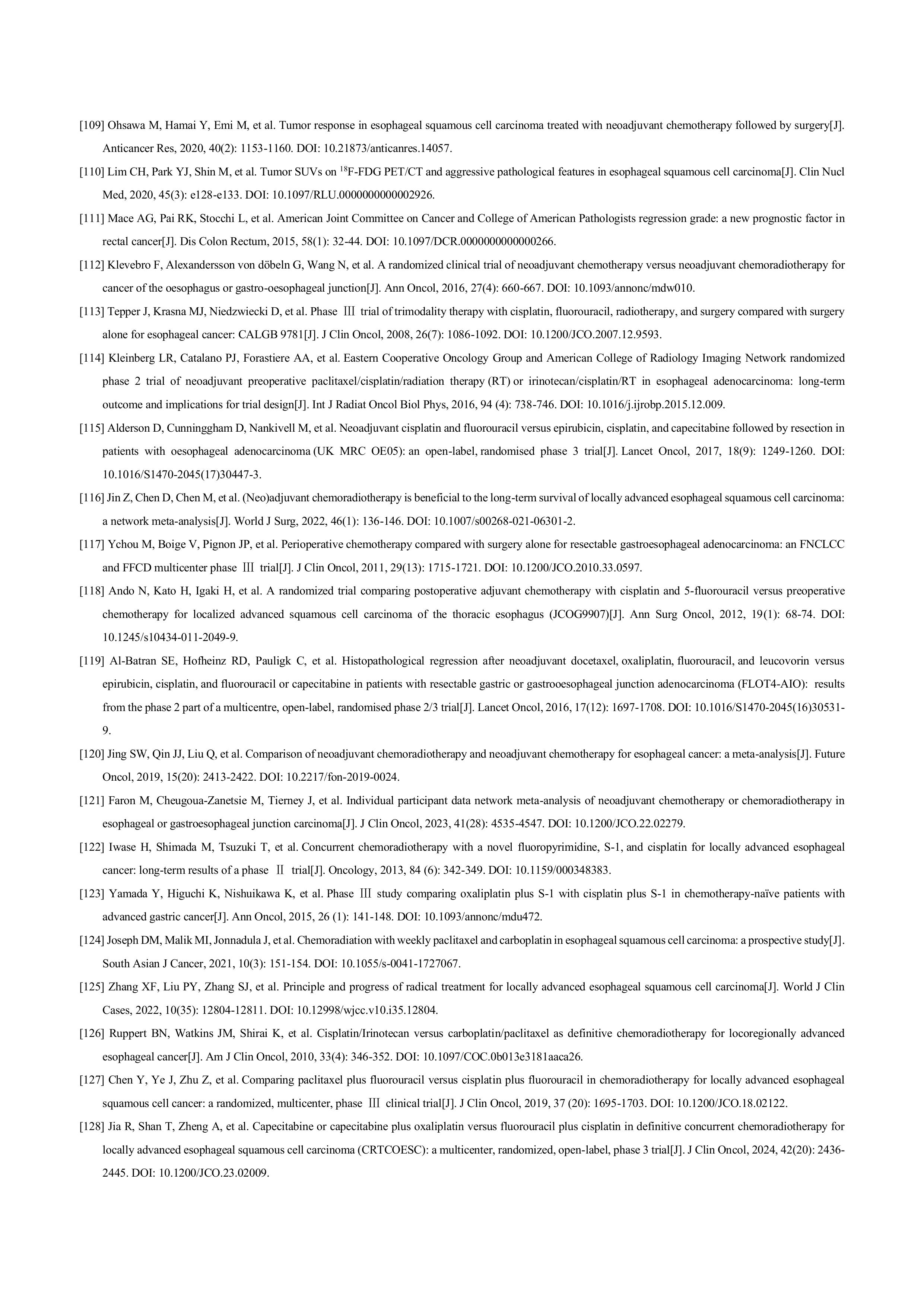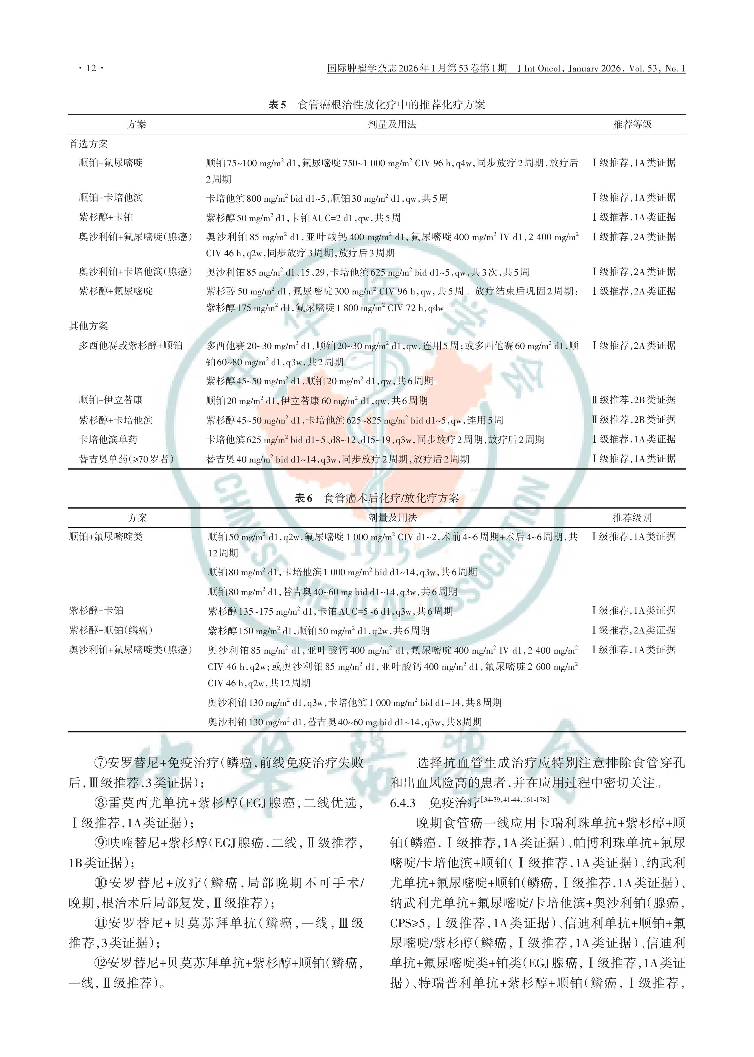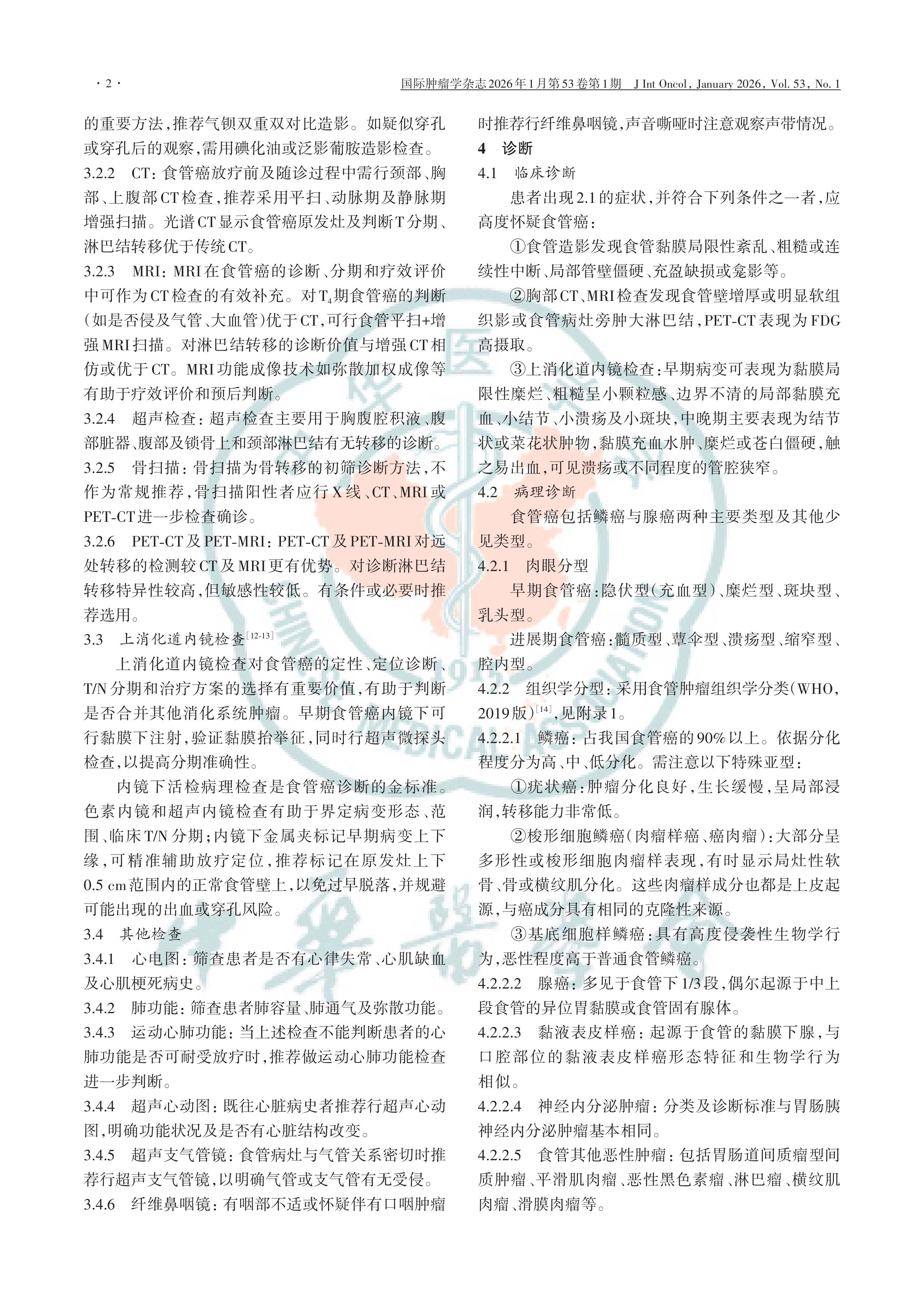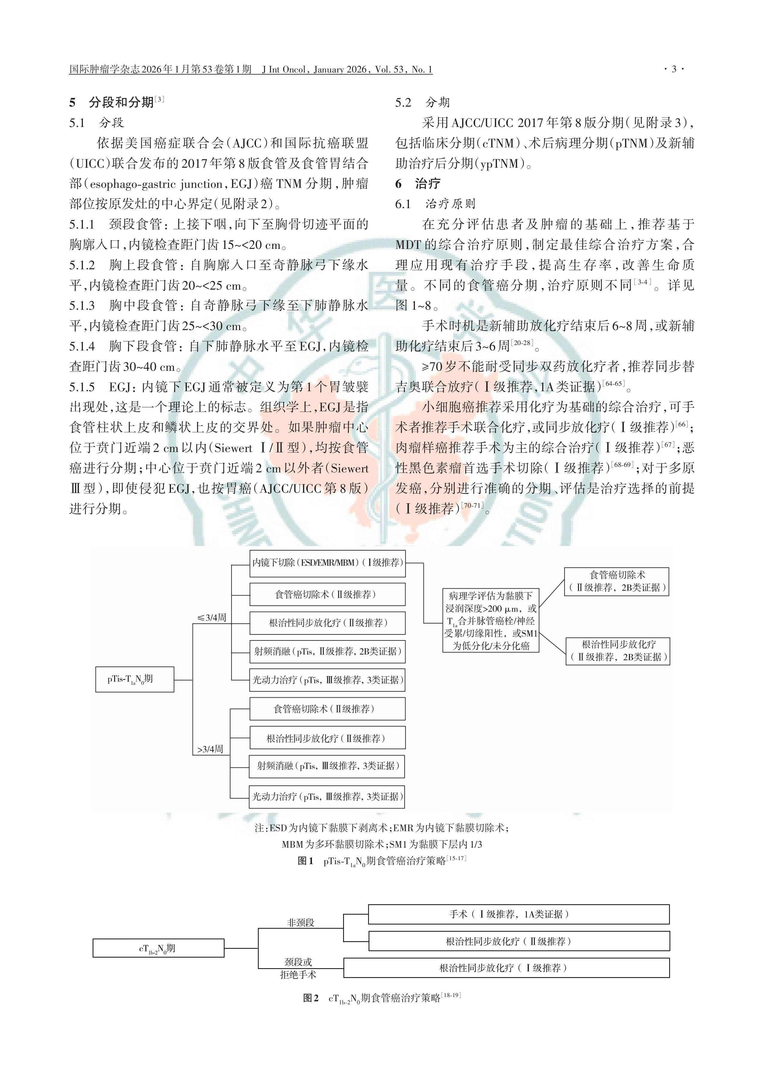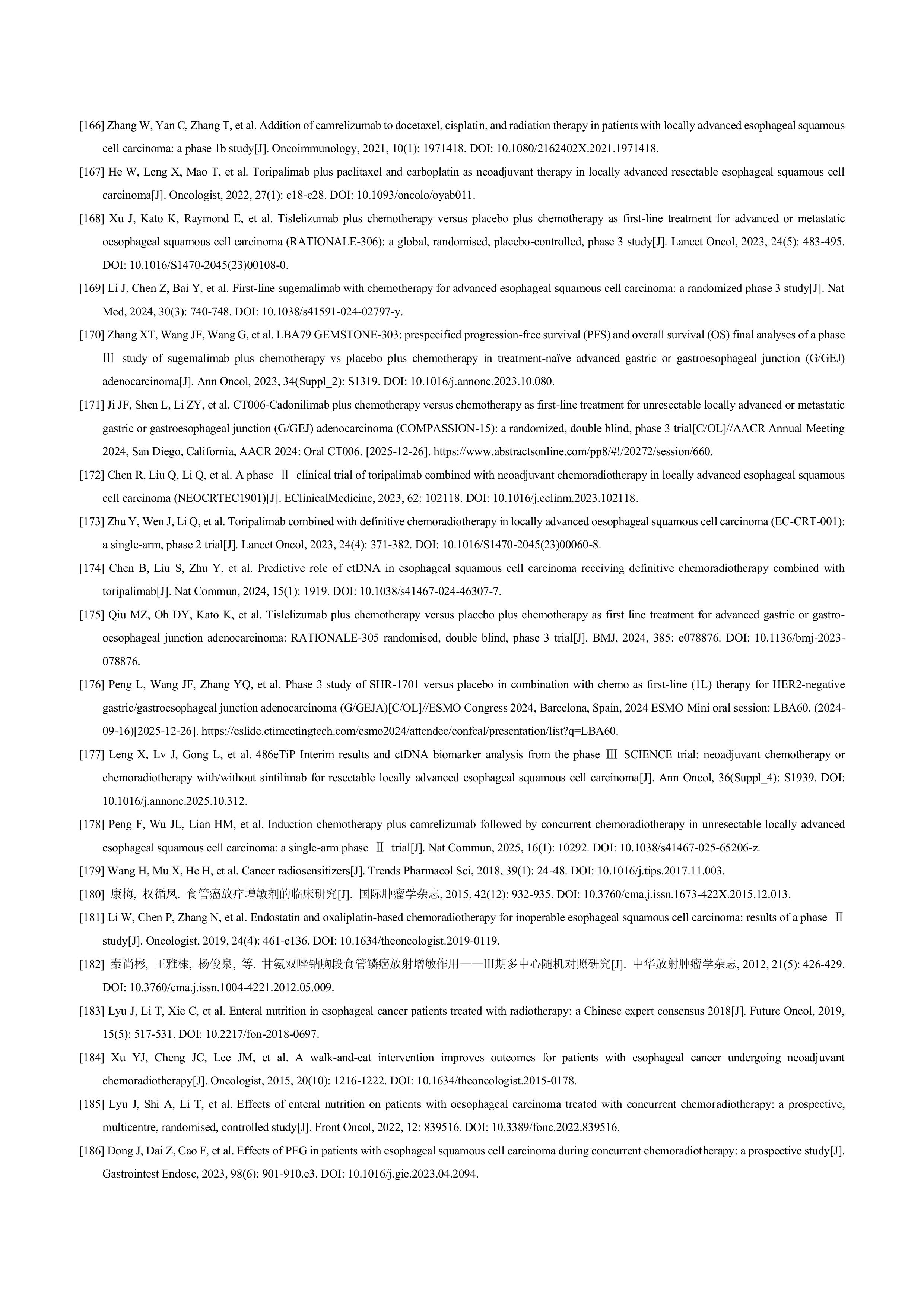引用本文:中华医学会放射肿瘤治疗学分会, 中国医师协会放射肿瘤治疗医师分会, 中国抗癌协会肿瘤放射治疗专业委员会. 中国食管癌放射治疗指南(2025年版)[J]. 国际肿瘤学杂志, 2026, 53(1): 1-15. 专家组名单 顾问专家组(按姓氏笔画排序): 于金明 山东第一医科大学附属肿瘤医院 马 骏 中山大学肿瘤防治中心 王俊杰 北京大学第三医院 王绿化 中国医学科学院肿瘤医院深圳医院 郭小毛 复旦大学肿瘤医院 审定委员会 组长: 李晔雄 中国医学科学院肿瘤医院 成员(按姓氏笔画排序): 王 平 天津医科大学肿瘤医院 尹 勇 山东第一医科大学附属肿瘤医院 卢 冰 贵州省肿瘤医院 朱广迎 中日友好医院 伍 钢 华中科技大学同济医学院附属协和医院 李 光 中国医科大学附属第一医院 李宝生 山东第一医科大学附属肿瘤医院 李晔雄 中国医学科学院肿瘤医院 吴永忠 重庆大学附属肿瘤医院 张福泉 北京协和医院 章 真 复旦大学附属肿瘤医院 傅小龙 上海市胸科医院 执笔专家组 组长: 李宝生 山东第一医科大学附属肿瘤医院 副组长(按姓氏笔画排序): 王 平 天津医科大学肿瘤医院 吴永忠 重庆大学附属肿瘤医院 王 军 河北医科大学第四医院 成员(按姓氏笔画排序): 习 勉 中山大学肿瘤防治中心 马红兵 西安交通大学第二附属医院 王 平 天津医科大学肿瘤医院 王 军 河北医科大学第四医院 王 玮 南方医科大学南方医院 王奇峰 四川省肿瘤医院 王春波 哈尔滨医科大学附属肿瘤医院 王 晖 湖南省肿瘤医院 王 颖 重庆大学附属肿瘤医院 王 鑫 中国医学科学院肿瘤医院 尹 勇 山东第一医科大学附属肿瘤医院 石 焕 山东第一医科大学附属肿瘤医院 叶书成 济宁医学院附属医院 宁方玲 滨州医学院附属医院 邢力刚 山东第一医科大学附属肿瘤医院 巩合义 山东第一医科大学附属中心医院 吕红英 青岛大学附属医院 吕家华 四川省肿瘤医院 朱广迎 中日友好医院 朱 健 山东第一医科大学附属肿瘤医院 刘文稚 深圳市中医院 刘成新 山东第一医科大学附属肿瘤医院 刘 宏 山东大学齐鲁医院 刘 波 山东第一医科大学附属肿瘤医院 刘孟忠 中山大学肿瘤防治中心 孙洪福 山东第一医科大学附属肿瘤医院 孙菊杰 山东第一医科大学附属肿瘤医院 孙新臣 江苏省人民医院 李文辉 云南省肿瘤医院 李 宁 山西省肿瘤医院 李夷民 厦门大学第一附属医院 李 光 中国医科大学附属第一医院 李 杰 山西省肿瘤医院 李宝生 山东第一医科大学附属肿瘤医院 李建成 福建省肿瘤医院 李晓敏 山西省肿瘤医院 李增军 山东第一医科大学附属肿瘤医院 杨文锋 山东第一医科大学附属肿瘤医院 杨坤禹 华中科技大学同济医学院附属协和医院 杨 哲 山东第一医科大学附属省立医院 肖文静 青岛大学附属医院 肖泽芬 中国医学科学院肿瘤医院 吴德华 南方医科大学南方医院 邱文生 青岛大学附属医院 张开贤 山东省滕州市中心人民医院 张兰胜 徐州医科大学第二附属医院 张自成 深圳市南山区人民医院 张 炜 滨州医学院烟台附属医院 张建东 山东第一医科大学第一附属医院 张晓智 西安交通大学第一附属医院 张 健 山东第一医科大学附属中心医院 张碧媛 青岛大学附属医院 张耀文 河南省安阳市肿瘤医院 陈永顺 中山大学附属第八医院 陈 明 中山大学肿瘤防治中心 陈 明 山东第一医科大学附属肿瘤医院 陈俊强 福建省肿瘤医院 陈祥明 山东省泰安市中心医院 郁志龙 内蒙古医科大学附属医院 季永领 浙江省肿瘤医院 周俊东 安徽医科大学第一附属医院 周 涛 中国科学技术大学附属第一医院 庞青松 天津医科大学肿瘤医院 郑安平 河南省安阳市肿瘤医院 孟 雪 山东第一医科大学附属肿瘤医院 赵 仁 宁夏医科大学总医院 赵丽娜 空军军医大学第一附属医院 赵快乐 复旦大学附属肿瘤医院 赵苗青 山东第一医科大学附属肿瘤医院 俞新爽 山东第一医科大学第一附属医院 祝淑钗 河北医科大学第四医院 袁双虎 中国科学技术大学附属第一医院 徐裕金 浙江省肿瘤医院 栾祖鹏 济南市第三人民医院 高社干 河南科技大学第一附属医院 高 劲 安徽省立医院 高 敏 山东第一医科大学附属肿瘤医院 黄 伟 山东第一医科大学附属肿瘤医院 黄 勇 山东第一医科大学附属肿瘤医院 盛延兴 山东省聊城市人民医院 葛小林 江苏省人民医院 葛 红 郑州大学附属肿瘤医院/河南省肿瘤医院/中国医学科学院肿瘤医院河南医院 董 玮 烟台毓璜顶医院 蒋雪超 山东省滨州市中心医院 韩云炜 西南医科大学附属中医医院 韩 丽 山东第一医科大学附属肿瘤医院 韩 春 河北医科大学第四医院 惠周光 中国医学科学院肿瘤医院 程玉峰 山东大学齐鲁医院 程光惠 吉林大学中日联谊医院 谢丛华 武汉大学中南医院 谢聪颖 温州医科大学附属第一医院 魏启春 浙江大学医学院附属第二医院 执笔人 巩合义 山东第一医科大学附属中心医院 黄 伟 山东第一医科大学附属肿瘤医院 黄 勇 山东第一医科大学附属肿瘤医院 刘 波 山东第一医科大学附属肿瘤医院 张自成 深圳市南山区人民医院 张 健 山东第一医科大学附属中心医院 孙洪福 山东第一医科大学附属肿瘤医院 杨文锋 山东第一医科大学附属肿瘤医院 识别二维码下载原文 指南全文浏览 来源:国际肿瘤学杂志