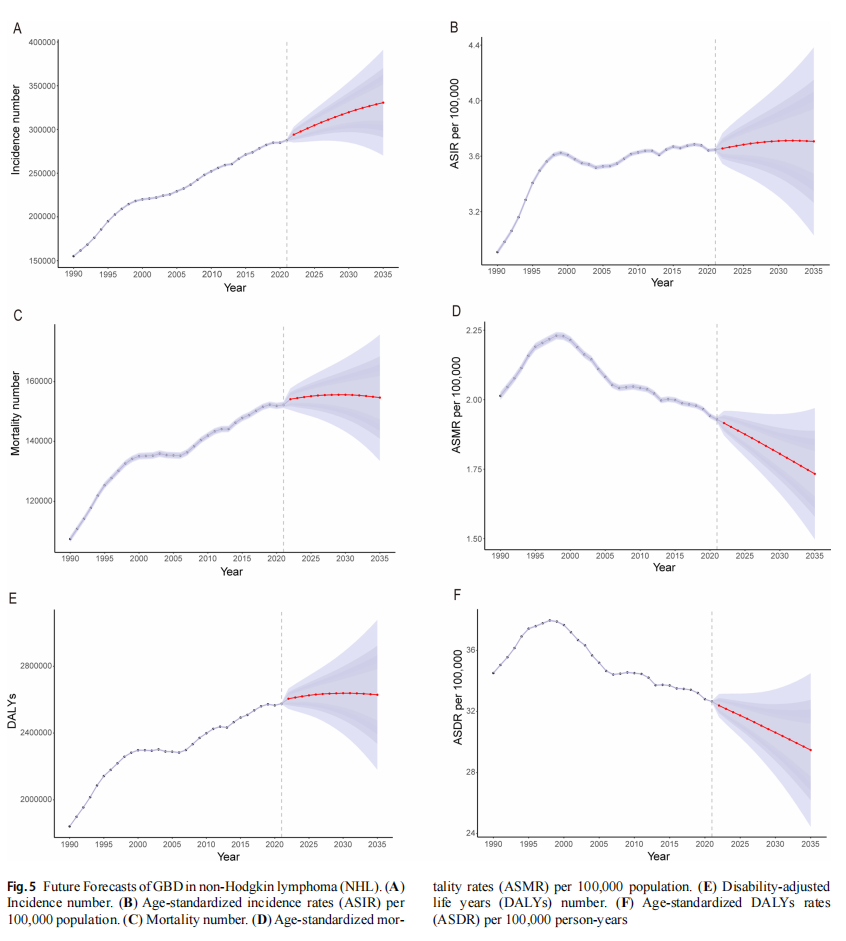 从1990年到2021年,全球老年NHL发病率和患病率整体呈上升趋势,而死亡率和伤残调整生命年则趋于下降。据估计到2035年,ASIR将保持相对稳定,而ASMR和ASDR将呈下降趋势。