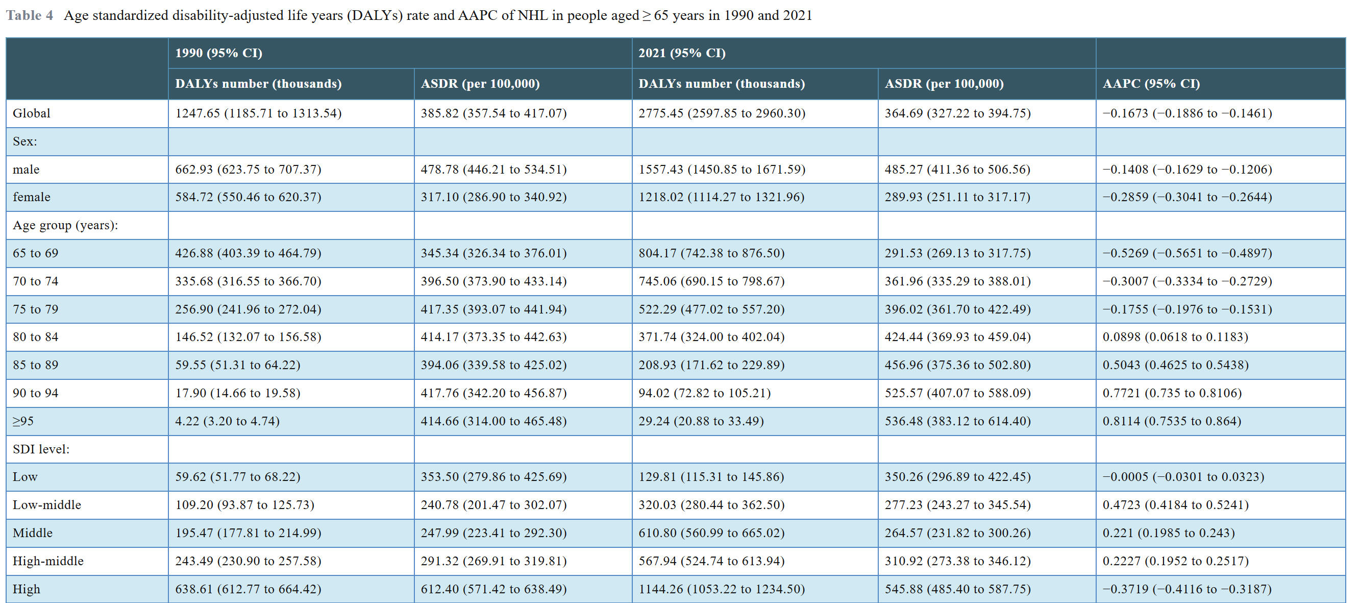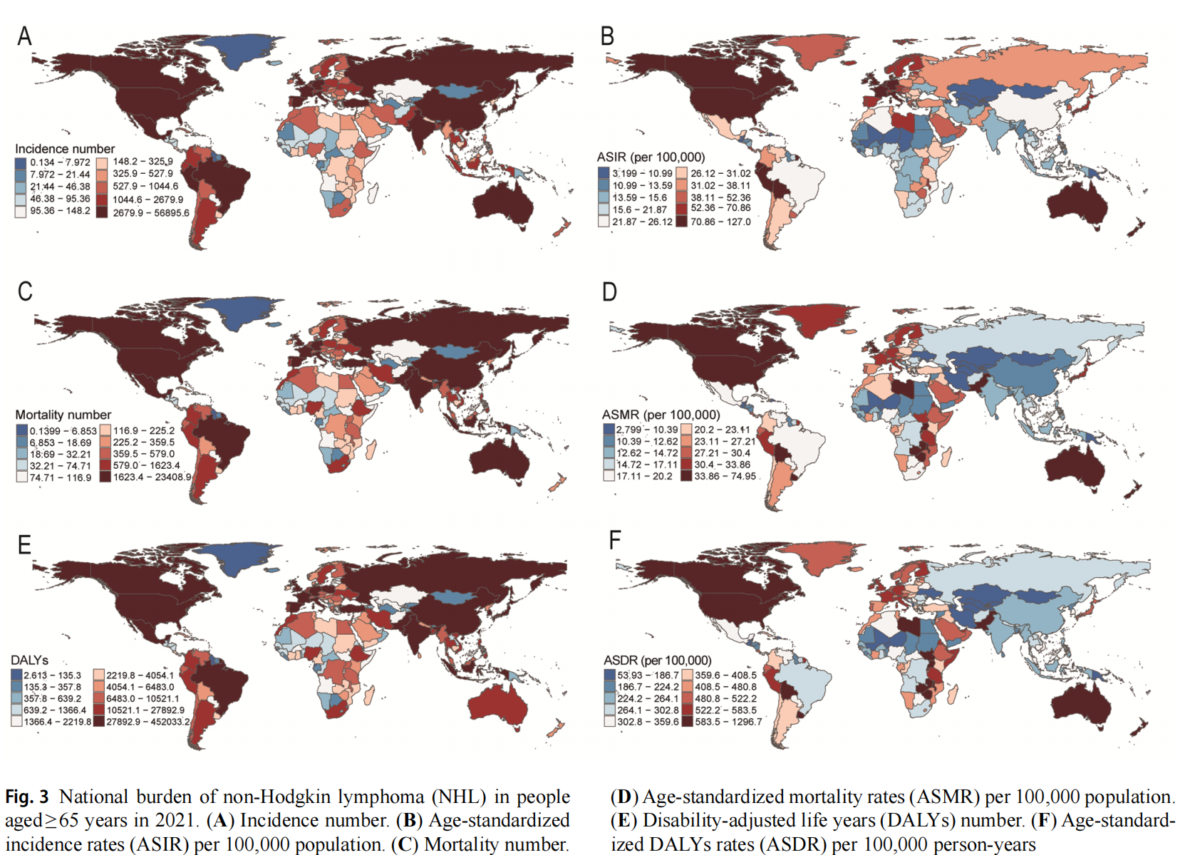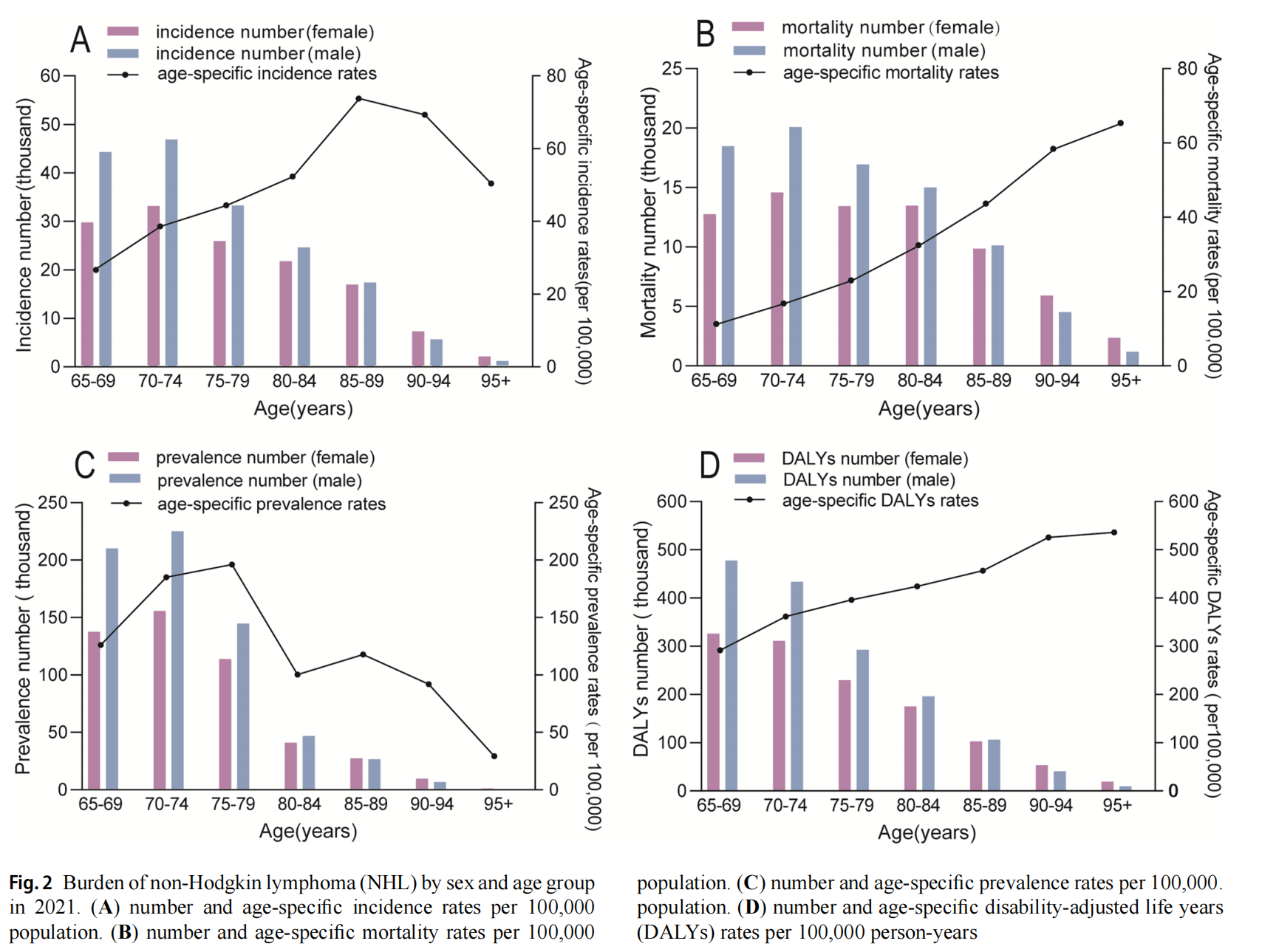 2021年,全球≥65岁人群中,非霍奇金淋巴瘤的患病人数约为1,147,321例,年龄标准化患病率(ASPR)为148.21/10万。全球≥65岁人群中报告的NHL新发病例为306,296例,死亡病例为158,813例,年龄标准化发病率(ASIR)和年龄标准化死亡率(ASMR)分别为59.20/10万和21.46/10万。伤残调整生命年(DALY)约为2,775,447人年,年龄标准化DALY率(ASDR)为364.69/10万人年。