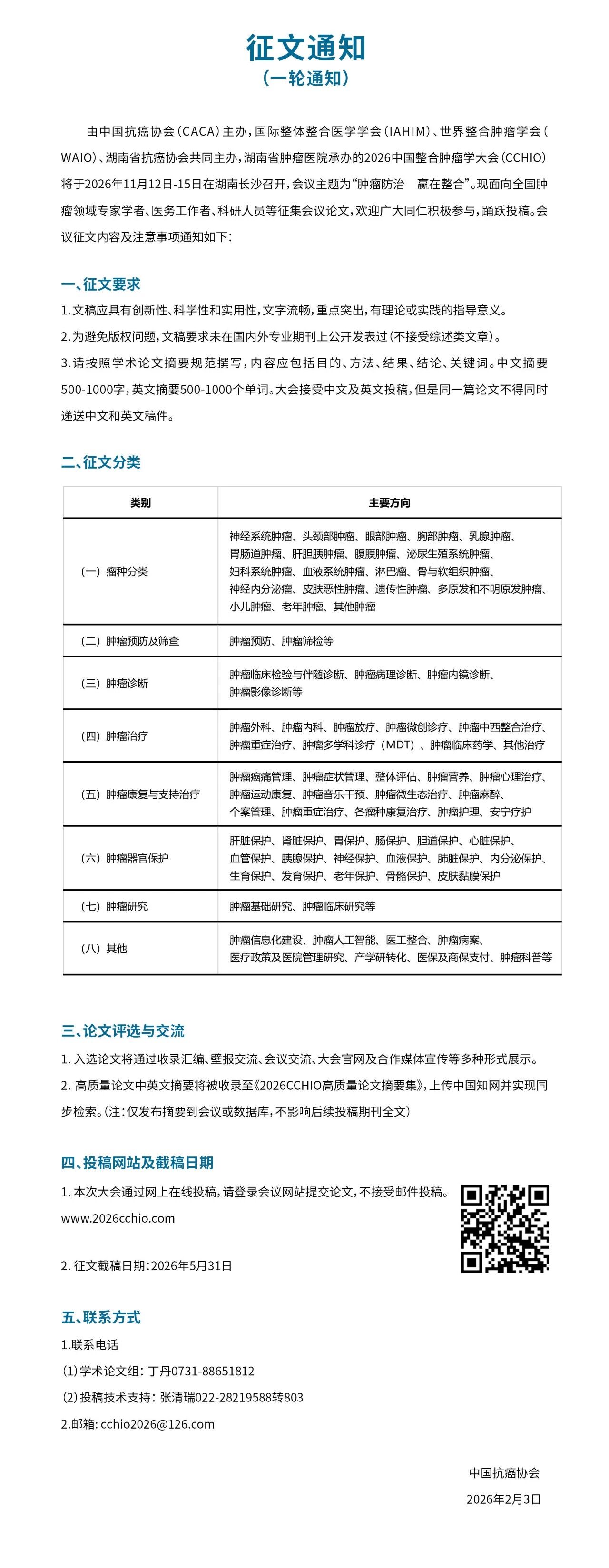 2026中国整合肿瘤学大会(CCHIO)征文通知(一轮通知)