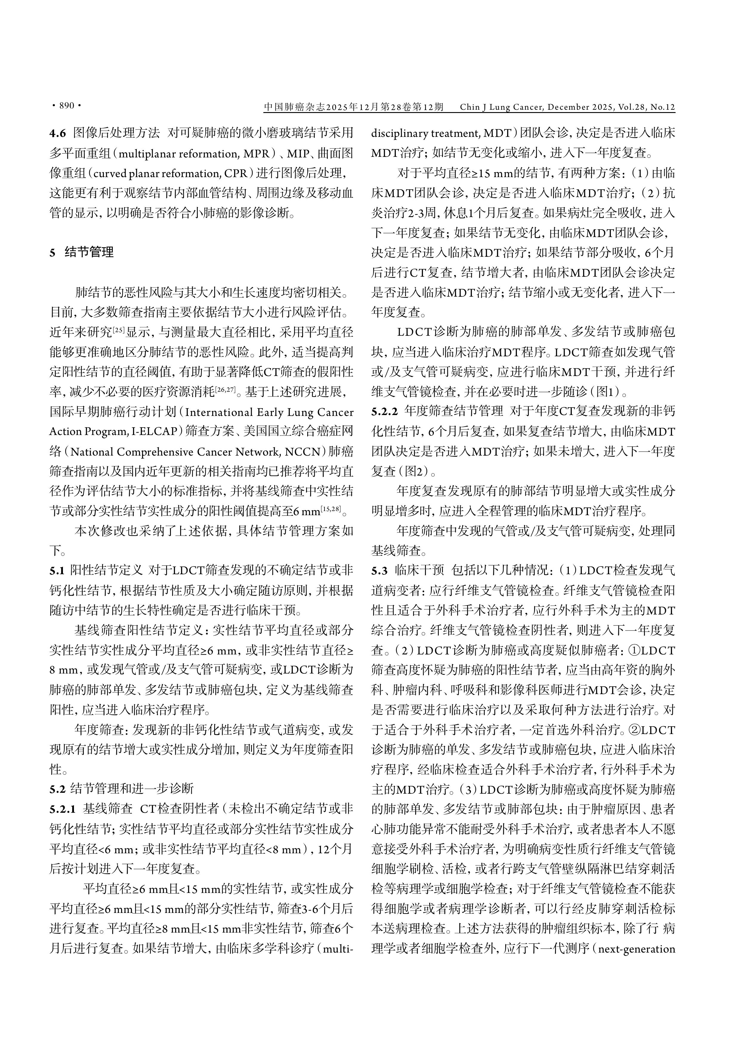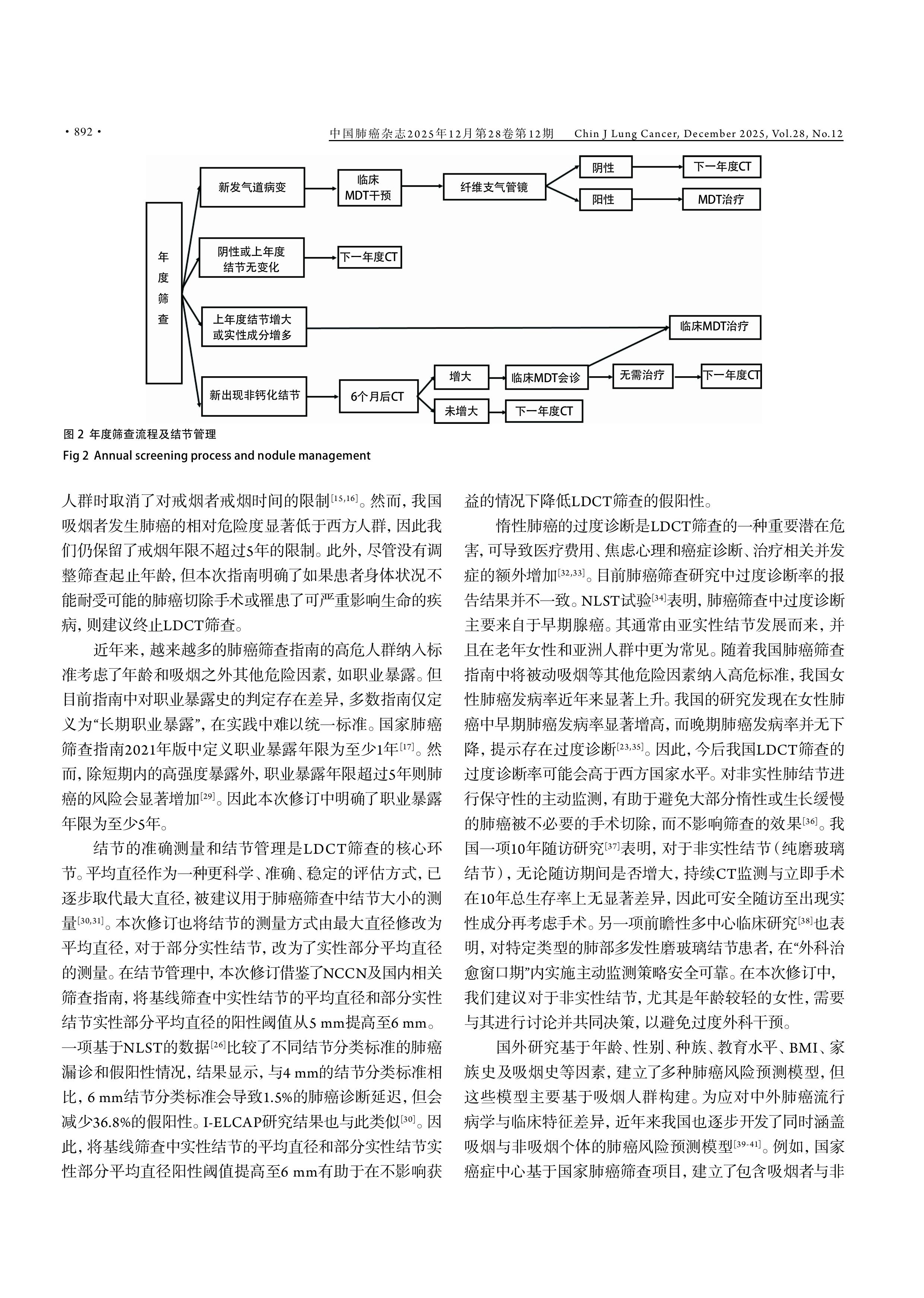 【摘要】肺癌是导致中国癌症死亡的首要原因。通过优化肺癌筛查策略,提高筛查效率,减少相关危害已成为当前肺癌筛查的研究热点和方向。本文的目的是对2023年中国肺癌低剂量计算机断层扫描(low-dose computed tomography, LDCT)筛查指南进行修订。由国家卫健委指定的中国肺癌早诊早治专家组专家及部分中国西部肺癌研究协作中心专家,共同参与了2025年版中国肺癌LDCT筛查指南的修订工作。专家组根据近年来国内外LDCT肺癌筛查进展,结合我国肺癌流行病学特征,共同修订了本肺癌筛查指南。本指南对以下内容进行了修订:(1)高危人群定义中明确了职业暴露年限,另外,如果在年度筛查中发现受检者身体状况无法耐受可能的肺癌切除手术,或罹患其他严重威胁生命的疾病,则建议停止LDCT筛查;(2)更新了结节大小的测量方法,将平均直径作为结节大小的衡量指标;(3)结节管理中,将基线筛查中实性结节或部分实性结节实性成分的平均直径阳性阈值提高至6 mm,并将实性结节或部分实性的阳性结节复查时间由6个月调整为3-6个月;(4)建议将知情同意和共同决策贯穿于高危人群选择、筛查间隔和结节管理环节。本次修订进一步明确和优化了高危人群选择及结节管理,并在对肺癌筛查获益和危害充分权衡基础上,强调了知情同意和共同决策的重要性。本次修订将使得LDCT筛查指南更适应我国国情,并提升了我国肺癌筛查的规范性与适用性。