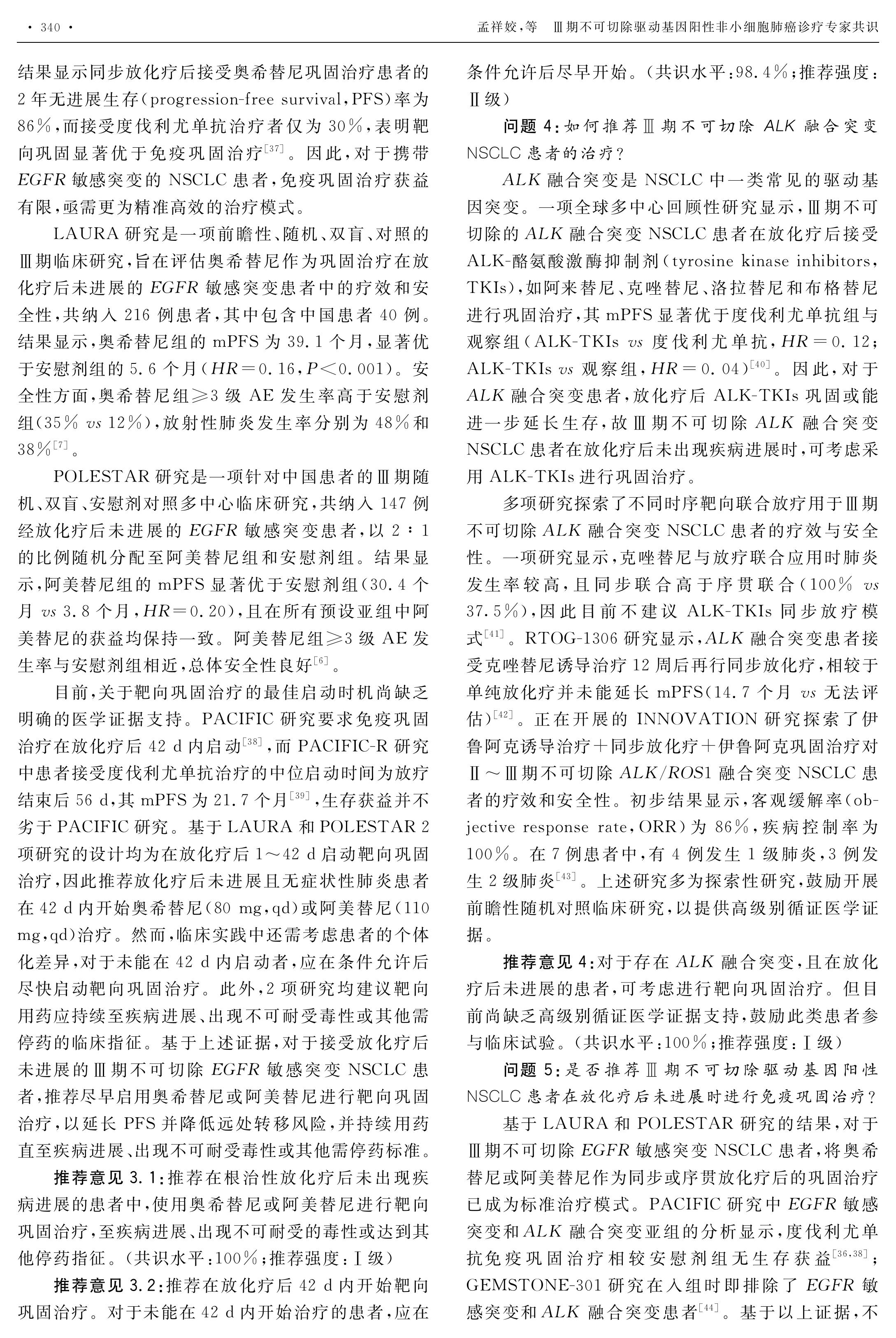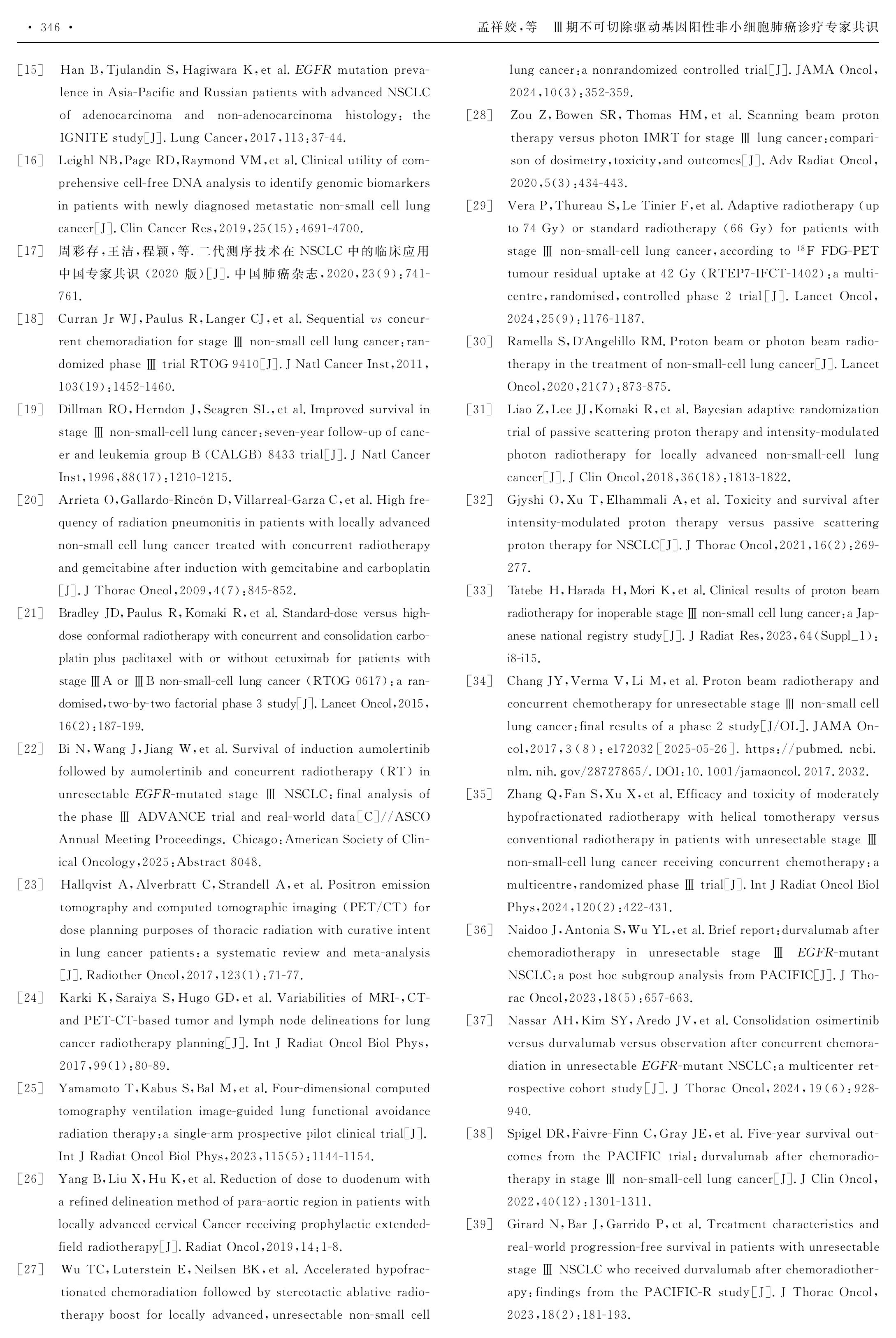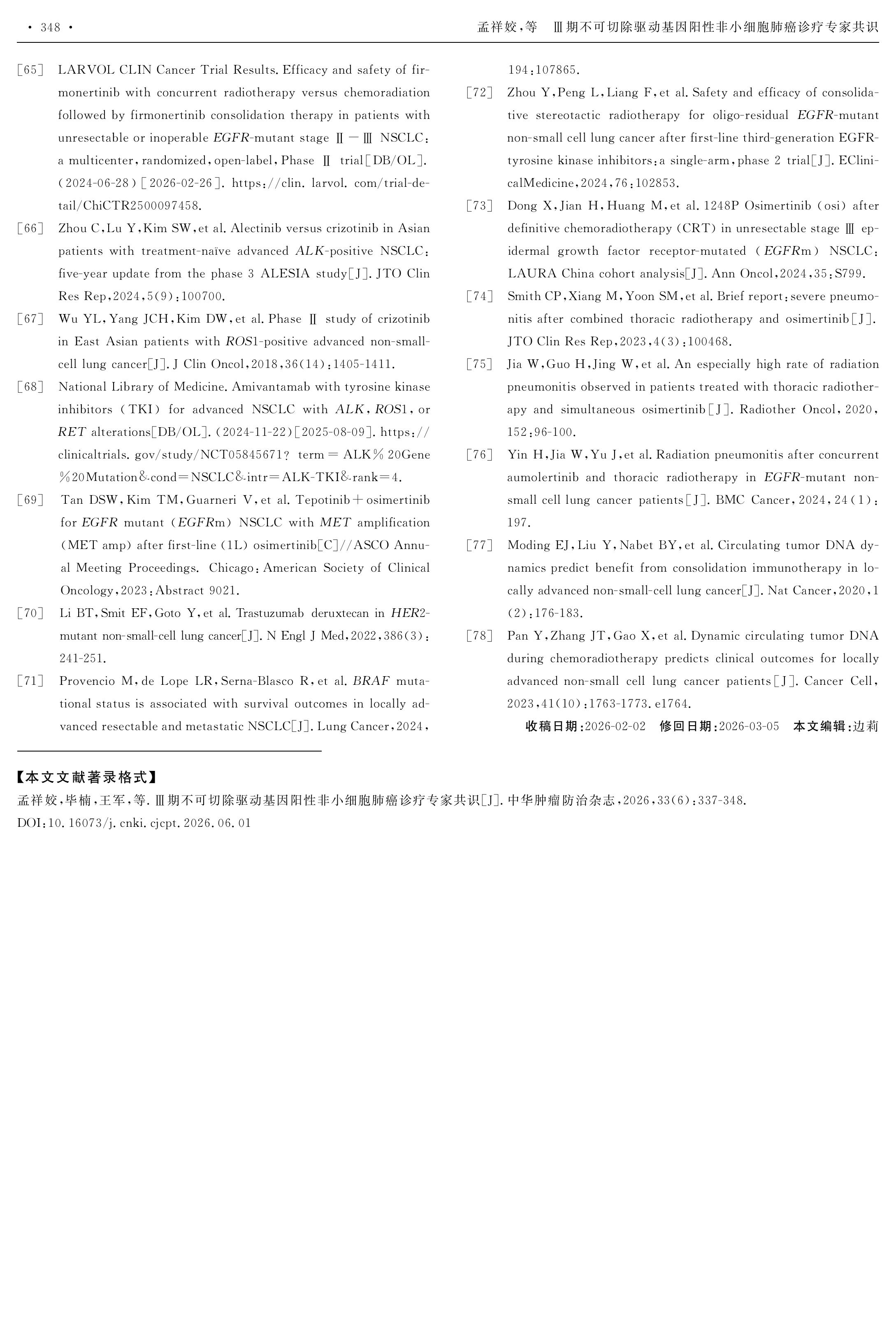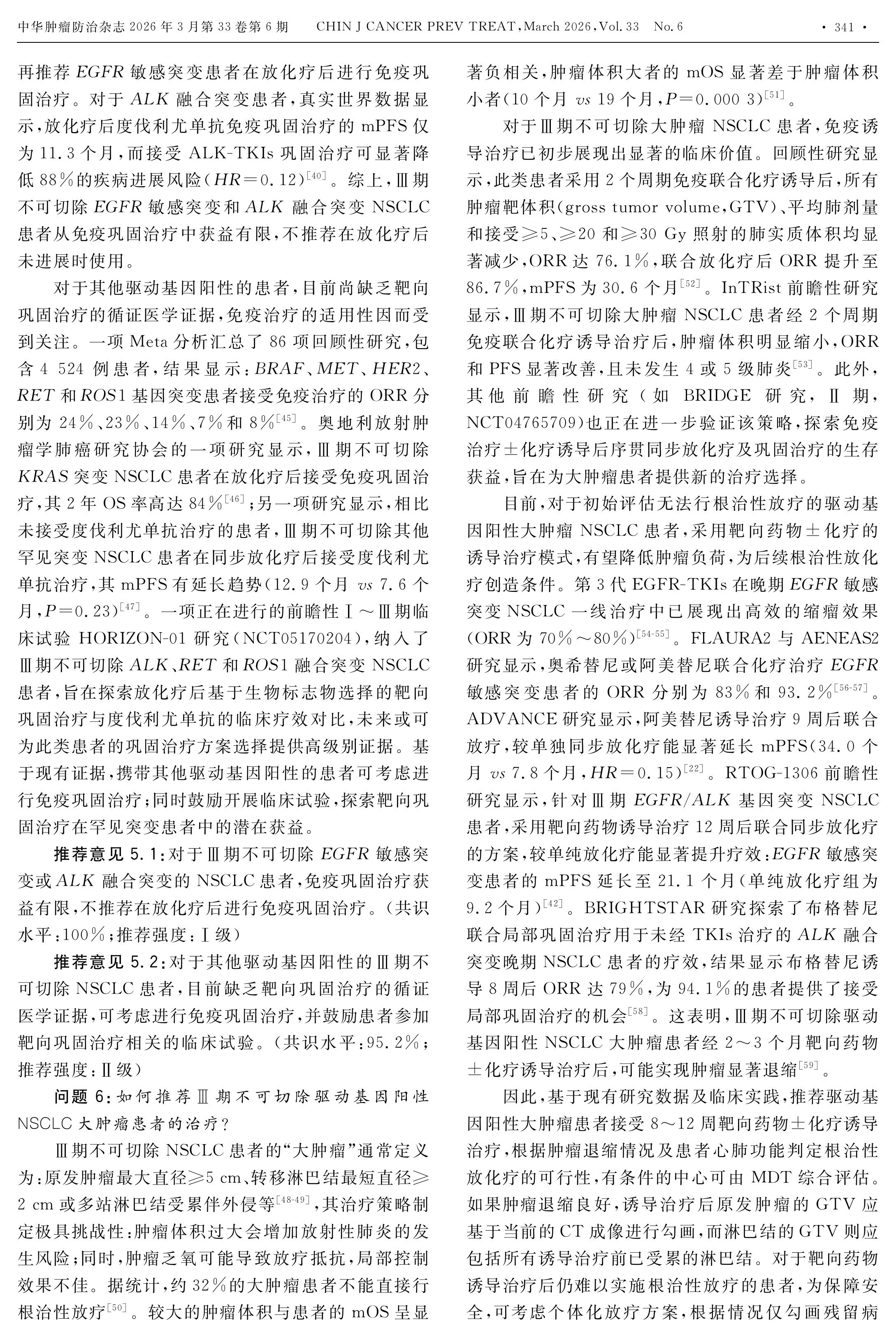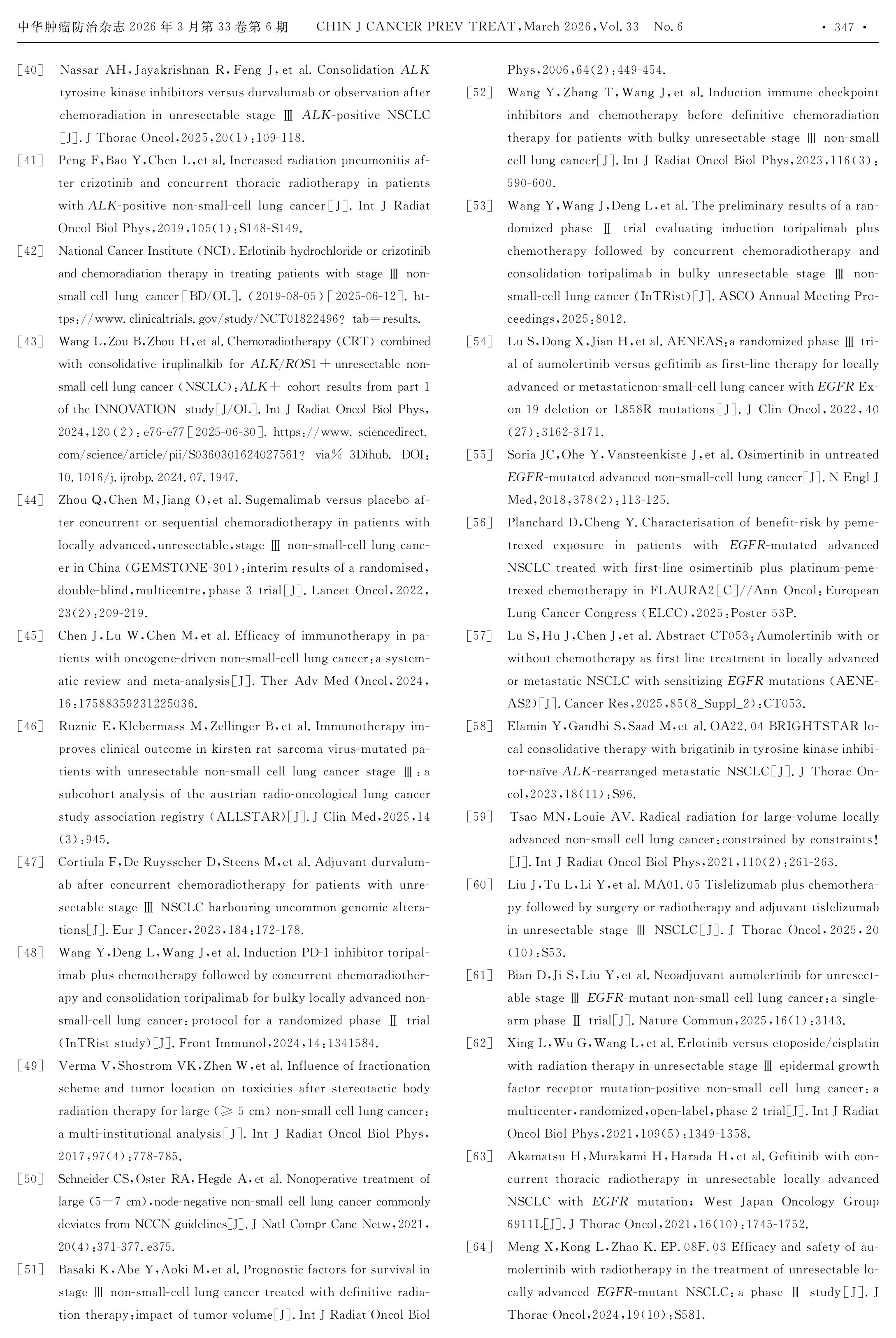 Ⅲ期不可切除驱动基因阳性非小细胞肺癌(NSCLC)具有显著的临床异质性,目前尚未能完全实现基于基因分型的精准治疗。LAURA研究和POLESTAR研究为携带表皮生长因子受体敏感突变的NSCLC患者建立了根治性放化疗后行靶向巩固的标准治疗模式,但对于其他驱动基因阳性(如间变性淋巴瘤激酶融合、ROS原癌基因1重排)的患者,其治疗仍缺乏高级别循证医学证据支持。