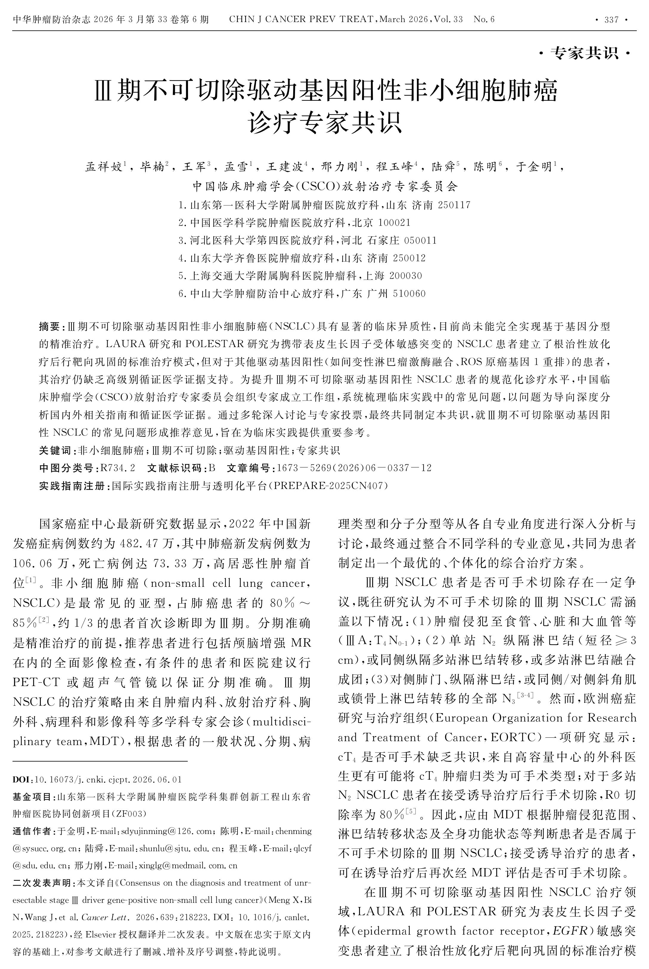 为提升Ⅲ期不可切除驱动基因阳性NSCLC患者的规范化诊疗水平,中国临床肿瘤学会(CSCO)放射治疗专家委员会组织专家成立工作组,系统梳理临床实践中的常见问题,以问题为导向深度分析国内外相关指南和循证医学证据。通过多轮深入讨论与专家投票,最终共同制定本共识,就Ⅲ期不可切除驱动基因阳性NSCLC的常见问题形成推荐意见,旨在为临床实践提供重要参考。