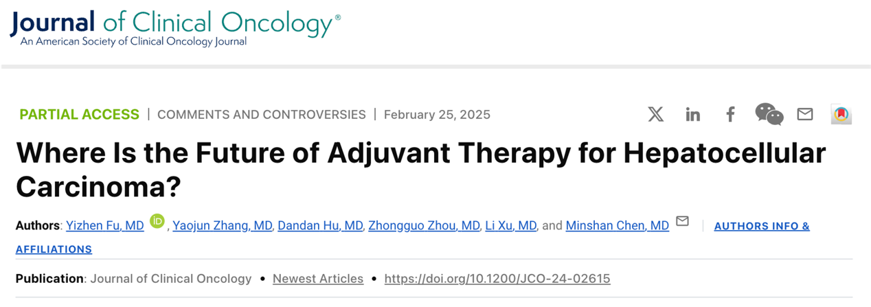 2025年2月25日,中山大学肿瘤防治中心肝脏外科陈敏山、徐立团队在《临床肿瘤学》(Journal of Clinical Oncology)杂志在线发表了题为“肝癌辅助治疗路在何方”的述评(点击文末阅读原文查看),针对肝癌术后辅助治疗这一临床热点进行了深入剖析,在国际肝癌领域传递了中肿之音。
