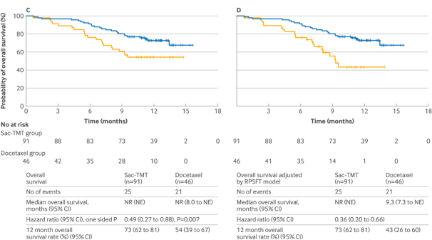 芦康沙妥珠单抗组患者12个月总生存率(一年后仍存活的比例)为73%,显著优于多西他赛组的54%,死亡风险降低了51%。