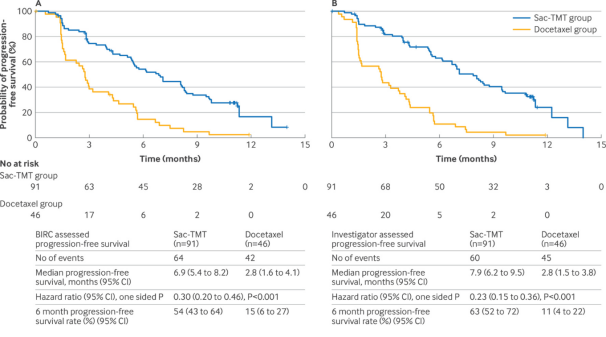 芦康沙妥珠单抗组患者肿瘤未出现恶化或未死亡的时间更长,中位数为6.9个月,多西他赛组为2.8个月。这意味着前者组的患者疾病进展或死亡的风险降低了70%。