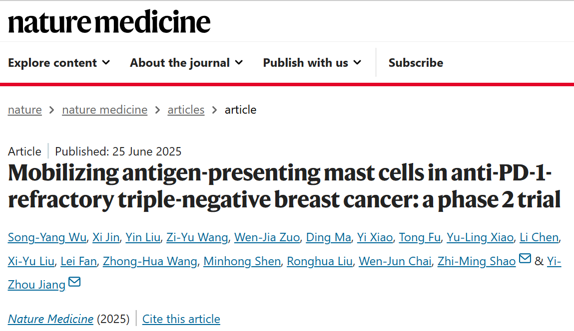 2025年6月25日,复旦大学附属肿瘤医院邵志敏教授、江一舟教授团队在Nature Medicine上发表“Mobilizing antigen-presenting mast cells in anti-PD-1-refractory triple-negative breast cancer: a phase 2 trial”,该研究明确了肥大细胞在肿瘤免疫调控中的关键作用,提出了靶向抗原呈递肥大细胞(apMC)逆转抗PD-1耐药的策略,并强调了反向转化研究框架(临床→基础→临床)在精准免疫肿瘤学中的概念性进展,对临床治疗具有直接指导意义。