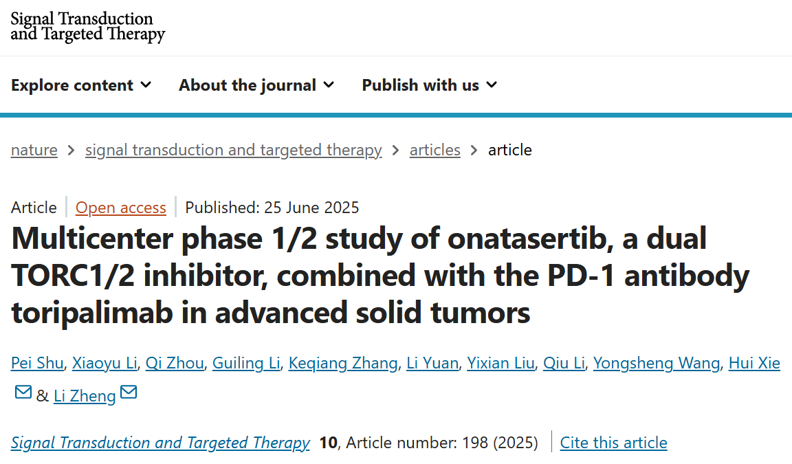 近日,四川大学华西医院临床试验中心郑莉教授团队在Signal Transduction and Targeted Therapy发表文章“Multicenter phase 1/2 study of onatasertib, a dual TORC1/2 inhibitor, combined with the PD-1 antibody toripalimab in advanced solid tumors”。该论文首次揭示了mTORC1/2双重抑制剂Onatasertib联合特瑞普利单抗,在晚期实体瘤特别是宫颈癌中的安全性和初步疗效,为mTOR信号通路抑制剂联合检查点抑制剂治疗作为晚期实体瘤治疗的新策略提供了科学依据。