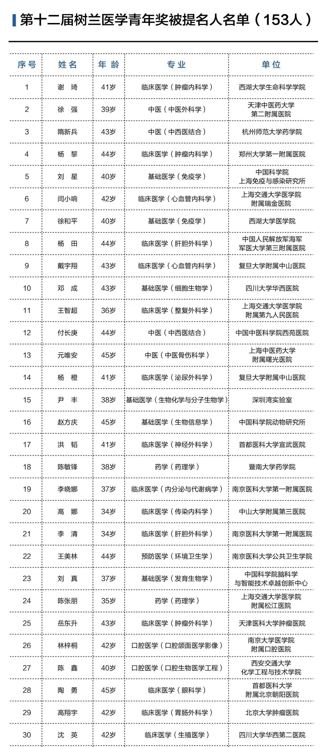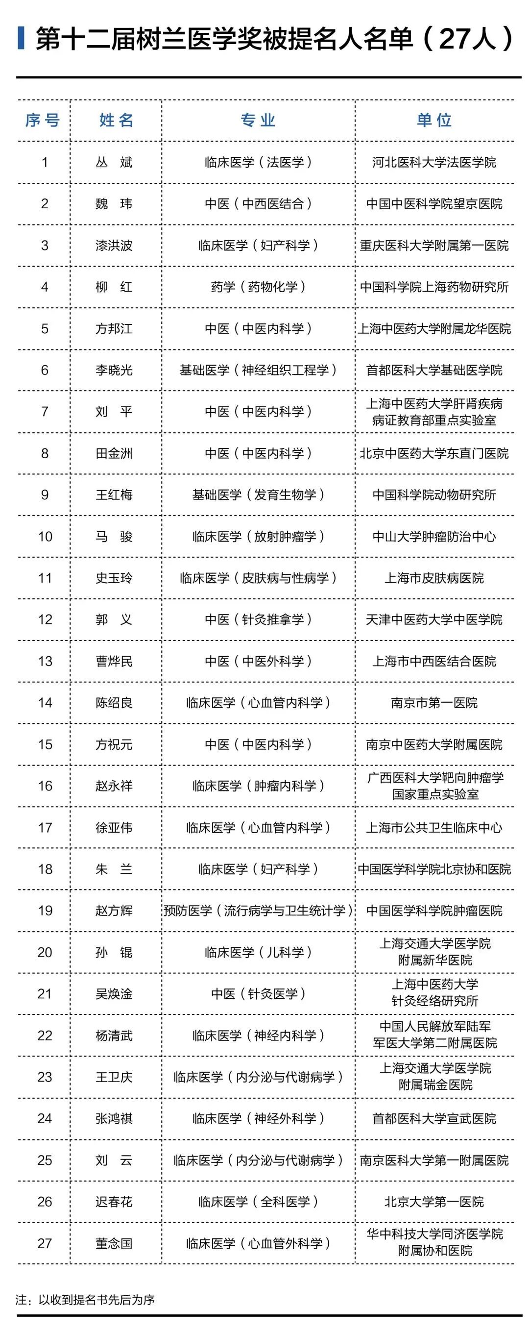 现将第十二届树兰医学奖被提名人名单予以公布。