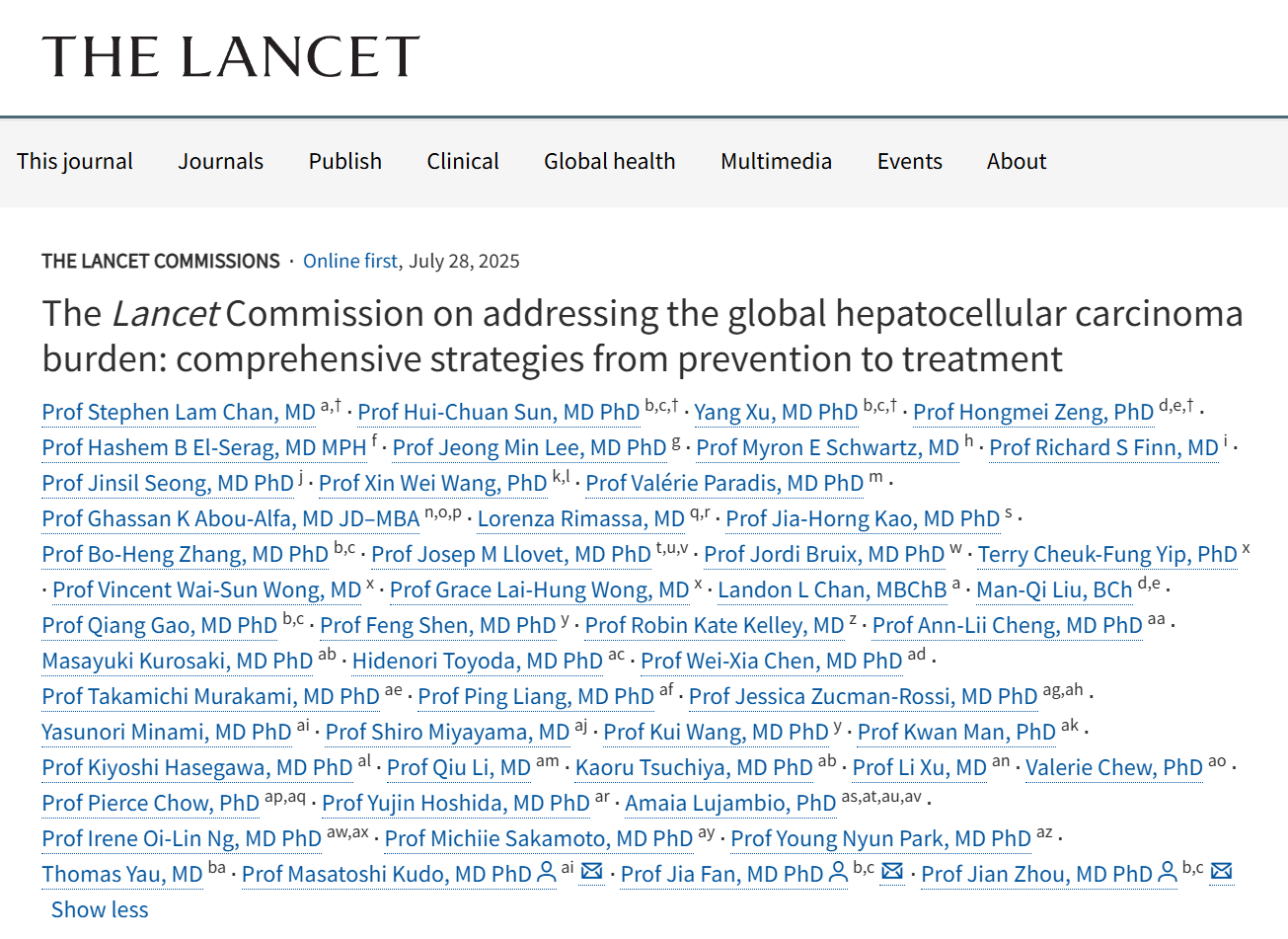 2025年7月28日,复旦大学附属中山医院樊嘉院士、周俭教授作为联合主席,带领来自全球的51位专家,在国际顶尖医学期刊《柳叶刀》(The Lancet)发表了《柳叶刀》肝癌委员会重大报告,题为“The Lancet Commission on addressing the global hepatocellular carcinoma burden: comprehensive strategies from prevention to treatment”。据悉,这是柳叶刀首个,由中国专家领衔的全球临床委员会癌症重大报告。