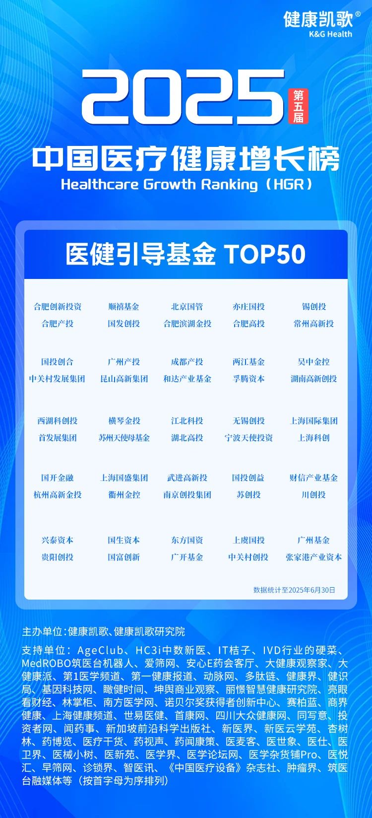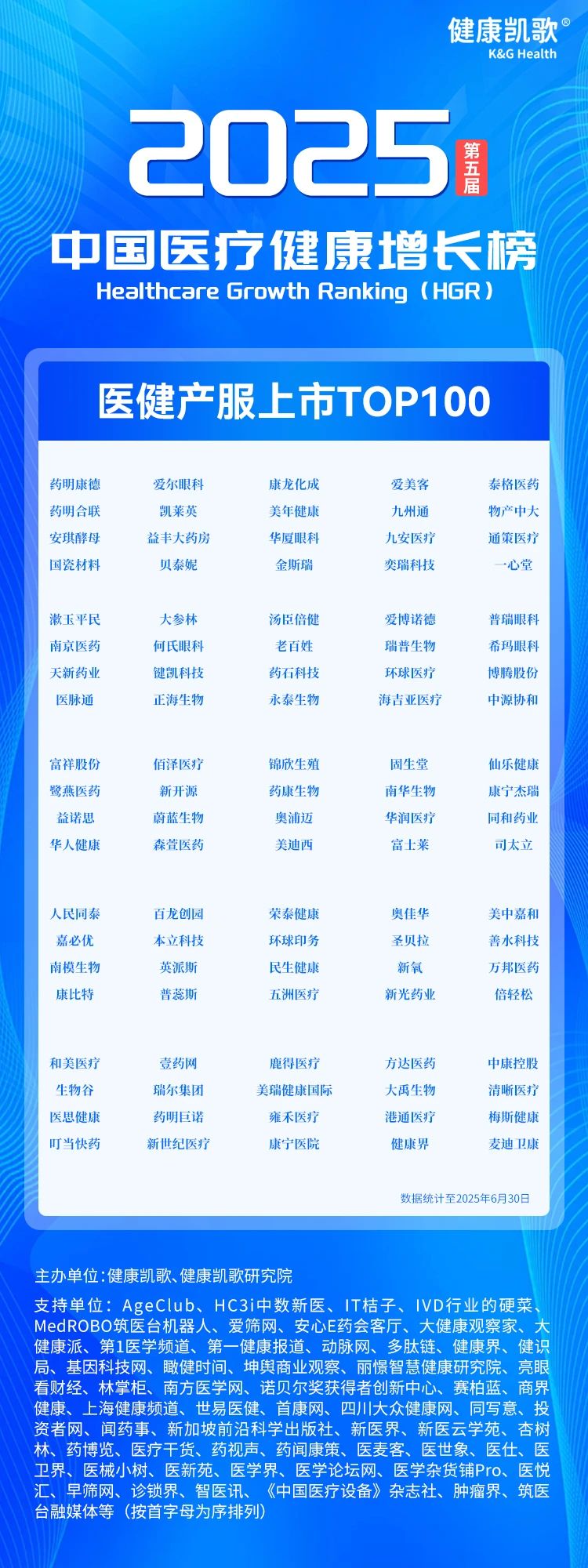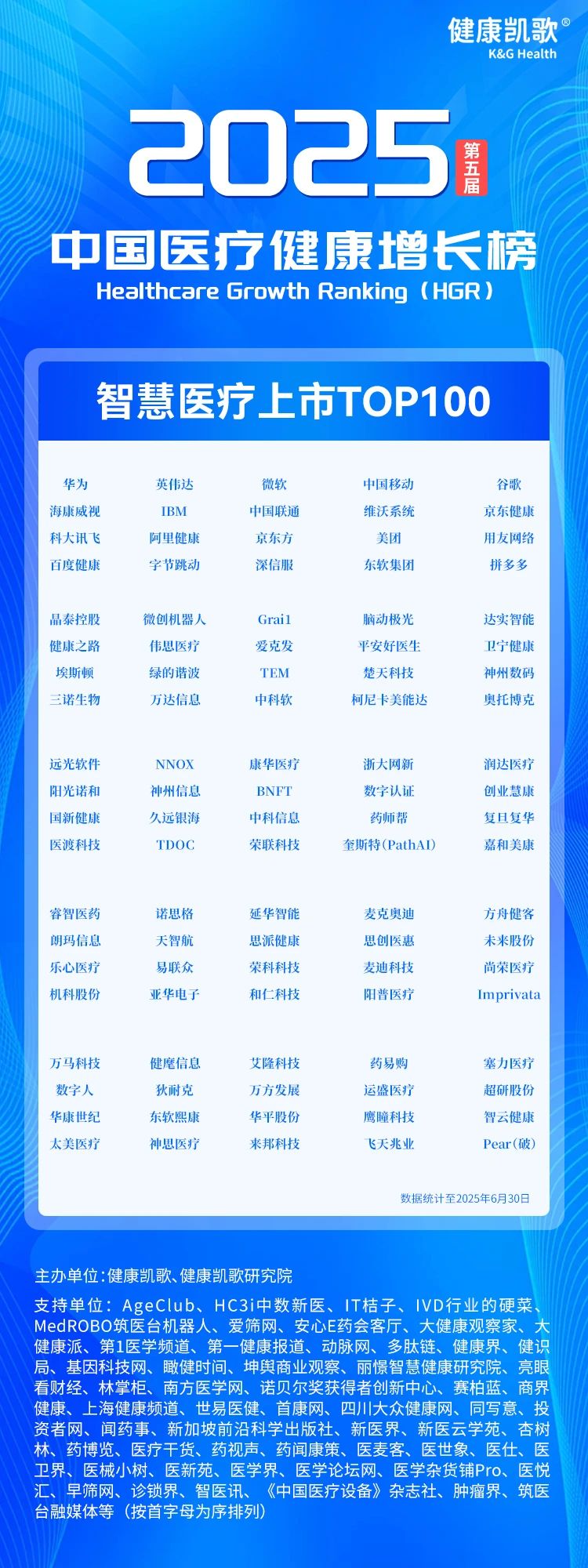 2025年7月29日,由健康凯歌、健康凯歌研究院主办,近百家单位联合发布的2025(第五届)中国医疗健康增长Healthcare Growth Ranking(HGR)榜单重磅揭晓。这不仅是一份榜单,更是一张医疗健康产业发展的活力图谱,一座指引产业升级与价值重构的闪亮航标。