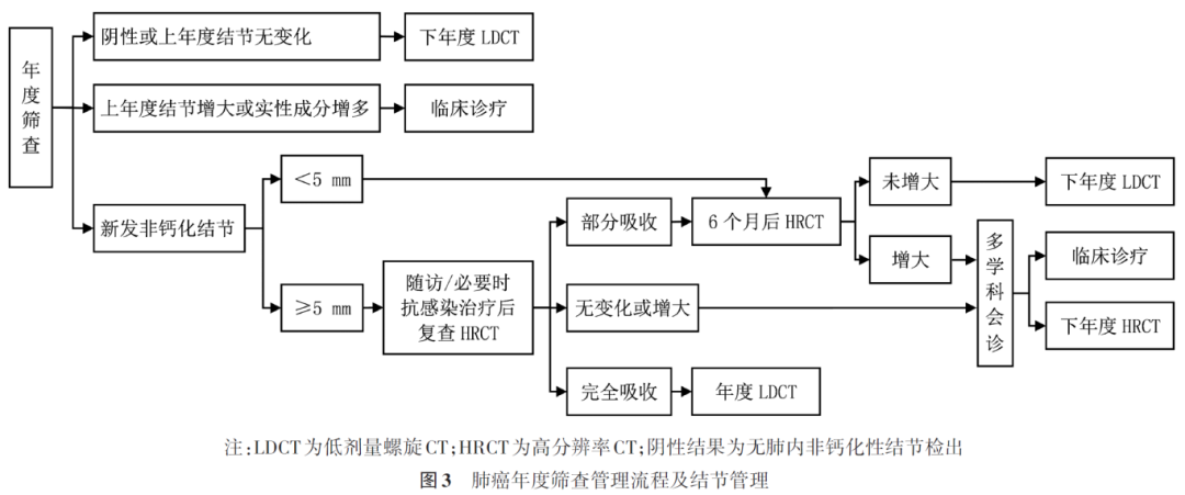 (1)如筛查结果为阴性或上年度检出结节无变化,建议进入下年度LDCT筛查。(2)如上年度检出结节增大或实性成分增多,建议进行临床治疗。(3)检出新发非钙化结节,如结节平均长径<5 mm,建议6个月后复查HRCT,如结节未增大,建议进入下年度筛查;如增大,建议多学科会诊后决定是否进行临床治疗或进入下年度筛查。如结节平均长径≥5 mm,建议随访或必要时抗感染治疗后复查HRCT,如结节完全吸收,建议进入下年度筛查;如结节部分吸收,6个月后复查HRCT,如继续吸收或完全吸收,建议进入下年度筛查;如无变化或增大,建议多学科会诊后决定是否进行临床治疗。
