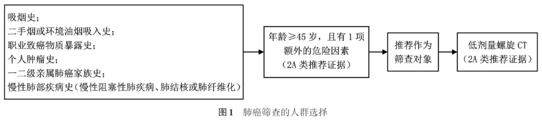 肺癌筛查的获益随着肺癌发病风险的增加而增加,对高危人群进行筛查是目前国内外专家的共识。本指南对于高危人群的选择充分考虑了除年龄外的其他肺癌危险因素,结合中国人群肺癌的发病特点,推荐在符合年龄段的基础上,对含有下列危险因素之一的人群进行肺癌筛查。